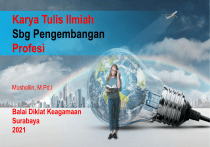 Karya Tulis Ilmiah Sbg Pengembangan Profesi Mushollin, M.Pd.I Balai Diklat Keagamaan Surabaya 2021 Agenda 01 PKB Buku 4, 2019 02 Angka Kredit yang Dipersyaratkan dalam dalam PKB 03 Presentasi Ilimiah dari IV/c ke IV/d 04 KTI dan Angka Kriditnya Publikasi Ilmiah = KTI Ada 10 macam Definisi Kerangka isi Bukti fisik Angka kredit suhardjono 2012 3 1. presentasi di forum ilmiah 2.hasil penelitian (PTK) 3.tinjauan ilmiah 4.tulisan ilmiah populer 5.artikel ilmiah 6.buku pelajaran 7.modul/diktat 8.buku dalam bidang pendidikan 9.karya terjemahan 10.bukupedoman guru Buku 4 suhardjono 03 2012 4 Tabel 1. Jumlah Angka Kredit yang Dipersyaratkan suhardjono 03 2012 5 Presentasi Ilmiah bagi Guru Madya IV/c ke IV/d Dengan Ketentuan: 1 2 3 memiliki 5 (lima) angka kredit dari subunsur pengembanga n diri dan 14 (empat belas) angka kredit dari subunsur publikasi ilmiah Presentasi ilmiah dilakukan secara terbuka di hadapan Tim Penilai Tkt, Pusat, akademisi, dan pejabat terkait Ringkasan perolehan persyaratan 5 angka kredit dari subunsur PD dan 14 angka kredit dari subunsur PI dan/atau KI 4 tim penilai menetapkan kelayakan yang bersangkuta n untuk naik jabatan dari Guru Madya ruang IV/c ke Guru Utama ruang IV/d. Jumlah Angka Kredit Karya Bersama Karya yang dihasilkan secara bersama, dilaksanakan maksimum oleh 4 (empat) orang guru, yang terdiri dari penulis utama dan penulis pembantu. Jumlah penulis pembantu paling banyak 3 (tiga) orang. Lebih dari 4 (empat) orang maka urutan penulis ke 5 (lima) dan seterusnya tidak mendapat angka kredit. Jenis PI /KI yang Diperlukan untuk Setiap Kenaikan Jenjang Kepangkatan 9 Lanjutan …… 10 KEGIATAN PKB DALAM PENGEMBANGAN PROFESI GURU 1. Pengembangan diri (PD) 2. Publikasi Imiah (PI) 3. Karya Inovative (KI) 11 12 Pengembangan Diri Pengembangan diri adalah upaya untuk meningkatkan profesionalisme diri agar memiliki kompetensi yang sesuai dengan peraturan perundang-undangan atau kebijakan pendidikan nasional serta perkembangan ilmu pengetahuan, teknologi, dan/atau seni 13 1. Pendidikan dan Latihan Fungsional dan Teknis Pendidikan dan pelatihan (diklat) fungsional adalah upaya peningkatan kompetensi guru dan/atau pemantapan wawasan, pengetahuan, sikap, nilai, dan keterampilan yang sesuai dengan profesi guru yang bermanfaat dalam pelaksanaan tugas guru melalui lembaga yang memiliki ijin penyelenggaraan dari instansi yang berwenang 14 15 Bukti Fisik dalam PAK 1. FC Surat Tugas 2. FC Sertifikat Fotokopi surat tugas dari kepala Sekolah atau atasan langsung, atau instansi lain yang terkait yang telah disahkan oleh kepala sekolah atau atasan langsung telah disahkan oleh kepala Sekolah sedangkan bagi kepala sekolah disahkan oleh dinas pendidikan sebagai atasan langsung terkait dengan keikutsertaannya 3. Laporan hasil pelatihan dibuat oleh guru yang bersangkutan terkait dengan keikutsertaan kegiatan pengembangan diri Lampiran 1 16 2. Kegiatan Kolektif Guru. Kegiatan kolektif guru adalah kegiatan guru dalam mengikuti kegiatan pertemuan ilmiah atau mengikuti kegiatan bersama yang dilakukan guru baik di sekolah maupun di luar sekolah (seperti KKG/MGMP, KKKS/MKKS, asosiasi profesi guru lainnya) yang bertujuan untuk meningkatkan keprofesian guru yang bersangkutan 17 Kegiatan kolektif Guru Mengikuti lokakarya atau kegiatan di kelompok/ musyawarah kerja guru. 1 2 Sebagai pembahas atau peserta dalam seminar, koloqium, diskusi panel, atau bentuk pertemuan ilmiah lainnya Dalam 1 tahun, guru diwajibkan mengikuti kegiatan KKG/MGMP paling sedikit 12 kali pertemuan Mengikuti in house training (< 30 jam) di sekolah untuk penyusunan perangkat kurikulum dan/atau kegiatan pembelajaran berbasis TIK dll. . 3 4 5 Mengikuti kegiatan kolektif lainnya yang sesuai dengan tugas dan kewajiban guru terkait dengan pengembangan keprofesiannya. Paket kegiatan guru di KKG/MGMP dlm 1 tahun dapat berupa: 1. Paket Pengembangan Silabus, RPP, Bahan Ajar perlu minimum 3 kali pertemuan = 0.15 2. Paket Pengembangan Instrumen Penilaian perlu minimum 3 kali pertemuan = 0.15 3. Paket Pengembangan Model-model pembelajaran dan Jurnal Belajar perlu minimum 3 kali pertemuan = 0.15 4. Paket Pembuatan/Pengembangan Alat Peraga perlu minimum 3 kali pertemuan = 0.15 5. Paket Pengembangan Karya Ilmiah Guru (PTK/ Tinjauan lmiah / Buku / Modul / Diktat / Kajian Buku/ karya terjemahan / karya seni / karya teknologi) perlu minimal 4 kali pertemuan = 0.15 19 Contoh … Untuk mendapatkan AK, setiap paket yang diambil oleh KKG/MGMP atau guru adalah paket minimal dan kelipatannya. Misalnya, apabila kegiatan KKG/MGMP Kota Bangil dalam 1 tahun merencanakan 4 paket kegiatan angka 1), 2), 3), dan 4) yang memenuhi kriteria minimal 3 kali pertemuan sebagaimana tersebut di atas, maka setiap guru yang aktif akan memperoleh AK sebesar 4 x 0.15 = 0.60. 20 Bukti Fisik Kegiatan Keikutsertaan guru dalam kegiatan kolektif guru harus dibuktikan dengan bukti fisik sebagai berikut. a. Fotokopi surat tugas dari kepala sekolahatau instansi lain yang terkait, yang telah disahkan oleh kepala sekolah. Apabila penugasan bukan dari kepala sekolah, harus disertai dengan surat persetujuan mengikuti kegiatan dari kepala sekolah. b. Laporan untuk setiap kegiatan yang diikuti dibuat oleh guru yang bersangkutan, disajikan dengan kerangka isi sebagaimana tersebut dalam Lampiran 2. 21 22 B. Publikasi Ilmiah 1. Presentasi pada Forum Ilmiah 1) Menjadi pemrasaran/nar asumber pada seminar atau lokakarya ilmiah. Ak 0.2 2) Menjadi pemrasaran/nar asumber pada koloqium atau diskusi ilmiah. AK 0,2 2. Publikasi Ilmiah Berupa Hasil Penelitian atau Gagasan Ilmiah Bidang Pendidikan Formal a. Laporan Hasil penelitian diterbitkan/ dipublikasikan dalam bentuk buku ber-ISBN dan telah mendapat Pengakuan BSNP disusun menjadi artikel ilmiah dipublikasikan dalam majalah ilmiah/jurnal ilmiah telah diseminarkan di sekolahnya dan disimpan di perpustakaan Jenis Laporan Hasil Penelitian 2) Bukti fisik yang dinilai 1. Bukti Fisik Buku asli atau fotokopi yang menunjukkan keterangan nama penerbit, tahun