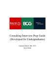 Consulting Interview Prep Guide (Developed for Undergraduates) Updated March 26th, 2021 Kyle Schott 1 Table of Contents I. II. Introduction and Overview - Pg. 2 Timeline - Pg. 3 III. Networking - Pg. 4 IV. Understanding What a Case is - Pg. 5 V. VI. VII. VIII. IX. Building Skills - Pg. 6 Practicing Cases - Pg. 7 Preparing for Fit Interviews - Pg. 8 Crafting Resume/Cover Letters and Submitting Applications - Pg. 9 Conclusion - Pg. 10 2 Introduction and Overview Due to the COVID-19 pandemic, I was able to spend a ton of time preparing for my consulting interviews during the months leading up to recruiting. However, I realize most future applicants will not have a whole summer of sitting inside to endlessly prepare for interviews. That said, I built this guide so future applicants do not have to spend hours searching the internet for the best resources and instead can spend their time actually preparing. To give a broad overview, this guide starts with a preparation timeline based on my process (I will not claim this is a perfect timeline or that others are incorrect, but this timeline worked for me). After that timeline, I will include a section discussing each of the steps in the timeline. In each of these segments, I will cover the goal of the step being discussed, specific tips and tricks, and the resources I found best for that step. I hope this guide helps you land a position at your target firm, but, even if it does not, the skills learned in preparing for consulting interviews are valuable in any business context. NOTE: MANY RESOURCES IN THIS DOCUMENT ARE IN READ-ONLY GOOGLE FILES. DOWNLOAD THE FILE TO YOUR GOOGLE DRIVE TO EDIT. 3 Timeline Networking - Begin five months before interviews and continue up to interviewing Understand what a case is - Do this between five and four months before your first interview Building skills - Do this between four and three and a half months before your first interview Practice Cases - Start as soon as you understand what a case is and continue until first interview Fit interview prep - Begin two months before your first interview Craft Resume/Cover Letters and Submit Applications - Craft your resume and cover letters over the month leading up to submitting applications (due dates vary by firm) 4 Networking Goal: The goal of networking is two-fold; get your name noticed by firms before formal recruiting starts and gain an understanding of each firm’s unique culture. Tips and Tricks: ● Focus on cultural fit ○ A BCG manager once told me, “the top firms do mostly the same work, the differences in culture are what set us apart”. Not only will understanding culture help you find the right firm for you, but it will help you shine in the fit interview. ● Drive the discussion ○ In nearly all cases, you will be the one who reaches out first, so it is expected that you will control the dialogue and have questions ready. ● Start the conversation with an overview of your background ○ This makes conversation/connections happen and sets the stage for the consultant to answer your questions. ● Reach out on LinkedIn ○ You can use the search filters to find people at a firm from your school and then send them a connection request with a note asking to talk. In terms of reply rate, you will get the best results from reaching out to Associates/Analysts. ● Attend the informational/coffee chat/networking events that firms put on ○ You can usually RVSP for these on the firm’s website or on your school’s career page. They are a great way to learn about firms and show your interest. Resources: 1. Networking Tracking Spreadsheet a. Use this spreadsheet to track your networking. If you add the date of the planned conversation in the “conversation date column” it will color yellow if it is in the future, red if it is today, and green if it has passed. Also, if you type the names of firms you are networking with into the firm column on the table on the right, it will keep count of the number of calls you have had with that firm. 2. Consulting Informational Interview Questions a. This is a sheet of questions I used in most of my informational interviews. I did not just read them in order, I started with one or two and then drove the conversation from there -- conversation is better than canned Q&A. 5 Understanding What a Case is Goal: The goal of this step is exactly what it sounds like. By the end of this step you should understand the flow of a case, the goal of a case interview, and have a basic understanding of what is involved in completing a case interview. Tips and Tricks: ● Read Case Interview Secrets by Victor Cheng ○ This book is not perfect (the shoutouts of his products get frustrating and the idea that you can solve any case with two cookie-cutter frameworks is flawed, in my opinion), but it does give a very solid overview of the flow of a case. His format for opening and closing cases is very good as well. ● Watch case interviews from YouTube ○ A quick Google search can get you some solid results but I will include some examples in the resources section. Resources: 1. Case Interview Secrets a. The only thing for interview prep I recommend buying. 2. Case Interview Videos a. This article has nine videos that are some of the best I have seen. 6 Building Skills Goal: This is a step a lot of people skip or just do not do because they start preparing too late. The goal here is to develop strong skills in each aspect of the case, so you do not develop bad habits while practicing cases. Case interviews are a great example of “practice doesn’t make perfect, perfect practice makes perfect”. Tips and Tricks: ● Take your time ○ If you spend lots of time on this step, your casing skills will be much better from the jump and you will improve much faster. It truly pays dividends. ● Do the free Crafting Cases course ○ PLEASE DO THIS! This is the one thing that took my casing to the next level. If you want to have MBB inter
