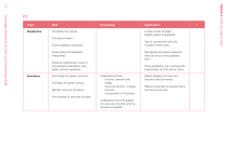 Cambridge International AS and A Level Mathematics 9709 Topic Skill Quadratics Complete the square Knowledge Application Locate vertex of graph Sketch graph of quadratic Find discriminant Use in connection with the number of real roots Solve quadratic equations Solve linear and quadratic inequalities Recognise and solve equations that can be put into quadratic form Solve by substitution a pair of simultaneous equations one linear and one quadratic Functions Find range of a given function Find fg(x) for given f and g Identify one-one functions Solve problems, e.g. involving the intersection of a line and a curve Understand terms: function, domain and range one-one function, inverse function composition of functions Find inverse of one-one function Understand how the graphs of a one-one function and its inverse are related Sketch graphs of a one-one function and its inverse Restrict a domain to ensure that a function is one-one 9 Section 4: What you need to know 14 P1 Topic Skill Knowledge Application Coordinate geometry Given end points of a line: find the length find the gradient find the mid-point Gradients of parallel lines are equal Use these relationships in solving problems Perpendicular gradients: m1m 2 = –1 Interpret and use linear equations Find equation of a line, e.g. using 2 points on it, or 1 point and the gradient Know the forms y = mx + c and y – y1 = m(x – x1) Understand the relationship between a graph and its equation Convert between radians and degrees Definition of a radian Solve problems that relate points of intersection of graphs to solution of equations (including the correspondence between a line being a tangent to curve and an equation having a repeated root) Solve problems involving arc lengths and areas of sectors and segments Use formulae s = r θ and A = ½r2 θ to calculate arc length and sector area 15 Section 4: What you need to know Cambridge International AS and A Level Mathematics 9709 Circular measure 9 Cambridge International AS and A Level Mathematics 9709 Trigonometry Skill Knowledge Application Sketch and recognise graphs of the sine, cosine and tangent functions (angles of any size, degrees or radians) Know exact values for sin, cos, tan of 30º, 45º, 60º Use trigonometric graphs Solve trig equations giving all solutions in specified interval Understand notation sin –1x, cos –1x, tan –1x as denoting principal values Identities: sinθ cosθ Use exact values of related angles e.g. cos 150º Use these identities, e.g. to prove other identities or to solve equations = tanθ sin² θ + cos² θ = 1 Vectors Add and subtract vectors, and multiply a vector by a scalar Find magnitude of a vector and the scalar product of two vectors Standard vector notations Geometrical interpretation Meaning of terms: unit vector displacement vector position vector Use scalar products to find angles and to solve problems involving perpendicular lines 9 Section 4: What you need to know 16 Topic Topic Series Skill Knowledge Expand (a + b)n for positive integer n Notation n! and Find: nth term of AP sum of AP nth term GP sum of GP sum to infinity of convergent GP Differentiation () n r Condition for convergence of GP Understand gradient of a curve Notation dy d 2 y , , f l (x), f m (x) d x dx 2 Evaluate definite integrals Apply differentiation to: gradients tangents and normals increasing/decreasing functions connected rates of change Use information about stationary points to sketch graphs Find stationary points and identify maximum/minimum Integrate (ax + b)n (rational n ≠ –1) together with constant multiples, sums and differences. Use AP and/or GP formulae in solving problems Recognise APs and GPs Use the chain rule on composite functions Integration 9 Integration as reverse differentiation Use integration to solve problems involving finding a constant of integration Solve problems involving: area under a curve area between two curves volume of revolution about one of the axes 17 Section 4: What you need to know Cambridge International AS and A Level Mathematics 9709 Differentiate xn for rational n, together with constant multiples, sums and differences of functions Application Cambridge International AS and A Level Mathematics 9709 Topic Skill Logarithmic and exponential functions Application Content of unit P1 is assumed, and may be required in solving problems on P2 topics Assumed knowledge Algebra Knowledge Solve modulus equations and inequalities, including use of: |a| = |b| ⇔ a 2 = b 2 |x – a| < b ⇔ a – b < x < a + b Meaning of |x| Carry out algebraic polynomial division Factor and remainder theorems Solve equations of form ax = b and corresponding inequalities Relationship between logarithms and indices Use of laws, e.g. in solving equations Laws of logarithms Use graphs of ex and ln x Definition and properties of ex and ln x Transformation to linear form, and use of gradient and intercept Meaning of quotient and remainder Use in finding factors, solving polynomial equations, finding unknown coefficients etc 9 Section 4: What you need to know 18 P2 Topic Skill Trigonometry Differentiate ex and ln x, sin x, cos x and tan x, together with constant multiples, sums, differences and composites Application The sec, cosec and cot functions and their relationship to cos, sin and tan Use properties and graphs of all six trig functions for angles of any magnitude Identities: sec² θ = 1 + tan² θ cosec² θ = 1 + cot² θ Expansions of: sin(A ± B) cos(A ± B) tan(A ± B) Formulae for: sin 2A cos 2A tan 2A Use of these in evaluating and simplifying expressions, and in solving equations, including expressing a sin θ + b cos θ in the forms R sin(θ ± α) and R cos (θ ± α) 9 Applications of differentiation include all those in unit P1 Differentiate products and quotients Parametric differentiation Implicit differentiation 19 Section 4: What you need to know Cambridge International AS and A Level Mathematics 9709 Differentiation Knowledge Cambri