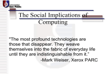 The Social Implications of Computing "The most profound technologies are those that disappear. They weave themselves into the fabric of everyday life until they are indistinguishable from it.” -Mark Weiser, Xerox PARC Computer Contributions to Society • • • • • E-mail Instant Messaging The Web Cellular Phones Video Games Social Implications of Networked Communications Estimated Users on the 'Net as of March 2018 • • • • • • • • 199.6 million in the US and Canada 108.17 million in Europe 106.77 million in Asia 90.63 million in South America 8.14 million in Africa 6.88 million in Middle East Almost 515 million Doubles every year The Internet as a Communications Medium • • • • • • • Electronic Publications Library Archives Newsgroups Email Advertisements News P2P networks Public Spheres Prior Networked Communication: • Town Hall • Church • Town Square Ensuing Networked Communication: • Television • Newsgroups • Online Polls Virtual vs. ‘Real’ Resources • Online courses • Email • Research using search engines • Class discussion • Having coffee with a friend • A book which is primary source written by an expert in the field Globalization vs. Isolation • Share ideas with the world • Buy anything from anywhere, regardless of location • Connect with anyone in the world using 2 of your senses But will be taken with a grain of salt Without experiencing any culture outside the computer room As opposed to meeting in person and communicating on all 5 Cons • • • • • Copyright infringement Addiction Loss of social skill Insecurity Desensitization Conclusion • Great tool if not taken out of context Growth of, Access to, and Control of the Internet Extreme Growth 10 9 8 7 6 5 4 3 2 1 0 1971 1983 2003 2050 Computers on the ARPA/ Internet (in thousands) Year 1971 1983 2013 2050 Number of computers 25 1000 33000 (projection) Who knows? Growth of the internet • ARPANET - started by DoD to research networks (1969) • December 2012 - 26 million users • Current: – According to Nielson • 580 million people worldwide now have access to the internet • 168.6 million attributed to the U.S The Top Five Most Popular Internet Activities (Percent Of Internet Users) 1. 2. 3. 4. 5. E-mail and instant messaging 87.9% Web surfing or browsing 76.3% Buying online 48.9% Finding entertainment information 47.9% Reading news 47.6% (data from 2010) – Email usage has doubled in past three years • 60 90 billion messages a year • Another doubling expected by 2015 Who controls the internet • Cyber crime defined – The dissemination of racist and xenophobic material through computer systems • Governments – Citizens must use state-run ISPs in some countries • Blocked content Who controls the internet (cont’d) • Parents and Employers – Cyber nanny • Disallows graphic or violent images – PICS • Platform for Internet Content Selection • Labels that discuss a sites content Access to the Internet • 72.3% of Americans use the net – Others do not for lack of access • Not disinterest • Men & Women – Approx the same 74-70% • Income and educational difs – PhDs >85% >$100k = 10 hrs vs. – High school 60% vs. <$30k = 4hrs Here to stay • More people are using it daily • Look forward to equal access… After all, the Internet is for everyone (RFC 3721) Gender related Issues of Computing Personal Experience • I was too quick to judge. • Stereotyped. • Can such a biased stereotype be justified? Is there a Gender Gap? • After analyzing more than 1,000 research studies, the American Association of University Women (AAUW) has concluded that when it comes to technology, there is an alarming gender gap. Statistics • US population of men and women is 50:50. • Tech jobs are growing every year. • However women represent only 20% of the Computer science and engineering labor force. Where are all the Women? So What? “The gender gap in computer science must be eliminated for two reasons. (1) The more obvious reason is to ensure that fair and equal treatment is being provided to all potential and current computer scientists. (2) The less considered danger of the gender gap concerns the advancement of the field as a whole. By hindering half of the population as potential contributors, the field of computer science decreases its chance of further development.” Quoted from: http://www.expage.com/page/genderissues3 Angles • Male-Dominated Environment -Are women being elbowed out? • Discrimination -HR playing favoritism? • Image of Computing -Nerdy/Bad Stereotypes • Lack of Adequate High School/College Preparation -Do teachers encourage/discourage females to pursue tech jobs? • Societal Implications -Games -Role models Lack of Adequate High School/College Preparation • According to a study by the Research Foundation for Improving the Representation of Women in the Technology Workforce, the number of women who received CS bachelor's degrees, the number peaked in 1986 when women represented approximately 36% of the total number of graduates. Since then numbers have only declined! • “The gender gaps we see are evidence that public schools are failing to fully prepare girls for the 21st century”. • Concerned and embarrassed that women account for only 15 to 20 percent of their computer science majors, a number of top colleges are looking for ways to attract more women to careers in computers. They are adding courses that appeal to women's strengths, creating mentoring programs and thinking harder about the gender gap. Societal Implications - Childhood Development? The Association for Computing Machinery's Committee on Women in Computing (ACM-W) have found that: • Role Models? – “Fathers are more likely to be using computers in the home than mothers so you have the element of the role model”. • Self-confidence? - boys “exhibit higher computer self-confidence and a more positive at