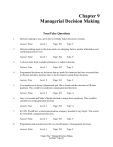 Chapter 9 Managerial Decision Making True/False Questions 1. Decision making is easy, given that everybody makes decisions everyday. Answer: False 2. Level: 1 Page: 302 Type: F Level: 2 Page: 303 Type: F Level: 2 Page: 303 Type: A Level: 3 Page: 303 Type: A In 1999, WorldCom, a telecommunications company, decided to buy Skytel. This would be considered a programmed decision. Answer: False 8. Type: F Gary’s Groceries and Mike’s Market decided to merge their operations. This would be considered a nonprogrammed decision. Answer: True 7. Page: 302 Two employees in Jessie’s department quit. She is faced with the decision to fill these positions. This would be considered a nonprogrammed decision. Answer: False 6. Level: 1 Programmed decisions are decisions that are made for situations that have occurred often in the past and allow decision rules to be developed to guide future decisions. Answer: True 5. Type: F A choice made from available alternatives is called a decision. Answer: True 4. Page: 302 Decision-making must not be done amid ever-changing factors, unclear information, and conflicting points of view. Answer: False 3. Level: 1 Level: 2 Page: 303 Type: F Programmed and structured are the two classifications of management decisions. Answer: False Level: 1 Page: 303 Type: F Chapter Nine * Managerial Decision Making Test Bank * Page 241 9. Uncertainty means that a decision has clear-cut goals, and that good information is available, but the future outcomes associated with each alternative are subject to chance. Answer: False 10. Type: F Level: 1 Page: 305 Type: F Level: 1 Page: 306 Type: F Level: 2 Page: 306 Type: F Level: 2 Page: 307 Type: F Level: 2 Page: 308 Type: F Satisficing behavior occurs when we choose the first solution alternative that satisfies minimal decision criteria regardless of whether better solutions are expected to exist. Answer: True 18. Page: 305 Normative decision theory recognizes that managers have only limited time and cognitive ability and therefore their decisions are characterized by bounded rationality. Answer: False 17. Level: 2 The political model represents an "ideal" model of decision making that is often unattainable by real people in real organizations. Answer: False 16. Type: F Normative means it defines how a decision maker should make decisions. Answer: True 15. Page: 305 The classical decision making model assumes that the decision-maker is rational, and makes the optimal decision each time. Answer: True 14. Level: 2 Ambiguity refers to a situation where the goals to be achieved or the problem to be solved is unclear, alternatives are difficult to define, and information about outcome is unavailable. Answer: True 13. Type: F Uncertainty is by far the most difficult decision situation. Answer: False 12. Page: 304 The main difference between risk and uncertainty is that with risk you know the probabilities of the outcomes. Answer: True 11. Level: 2 Level: 1 Page: 308 Type: F Intuition is a quick apprehension of a decision situation based on past experience but without conscious thought. Chapter Nine * Managerial Decision Making Test Bank * Page 242 Answer: True 19. Level: 1 Page: 310 Type: F Level: 2 Page: 310 Type: F Level: 2 Page: 311 Type: F Level: 2 Page: 311 Type: F Level: 2 Page: 312 Type: F Level: 1 Page: 314 Type: F Feedback provides decision-makers with information that can precipitate a new decision cycle. Answer: True 28. Type: F Risk propensity refers to the willingness to undertake risk with the opportunity of gaining an increased payoff. Answer: True 27. Page: 309 Once the problem or opportunity has been recognized and analyzed, the decision-maker should implement the alternative. Answer: False 26. Level: 2 Managers confront a decision requirement in the form of either a problem or an opportunity. Answer: True 25. Type: F Nonprogrammed decisions require six steps, however, programmed decisions being structured and well understood requires only one step. Answer: False 24. Page: 309 The administrative model closely resembles the real environment in which most managers and decision makers operate. Answer: False 23. Level: 2 Coalition building is the process of forming alliances among managers. Answer: True 22. Type: F Cognitive scientist Gary Klein has found that intuition begins with goals. Answer: False 21. Page: 309 The administrative model is considered to be normative. Answer: False 20. Level: 1 Level: 2 Page: 315 Type: F People who prefer simple, clear-cut solutions to problems use the directive style. Chapter Nine * Managerial Decision Making Test Bank * Page 243 Answer: True 29. Level: 2 Page: 319 Type: F Level: 1 Page: 319 Type: F Level: 2 Page: 322 Type: F Level: 2 Page: 324 Type: F Managers might block or distort negative information because they don’t want to be responsible for a bad decision. Answer: True 35. Type: F By making mistakes, people go through the process of decision learning, which means that they gain valuable experience and knowledge to perform more effectively in the future. Answer: True 34. Page: 318 The rapid pace of today’s business environment requires only top management to make decisions and have the information, skills, and freedom they need to respond immediately to problems and questions. Answer: False 33. Level: 1 The Vroom-Jago model helps leaders to determine the best level of group involvement in the decision process, with five styles ranging from Decide through Delegate. Answer: True 32. Type: F The Vroom-Jago model helps a manager gauge the appropriate amount of participation by decision makers in making a specific decision. Answer: False 31. Page: 318 The behavioral style is often adopted by managers who like to consider complex solutions based on as much data as they can gather. Answer: False 30. Level: 1 Level: 2 Page: 324 Type: F Devil's advocate technique is similar to brainstorming in that both techniques prevent individuals from challenging other group member's assumptions. Answe