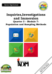 Inquiries,Investigations and Immersion Quarter 3 – Module 7: Population and Sampling Methods Inquiries, Investigations and Immersion Alternative Delivery Mode Quarter 3 – Module 7: Population and Sampling Method First Edition, 2020 Republic Act 8293, section 176 states that: No copyright shall subsist in any work of the Government of the Philippines. However, prior approval of the government agency or office wherein the work is created shall be necessary for exploitation of such work for profit. Such agency or office may, among other things, impose as a condition the payment of royalties. Borrowed materials (i.e., songs, stories, poems, pictures, photos, brand names, trademarks, etc.) included in this module are owned by their respective copyright holders. Every effort has been exerted to locate and seek permission to use these materials from their respective copyright owners. The publisher and authors do not represent nor claim ownership over them. Published by the Department of Education Secretary: Leonor Magtolis Briones Undersecretary: Diosdado M. San Antonio SENIOR HS MODULE DEVELOPMENT TEAM Author Co-Author –Language Editor Co-Author –Content Evaluator Co-Author –Illustrator Layout Artist : Leda M. Dela Cruz : Samantha F. Batalla : May S. Flores : Leda M. Dela Cruz : Donnalin S. Oliveros Team Leaders: School Head LRMDS Coordinator :Aida Capili :Jaycee B. Barcelona SDO-BATAAN MANAGEMENT TEAM: Schools Division Superintendent OIC- Asst. Schools Division Superintendent Chief Education Supervisor, CID Education Program Supervisor, LRMDS Education Program Supervisor, AP/ADM Education Program Supervisor, Senior HS Project Development Officer II, LRMDS Division Librarian II, LRMDS : Romeo M. Alip, PhD, CESO V : William Roderick R. Fallorin, CESE : Milagros M. Peñaflor, PhD : Edgar E. Garcia, MITE : Romeo M. Layug : Danilo S. Caysido : Joan T. Briz : Rosita P. Serrano REGIONAL OFFICE 3 MANAGEMENT TEAM: Regional Director Chief Education Supervisor, CLMD Education Program Supervisor, LRMS Education Program Supervisor,ADM : May B. Eclar, PhD, CESO III : Librada M. Rubio, PhD : Ma. Editha R. Caparas, EdD : Nestor P. Nuesca, EdD Printed in the Philippines by the Department of Education – Schools Division of Bataan Office Address: Provincial Capitol Compound, Balanga City, Bataan Telefax: (047) 237-2102 E-mail Address: bataan@deped.gov.ph Inquiries, Investigationsand Immersion Quarter 3 – Module 7: Population and Sampling Method Introductory Message This Self-Learning Module (SLM) is prepared so that you, our dear learners, can continue your studies and learn while at home. Activities, questions, directions, exercises, and discussions are carefully stated for you to understand each lesson. Each SLM is composed of different parts. Each part shall guide you step-by-step as you discover and understand the lesson prepared for you. Pre-tests are provided to measure your prior knowledge on lessons in each SLM. This will tell you if you need to proceed on completing this module or if you need to ask your facilitator or your teacher’s assistance for better understanding of the lesson. At the end of each module, you need to answer the post-test to self-check your learning. Answer keys are provided for each activity and test. We trust that you will be honest in using these. In addition to the material in the main text, Notes to the Teacher are also provided to our facilitators and parents for strategies and reminders on how they can best help you on your home-based learning. Please use this module with care. Do not put unnecessary marks on any part of this SLM. Use a separate sheet of paper in answering the exercises and tests. And read the instructions carefully before performing each task. If you have any questions in using this SLM or any difficulty in answering the tasks in this module, do not hesitate to consult your teacher or facilitator. Thank you. What I Need to Know This module will help student researchers to understand the different types of population and sampling in quantitative and qualitative research. The student-researchers would need to narrow down the population and build a sample to collect data. The module is divided into two lessons: • • Lesson 1 – Population and Sampling for Quantitative research Lesson 2 – Population and Sampling for Qualitative research After going through this module, you are expected to: 1. describe how probability sampling differs from non-probability sampling; 2. define generalizability and describe how it is achieved in probability samples; 3. identify the various types of probability samples and provide a brief description of each; 4. define non-probability sampling and describe instances in which a researcher might choose a non-probability sampling technique; and 5. describe the different types of non-probability samples; 1 What I Know Directions: Choose the letter of the best answer. Write the chosen letter on a separate sheet of paper. 1. Which of the following is the BEST choice as an essential question for a research paper about life on planets? a. Why would being the closest c. What are the planets we or farthest planet from the know have life on them? sun affects the ability to sustain life? d. What factors affect a planet’s b. Why is there no life on the ability to sustain life? moon? 2. Identify the Population: Magsaysay National High School randomly selected 230 teachers to find out which technology resource is the most effective. Thirty teachers chose Safari Montage, 45 selected Learn Zillion, 100 chose Ed Puzzle, and 55 chose Kahoot. GCPS concluded that all teachers prefer Ed Puzzle. a. 200 teachers c. 55 teachers d. all teachers b. 100 teachers 3. A survey will be given to 100 students randomly selected from the Grade 11 classes at Magsaysay National High School. What is the sample population of the study? a. 100 students c. all senior high students of b. all grade 11 in MNHS MNHS d. all the senior 4. Ideally, samples 