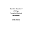 Questions Exercises in Histology For medical Students Second year Histology Department Beni-Suef University Contents 1- CNS 2- Eye & Ear 3- Digestive system 4- Endocrine system 5- Urinary system 6- Male genital system 7- Female genital system 8- Respiratory system 9- Skin 1-CNS I-Multiple Choice Questions 1-The fibres of cuneate tract end in: a. Cuneate nuclei in the medulla b. Substantia gelatinosa c. Clark s nucleus d. Nucleus proprius e. Commissural nucleus. 2- The first order neurone in auditory pathway a. Axons of bipolar nerve cells in spiral ganglia b. Inferior colliculus c. Superior olivary nucleus d. Trapezoid body e. Medial geniculate body 3- Which of the following tracts is concerned with coordination of the eye &head movements toward the source of stimulation? a. Spino-olivary b. Spinoreticular c. Spinotectal d. Spinovestibular e.Cuneo-cerebellar 4- All of the following sensations are carried by the Trigeminal lemniscus except: a. Pain b. proprioception c. Temperature d. Hearing e. simple touch 5-The fibres of corticospinal tract arise from axons of neurons in: a. anterior 2/3 of posterior limb of internal capsule. b. motor area 8 of the crebral cortex c. motor area 4 of the crebral cortex. d. intermediate part of basis pedunculi e. basis pontis 6- Which of the following tracts is concerned with fine, isolated specific movements? a. Spino-olivary b. Spinoreticular c. Spinotectal d. Corticospinal. e.Cuneo-cerebellar 7-The 2nd order neuron in the pathway of crude touch is: a. Gracile nucleus b.Cuneate nucleus c. Substantia gealtinosa of Rolandi d. Clarke cell e. Main sensory nucleus 8- As regard external arcuate fibers all of the following are true except: a.They are some fibers from gracile & cuneate tracts which do not relay in gracile & cuneate nuclei. b. anterior external arcuate fibers relay in the arcuate nucleus then to cerebellum. c. They form the medial lemniscus d. It is a connection between deep sensation & cerebellum. e. posterior arcuate fibers enter the inferior cerebellar peduncle directly 9- All of the following tracts are extrapyramidal except: a.Lateral vestibulo-spinal tract b.Rubrospinal tract c.ventral reticulospinal d.Sulco-marginal tract e.lateral corticobulbar. 22. T10-The following are tracts that carry sensations that reach subcortical levelevel except: a. Dorsal spinocerebellar tract. b. Ventral l spinocerebellar tract. c. Spinoolivary tract. d. Spinotectal tract. e. Cuneate tract. 23. 11-The first order neuron in proprioception from the upper half of the Bod body is in: a. Gracile nucleus. b. Cuneate nucleus. c. Spinal ganglia. d. Main sensory nucleus. e. Substantia gelatinosa of Rolandi. 12. Which of the following is involved in the blood brain barrier? a. Astrocytes. b. Ependymal cells. c. Oligodendrocytes. d. Schwann cells e. Macrophages. 13-The first order neurons in proprioception pathway from face and head are in: a. Trigeminal ganglion. b. Dorsal root ganglion. c. Spinal nucleus of trigeminal nerve. d. Mesencephalic nucleus of trigeminal nerve. e. Nucleus proprius. 26. 14-Final neurons in auditory pathway are: a. Cells of Medial geniculate body. b. Cells of Lateral geniculate body. c. Cells in Inferior colliculus. d. Cells in superior colliculus. e. Cells of lateral lemniscus nucleus. 27. 15-The densest & thickest layer of the meninges is called: a. pia matter. b. dura matter. c. arachnoid matter. d. epineurium. e. leptomeninges. II-Match: A B 6. G 1- Granular cells of cerebellum. a) Arises from Clark's nucleus. 7. C 2-Corticospinal tract. b) Arises from motor area 8. 8. 3-Dorsal spinocerebellar tract. c) Form parallel fibres. 9. 4-Medial corticobulbar tract. d) Continuation of medial longitudinal bundle. 5. Internal arcuate fibres. e) Form medial lemniscus. f) Middle part of basis pedunculi in mid brain. g) Cells of Medial geniculate body. 1 c 2 f 3 a 4 b 5 E 2-The Organs of Special Senses (Eye and Ear) I-Multiple Choice Questions 1-As regard cristae ampullares : a- It has thin glycoprotein layer b- It has a conical shape cupula c-It is covered with otoliths. d- Exactly similar to maculae e- It is the neuroreceptor for hearing 2-Concerning the inner hair cells of the organ of Corti: a-Forms three to five rows of cells b-They rest on top of inner phalangeal cells. c-They have kinocilium d-They rest on basilar membrane e-They maintain balance and equilibrium 3- Where is the blind spot? a. Ciliary body b. Optic disc c. Fovea centralis d. Yellow spot e. Sclera 4-The refractive media of the eye are formed of all except: a-Lens b-Retina c-Aqueous humor d-Vitrous body e-Cornea 5-Where does aqueous humor from anterior chamber collect into? a. Canaliculi b. Canal of Hering c. Canal of Muller d. Canal of Descemet e. Canal of Schlemm 6-What type of glands are the glands of Moll? a. Endocrine gland b. Apocrine sweat gland c. Oil gland d. Sebaceous glands e. Eccrine sweat gland 7- The receptors of the cochlear nerve are found in: a. Macula of the utricle b. Macula of the saccule c. Crista ampularis d. Hair cells of organ of corti e. Inferior colliculus. 8. One of the following is true concerning the sclera: a. Has no blood vessels. b. Collagen fibers are regulary parallel to each other. c. The matrix has low water content. d. It contains collagen and elastic fibers. e. It is transparent. 9. One of the following is false about the pigmented epithelium of the retina: a. It is a layer of cubical cells. b. Resting on bowman's membrane. c. Cells are connected by tight junctions. d. Has apical microvilli e. The inner part of the cells is rich in melanin pigments 10. Regarding the fovea centralis: a. It is highly vascular b. Contains only rods. c. Poor visual acuity. d. The number of layers of the retina is less. e. It is opaque. 11. Regarding the eye lids, all the followings are true except: a. They are covered by thin skin rich in fat. b. The orbicularis occuli is formed of skeletal muscle fibers. c. They contain the tarsal plate. d. They contain sebaceous gla