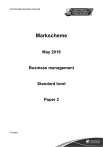 M18/3/BUSMT/SP2/ENG/TZ0/XX/M Markscheme May 2018 Business management Standard level Paper 2 24 pages –2– M18/3/BUSMT/SP2/ENG/TZ0/XX/M This markscheme is confidential and for the exclusive use of examiners in this examination session. It is the property of the International Baccalaureate and must not be reproduced or distributed to any other person without the authorization of the IB Global Centre, Cardiff. –3– M18/3/BUSMT/SP2/ENG/TZ0/XX/M The following are the annotations available to use when marking responses. Annotation Explanation AE - Attempts Evaluation BOD - Benefit of the doubt CKS - Clear Knowledge Shown Cross - Incorrect point DES - Descriptive EE - Effective evaluation GA - Good Analysis GD - Good Definition GEXA - Good Example GEXP - Good Explanation GP GP - Good Point H Line - Underline tool Highlight - Highlight tool IR - Irrelevant IU - Inappropriate Use LD - Lacks Depth LLS - Lacks Logical Structure Associated shortcut –4– M18/3/BUSMT/SP2/ENG/TZ0/XX/M NAQ - Not Answered Question NBOD - No benefit of the doubt NE - Not enough On Page Comment - On page comment tool P - Paragraphing PE - Poorly expressed QuestionMark - Unclear SEEN_Small - Seen Tick Colourable TV - Too vague UR - Unbalanced Response You must make sure you have looked at all pages. Please put the to indicate that you have seen it. annotation on any blank page, –5– M18/3/BUSMT/SP2/ENG/TZ0/XX/M The markbands and assessment criteria on pages 5–7 should be used where indicated in the markscheme. Marks 0 1–2 Level descriptor The work does not reach a standard described by the descriptors below. • • • 3–4 • • • 5–6 • • • • • 7–8 • • • • • 9–10 • • • • • Little understanding of the demands of the question. Few business management tools (where applicable), techniques and theories are explained or applied, and business management terminology is lacking. Little reference to the stimulus material. Some understanding of the demands of the question. Some relevant business management tools (where applicable), techniques and theories are explained or applied, and some appropriate terminology is used. Some reference to the stimulus material but often not going beyond the name of a person(s) and/or the name of the organization. Understanding of most of the demands of the question. Relevant business management tools (where applicable), techniques and theories are explained and applied, and appropriate terminology is used most of the time. Some reference to the stimulus material that goes beyond the name of a person(s) and/or the name of the organization. Some evidence of a balanced response. Some judgments are relevant but not substantiated. Good understanding of the demands of the question. Relevant business management tools (where applicable), techniques and theories are explained and applied well, and appropriate terminology is used. Good reference to the stimulus material. Good evidence of a balanced response. The judgments are relevant but not always well substantiated. Good understanding of the demands of the question, including implications, where relevant. Relevant business management tools (where applicable), techniques and theories are explained clearly and applied purposefully, and appropriate terminology is used throughout the response. Effective use of the stimulus material in a way that significantly strengthens the response. Evidence of balance is consistent throughout the response. The judgments are relevant and well substantiated. –6– M18/3/BUSMT/SP2/ENG/TZ0/XX/M Assessment criteria for Section C Criterion A: Knowledge and conceptual understanding This criterion addresses the extent to which the candidate demonstrates knowledge and understanding of the given concepts and relevant business management content (theories, techniques or tools, depending on the requirements of the question). Marks 0 1 2 3 4 Level descriptor The work does not reach a standard described by the descriptors below. Superficial knowledge of the given concepts is demonstrated. Business management content is not selected or the content selected is irrelevant. Satisfactory understanding of one or both of the given concepts is demonstrated. Some business management content selected is relevant. The relevant content is satisfactorily explained. Good understanding of one or both of the given concepts is demonstrated. The business management content selected is relevant, though it may not be sufficient. The relevant content is generally well explained, though the explanation may lack some depth or breadth. Good understanding of both of the given concepts is demonstrated. The business management content selected is relevant, sufficient and well explained. Criterion B: Application This criterion addresses the extent to which the candidate is able to apply the given concepts and the relevant business management content (theories, techniques or tools, depending on the requirements of the question) to his or her chosen real-world organization(s). The realworld organization(s) must not be the organization featured in the prescribed case study for paper 1. Marks 0 1 2 3 4 Level descriptor The work does not reach a standard described by the descriptors below. The given concepts and/or any relevant business management content are connected to the real-world organization(s), but this connection is inappropriate or superficial. The given concepts and/or relevant business management content are connected appropriately to the real-world organization(s), but this connection is not developed. The given concepts and relevant business management content are generally well applied to explain the situation and issues of the real-world organization(s), though the explanation may lack some depth or breadth. Examples are provided. The given concepts and relevant business management content are well applied to explain the situation and issues of the real-world organization(s). Examples are appro