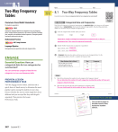 LESSON 8.1 Two-Way Frequency Tables Name 8.1 HARDBOUND SE PAGE 279 BEGINS HERE Summarize categorical data for two categories in two-way frequency tables. Interpret relative frequencies in the context of the data (including joint, marginal, and conditional relative frequencies). Recognize possible associations and trends in the data. Categorical Data and Frequencies Circle the categorical data variable. Justify your choice. temperature weight height color Temperature, weight, and height are measured on a numerical scale, so they are Mathematical Practices quantitative data. Color cannot be expressed numerically. MP.7 Using Structure Language Objective Identify whether the given data is categorical or quantitative. large, medium, small categorical Distinguish between quantitative data and categorical data. 2 2 120 ft , 130 ft 2, 140 ft quantitative ENGAGE View the Engage section online, and then take a quick, show-of-hands survey to determine the most popular sports among the students in your class. Discuss whether the survey results might have been different had you surveyed the boys and the girls separately. Then preview the Lesson Performance Task. A frequency table shows how often each item occurs in a set of categorical data. Use the categorical data listed on the left to complete the frequency table. © Houghton Mifflin Harcourt Publishing Company Ways Students Get to School bus car walk car car car bus walk walk walk bus bus car bus bus walk bus car bus car Way Frequency bus 8 car 7 walk 5 Reflect 1. How did you determine the numbers for each category in the frequency column? You can determine the numbers for each category by counting the number of times each category is listed in the data. 2. What must be true about the sum of the frequencies in a frequency table? The sum should equal the total number of items in the data set. Module 8 be ges must EDIT--Chan DO NOT Key=NL-A;CA-A Correction Lesson 1 347 gh “File info” made throu Date Class 8.1 ion: How Quest Essential rical data can catego arized? ries be summ for two catego rds, of these standa see the table starting on Resource Locker page CA2. uencies HARDCOVER PAGES 279290 ne you will exami In this lesson animal type, ing itative data. ts are quant numbers. Data describ Explore measuremen using numerical expressed sed with cannot be can be expres rical data, which categorical data. Data that of examples data, or catego qualitative or favorite song are . car, model of your choice S-ID.5 For IN1_MNLESE389755_U4M08L1.indd 347 cy Tables Frequen Two-Way Name the full text Data Categorical data categorical temperature and Freq Turn to these pages to find this lesson in the hardcover student edition. Justify variable. color height they are scale, so a numerical ured on t are meas y. t, and heigh numericall re, weigh expressed Temperatu cannot be Color data. e . quantitativ or quantitative is categorical data er the given l Identify wheth categorica m, small large, mediu titative 2 quan the data. Use 2 ft2 , 140 ft categorical 120 ft , 130 in a set of item occurs ncy table. often each the freque shows how to complete ncy table A freque on the left data listed Frequency categorical Way 8 l bus Get to Schoo nts Ways Stude 7 Circle the weight car walk 5 Harcour t Publishin y g Compan bus car car car bus car walk bus bus car walk car walk walk bus car bus bus bus walk n? each ncy colum of times in the freque number category ting the ers for each ory by coun ine the numb each categ did you determ the numbers for 1. How determine You can table? in the data. frequency is listed ncies in a set. category freque data in the sum of the of items about the number must be true l the total 2. What should equa Lesson 1 The sum © Houghto n Mifflin Reflect 347 Module 8 8L1 347 55_U4M0 ESE3897 IN1_MNL 347 Lesson 8.1 Resource Locker Data that can be expressed with numerical measurements are quantitative data. In this lesson you will examine qualitative data, or categorical data, which cannot be expressed using numbers. Data describing animal type, model of car, or favorite song are examples of categorical data. S-ID.5 PREVIEW: LESSON PERFORMANCE TASK Two-Way Frequency Tables Explore The student is expected to: You can summarize categorical data for two categories in a two-way frequency table. Date Essential Question: How can categorical data for two categories be summarized? Common Core Math Standards Essential Question: How can categorical data for two categories be summarized? Class 4/9/14 5:58 PM 4/2/14 9:30 AM Explain 1 HARDBOUND SE Constructing Two-Way Frequency Tables PAGE 280 BEGINS HERE If a data set has two categorical variables, you can list the frequencies of the paired values in a two-way frequency table. Example 1 Categorical Data and Frequencies Complete the two-way frequency table. A high school’s administration asked 100 randomly selected students in the 9th and 10th grades about what fruit they like best. Complete the table. INTEGRATE TECHNOLOGY Preferred Fruit Grade Apple Orange Banana 9th 19 12 23 10th 22 9 15 Students have the option of completing the Explore Activity online or in the book. Total Total CONNECT VOCABULARY Row totals: Column totals: Grand total: 9th: 19 + 12 + 23 = 54 Apple: 19 + 22 = 41 Sum of row totals: 54 + 46 = 100 10th: 22 + 9 + 15 = 46 Orange: 12 + 9 = 21 Sum of column totals: 41 + 21 + 38 = 100 Banana: 23 + 15 = 38 Both sums should equal the grand total. Make sure that students understand the distinction between quantitative and categorical data. Quantitative data can be measured on a numbered scale. Categorical data involves either/or choices between two or more descriptive categories. Ask students to provide some examples of quantitative and categorical data. Preferred Fruit Grade Apple Orange Banana Total 9th 19 12 23 54 10th 22 9 15 46 Total 41 21 38 100 Jenna asked some randomly selected students whether they preferred dogs, cats, or other pets. She also recorded the gender of each student. The results