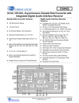 CS8422 24-bit, 192-kHz, Asynchronous Sample Rate Converter with Integrated Digital Audio Interface Receiver Sample Rate Converter Features Digital Audio Interface Receiver Features 140 dB Dynamic Range Complete EIAJ CP1201, IEC-60958, AES3, -120 dB THD+N No External Master Clock Required Supports Sample Rates up to 211 kHz Input/Output Sample Rate Ratios from 6:1 to 1:6 Master Mode Master Clock/Sample Rate Ratio Support: 64, 96, 128, 192, 256, 384, 512, 768, 1024 16, 18, 20, or 24-bit Data I/O Dither Automatically Applied and Scaled to Output Resolution Multiple Device Outputs are Phase Matched S/PDIF Compatible Receiver 28 kHz to 216 kHz Sample Rate Range 2:1 Differential AES3 or 4:1 S/PDIF Input Mux De-emphasis Filtering for 32 kHz, 44.1 kHz, and 48 kHz Recovered Master Clock Output: 64 x Fs, 96 x Fs, 128 x Fs, 192 x Fs, 256 x Fs, 384 x Fs, 512 x Fs, 768 x Fs, 1024 x Fs 49.152 MHz Maximum Recovered Master Clock Frequency Ultralow-jitter Clock Recovery High Input Jitter Tolerance No External PLL Filter Components Required Selectable and Automatic Clock Switching AES3 Direct Output and AES3 TX Passthrough On-chip Channel Status Data Buffering Automatic Detection of Compressed Audio Streams Decodes CD Q Sub-Code VL Level Translators SDIN ISCLK ILRCK RX0/RXP0 RX1/RXN0 RX2/RXP1 RX3/RXN1 Serial Audio Input 2:1 MUX 4:1 MUX Receiver Clock & Data Recovery (PLL) VA AGND Clock Generator Format Detect Sample Rate Converter 3:1 MUX Serial Audio Output SDOUT1 OSCLK1 OLRCK1 TDM_IN 3:1 MUX C or U Data Buffer (First 5 Bytes) Control Port & Registers DGND V_REG Serial Audio Output General Purpose Outputs SDOUT2 OSCLK2 OLRCK2 GPO0 GPO1 GPO2 GPO3 Level Translators XTI XTO http://www.cirrus.com RMCK SDA/ SCL/ CDOUT CCLK AD1/ CDIN AD0/ CS Copyright Cirrus Logic, Inc. 2012-2020 (All Rights Reserved) APR '20 DS692F3 CS8422 System Features SPI™ or I²C™ Software Mode and Stand-Alone Hardware Mode Flexible 3-wire Digital Serial Audio Input Port Dual Serial Audio Output Ports with Independently Selectable Data Paths Master or Slave Mode Operation for all Serial Audio Ports Time Division Multiplexing (TDM) Mode Integrated Oscillator for use with External Crystal Four General-purpose Output Pins (GPO) +3.3 V Analog Supply (VA) +1.8 V to 5.0 V Digital Interface (VL) Space-saving 32-pin QFN Package 2 General Description The CS8422 is a 24-bit, high-performance, monolithic CMOS stereo asynchronous sample rate converter with an integrated digital audio interface receiver that decodes audio data according to the EIAJ CP1201, IEC60958, AES3, and S/PDIF interface standards. Audio data is input through the digital interface receiver or a 3-wire serial audio input port. Audio is output through one of two 3-wire serial audio output ports. Serial audio data outputs can be set to 24, 20, 18, or 16-bit word-lengths. Data into the digital interface receiver and serial audio input port can be up to 24-bits long. Input and output data can be completely asynchronous, synchronous to an external clock through XTI, or synchronous to the recovered master clock. The CS8422 can be controlled through the control port in Software Mode or in a Stand-Alone Hardware Mode. In Software Mode, the user can control the device through an SPI or I²C control port. Target applications include digital recording systems (DVD-R/RW, CD-R/RW, PVR, DAT, MD, and VTR), digital mixing consoles, high-quality D/A, effects processors, and computer audio systems. The CS8422 is available in a space-saving QFN package in Commercial (-40° C to +85° C) grade. The CDB4822 is also available for device evaluation and implementation suggestions. Please refer to “Ordering Information” on page 80 for complete details. DS692F3 CS8422 TABLE OF CONTENTS 1. PIN DESCRIPTION ................................................................................................................................. 9 1.1 Software Mode ................................................................................................................................. 9 1.2 Hardware Mode ............................................................................................................................. 11 2. CHARACTERISTICS AND SPECIFICATIONS .................................................................................... 13 RECOMMENDED OPERATING CONDITIONS .................................................................................. 13 ABSOLUTE MAXIMUM RATINGS ...................................................................................................... 13 PERFORMANCE SPECIFICATIONS - SAMPLE RATE CONVERTER .............................................. 14 DIGITAL FILTER CHARACTERISTICS .............................................................................................. 14 DC ELECTRICAL CHARACTERISTICS .............................................................................................. 15 DIGITAL INTERFACE SPECIFICATIONS ........................................................................................... 16 SWITCHING SPECIFICATIONS ......................................................................................................... 17 SWITCHING CHARACTERISTICS - CONTROL PORT - SPI MODE ................................................. 20 SWITCHING CHARACTERISTICS - CONTROL PORT - I²C MODE .................................................. 21 3. TYPICAL CONNECTION DIAGRAMS ................................................................................................. 22 3.1 Software Mode .............................................................................................................................. 22 3.2 Hardware Mode ............................................................................................................................ 23 4. OVERVIEW ........................................................................................................................................... 24 5. THREE-WIRE SERI