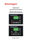 HGM6110/6120 Automatic Generator Module OPERATING MANUAL Smartgen Electronics Smartgen Electronic Equipment Co,.Ltd No.12 Dongqing Street Zhengzhou Henan Province P.R.China Tel : (0086)-371-67992951 67991572 Fax: (0086)-371-67992952 Web: http://www.smartgen.com.cn http://www.smartgen.cn Email: smartgen@smartgen.com.cn All rights reserved. No part of this publication may be reproduced in any material form (including photocopying or storing in any medium by electronic means or other) without the written permission of the copyright holder. Applications for the copyright holder’s written permission to reproduce any part of this publication should be addressed to Smartgen Electronics at the address above. Any reference to trademarked product names used within this publication is owned by their respective companies. Smartgen Electronics reserves the right to change the contents of this document without prior notice. Software Version Version Date 1.0 2008-01-20 1.1 2008-03-25 2.0 2008-10-27 Note Original release. Amend picture error Add control HGM6110/6120 AUTO START MODULE CONTENT 1.SUMMARY .....................................................................................4 2.PERFORMANCE AND CHARACTERISTICS .................................4 3.SPECIFICATION.............................................................................6 4.OPERATION...................................................................................6 4.1KEY FUNCTION ........................................................................................ 6 4.2AUTOMATIC OPERATION ........................................................................ 7 4.3MANUAL OPERATION .............................................................................. 8 5.PROTECTION ................................................................................9 6.CONNECTING TERMINAL...........................................................12 7.PARAMETER RANGE AND DEFINE............................................14 7.1PARAMETERS TABLE (TABLE 1) ........................................................... 14 7.2OUTPUT 1-4 TABLE (TABLE 2)............................................................... 17 7.3DIGIT INPUT 1-2 TABLE (TABLE 3) ........................................................ 17 7.4SENSOR (TABLE 4) ................................................................................ 18 7.5CONDITION OF CRANK SUCCEED (TABLE 5) ..................................... 19 8.SETTING PARAMETER ...............................................................19 9.TEST RUN....................................................................................21 10.TYPICAL WIRING DIAGRAM .....................................................22 11.INSTALLATION ...........................................................................23 12.FAULT FINDING .........................................................................24 HGM6110/6120 Auto Start Module ISSUE 2.0 2008-10-27 Page 3 of 24 HGM6110/6120 AUTO START MODULE 1. SUMMARY HGM6100 Series generator controller integrating digital, intelligent and network techniques is used for automatic control system of diesel generator. It can carry out functions including automatic start/stop, data measure and alarming. The controller uses LCD display, optional Chinese and English display interface with operation easy and reliable. HGM6100 Series generator controller uses micro-processing technique which can carry out precision measure, constant value adjustment, timing and threshold setting and etc. of multi-parameters. It can be widely used in all types of generator automatic control system for compact structure, advanced circuits, simple connections and high reliability. 2. PERFORMANCE AND CHARACTERISTICS ◆ HGM6100 controller has two types: HGM6110: ASM (Automatic Start Module) HGM6120: AMF (Automatic Mains Failure Module) ◆ Using microprocessor as a core, graphics LCD with big screen and backlight, display between Chinese and English, key touch for operation. ◆ Have a RS485 port, can used for communicate to PC. ◆ Precision measure and display of mains voltage mains frequency (Hz) mains current generator voltage generator current generator frequency (Hz) generator active power (kW) generator inactive power (kVar) generator apparent power (kVA) generator power factor generator starts count generator hours count generator cumulate electric energy (kWh) generator temperature generator pressure generator fuel level start battery voltage ◆ Configurable single phase 2 wires or 2 phase 3 wires or 3 phase 4 wires AC HGM6110/6120 Auto Start Module ISSUE 2.0 2008-10-27 Page 4 of 24 HGM6110/6120 AUTO START MODULE system input; ◆ Control protection: Automatic start/stop, load transfer and alarming of generator; ◆ Parameters setting: Allow user to modify setting and store them inside internal FLASH memory, the parameters can not be lost even with power down. All parameters can be set from the front panel, or be set by PC used SG72 ◆Three channel analog inputs, may joint with Resistive-type temperature/ pressure/ fuel level sensors, Several temperature and pressure sensors can be used directly (ie. VDO, DATCON, CUMMINS), also may select “user defined” sensor via entering 8 point curves; ◆ Display of generator cumulated electric energy; ◆ Security password-protected programming levels. ◆ Several crank success conditions are optional; ◆ Built-in speed/frequency detecting units can accurately judge the states such as crank success and over speed; ◆ Power supply range is wide, accommodating to different starting battery voltage environments; ◆ All parameters use digital modulation, abandoning analog modulation using conventional electronic potentiometer, reliability and stability are increased; ◆ Built-in watch dog can never be dead halt, ensuring smooth program execution; ◆ Modular configuration design, inserted type connection terminals, flush type installation, compact 