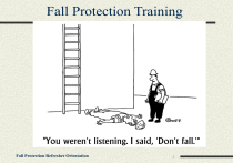Fall Protection Refresher Orientation 1 Fall Protection Training Falls to a lower level accounted for 81 percent of all fatal falls. Of those cases where the height of the fall was known, more than two-fifths of fatal falls occurred from 15 feet or lower. Fatal falls to a lower level account for nearly 40 percent of fatal work injuries. Fall Protection Refresher Orientation 2 Course Objectives Understand the definitions of fall prevention, fall restraint, and fall arrest. Understand the requirements of fall protection. Recognize the hazards associated with fall protection. Fall Protection Refresher Orientation 3 Course Objectives Know how to inspect and wear personal fall arrest system equipment (PFAS). Know the requirements for anchorage points and how to tie off to them. Fall Protection Refresher Orientation 4 What is Fall Protection? A series of reasonable steps taken to eliminate or control injurious effects of an unintentional fall while accessing or working at height Fall Protection Refresher Orientation 5 Fall Statistics FALLS ARE THE LEADING CAUSE OF DEATH IN CONSTRUCTION. As an example…. In 2016, there were 370 fatal falls to a lower level out of 991 construction fatalities (BLS data). These deaths are preventable. Fall Protection Refresher Orientation 6 Where Do Fatal Falls Occur Floors, Loading Docks, Ground Level 4% Non-moving Vehicles 3% Other 12% Roofs 37% Structural Steel 9% Ladders 15% Fall Protection Refresher Orientation Scaffolds 20% 7 Where Do Non-Fatal Falls Occur Scaffolds 15% Other 22% Roofs 12% Non-moving Vehicles 9% Ladders 35% Stairs/Steps 7% Fall Protection Refresher Orientation 8 Anatomy of a Fall .33sec./2 feet .67 sec./7 feet 1 sec./16 feet It takes most people about 1/3 of a second to become aware they are falling. It takes another 1/3 of a second for the body to react. A body can fall up to 7 feet in 2/3 of a second. 2 sec./64 feet Fall Protection Refresher Orientation 9 Planning for Fall Protection Best practice dictates that fall protection becomes an integral part of the work planning process, from constructability, to systems installation, to use and maintenance The workplace cannot be truly safe unless fall protection is incorporated into every phase of the process Planning will keep workers safe and minimize fall exposures Fall Protection Refresher Orientation 10 Controlling Fall Exposures General industry 29 CFR 1910 regulations (paraphrased) • Every open-sided floor, platform, wall opening, or hole 4 feet or more above adjacent floor or ground level shall be guarded by a standard railing, or the equivalent, on all open sides except where there is entrance to a ramp, stairway, or fixed ladder. Construction industry 29 CFR 1926 regulations (paraphrased) • Each employee on a walking/working surface (horizontal and vertical surface) with an unprotected side, edge, or hole which is 6 feet (1.8 m) or more above a lower level shall be protected from falling by the use of guardrail systems, safety net systems, or personal fall arrest systems. Fall Protection Refresher Orientation 11 Controlling Fall Exposures • Both 29 CFR 1910 General Industry and 29 CFR 1926 Construction standards shall be followed when the work involves hazards that require fall protection. There are requirements that apply to all general work as well as specific requirements based upon the work activity that is performed. • Exceptions to fall protection requirements, as provided in 1926.500, are ONLY for construction-related activities. There are no fall protection exemptions for maintenance or operations work in general industry. Fall Protection Refresher Orientation 12 Using Fall Protection Systems Select fall protection system appropriate for the task. Supervise employees properly. Evaluate the effectiveness of all steps Use proper construction and installation of safety systems. Use safe work procedures. Train workers in the proper selection, use, and maintenance of fall protection systems. Fall Protection Refresher Orientation 13 Fall Protection Methods Fall Prevention- A system that will prevent a person from falling to a lower level. Example: Guardrails Work Positioning or Fall Restraint- A system that will allow the worker to approach a fall hazard and work but will not allow the worker to fall to a lower level. Fall Arrest- A system that will protect a person from landing on a lower level after a fall. Example: Fall Arrest Harness and Lanyard Fall Protection Refresher Orientation 14 When Is Fall Protection Required? What are the fall distances that trigger guardrails and fall protection? Fall Protection Refresher Orientation 15 When Is Fall Protection Required? Fall protection is required for falls onto dangerous equipment, no matter what the distance. Fall Protection Refresher Orientation 16 When Is Fall Protection Required? Fall protection in construction is required for work over 6’ above a lower level Fall Protection Refresher Orientation 17 When Is Fall Protection Required? Fall protection is required for scaffolding over 10’ in height. Fall Protection Refresher Orientation 18 When Is Fall Protection Required? Fall protection in general industry is required for walking / working surfaces over 4’ in height Fall Protection Refresher Orientation 19 When Is Fall Protection Required? Fall protection is required for walking / working surfaces over 6’ in height in construction Fall Protection Refresher Orientation 20 When Is Fall Protection Required? Fall protection is required for fixed vertical ladders without cages over 24’ Fall Protection Refresher Orientation 21 When Is Fall Protection Required? No fall protection is required for portable ladders Fall Protection Refresher Orientation 22 Hazard Recognition What are the allowable controls and best practices? Fall Protection Refresher Orientation 23 Walking & Working Surfaces Hazards with working/walking surfaces • Open-sided floors • Holes • Leading edges Fall Protection Refresher Orientation 24 Open