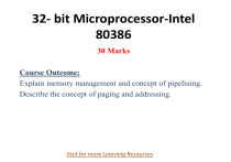 32- bit Microprocessor-Intel 80386 30 Marks Course Outcome: Explain memory management and concept of pipelining. Describe the concept of paging and addressing. Visit for more Learning Resources Signal Description of 80386 Signal Descriptions of 80386 • W/R#:The write / read output distinguishes the write and read cycles from one another. • D/C#:This data / control output pin distinguishes between a data transfer cycle from a machine control cycle like interrupt acknowledge. • M/IO#:This output pin differentiates between the memory and I/O cycles. • LOCK#:The LOCK# output pin enables the CPU to prevent the other bus masters from gaining the control of the system bus. • NA#:The next address input pin, if activated, allows address pipelining, during 80386 bus cycles. • ADS#:The address status output pin indicates that the address bus and bus cycle definition pins( W/R#, D/C#, M/IO#, BE0# to BE3# ) are carrying the respective valid signals. The 80383 does not have any ALE signals and so this signals may be used for latching the address to external latches. • READY#:The ready signals indicates to the CPU that the previous bus cycle has been terminated and the bus is ready for the next cycle. The signal is used to insert WAIT states in a bus cycle and is useful for interfacing of slow devices with CPU. • VCC: These are system power supply lines. • VSS: These return lines for the power supply • BS16#:The bus size –16 input pin allows the interfacing of 16 bit devices with the 32 bit wide 80386 data bus. Successive 16 bit bus cycles may be executed to read a 32 bit data from a peripheral. • HOLD: The bus hold input pin enables the other bus masters to gain control of the system bus if it is asserted. • HLDA: The bus hold acknowledge output indicates that a valid bus hold request has been received and the bus has been relinquished by the CPU. • BUSY#:The busy input signal indicates to the CPU that the coprocessor is busy with the allocated task. • ERROR#:The error input pin indicates to the CPU that the coprocessor has encountered an error while executing its instruction. • PEREQ: The processor extension request output signal indicates to the CPU to fetch a data word for the coprocessor. • INTR: This interrupt pin is a maskable interrupt, that can be masked using the IF of the flag register. • NMI:A valid request signal at the non-maskable interrupt request input pin internally generates a non-maskable interrupt of type2. • RESET: A high at this input pin suspends the current operation and restart the execution from the starting location. • N / C: No connection pins are expected to be left open while connecting the 80386 in the circuit. Architecture of 80386 Architecture of 80386 • The Internal Architecture of 80386 is divided into 3 sections. – Central Processing Unit • Execution Unit • Instruction Unit – Memory management unit • Segmentation • Paging Unit – Bus interface unit • The execution unit consists of the eight 32 bit general purpose registers (GPR) which are use in physical address generation, to hold 8 or 16 or 32 bit data and a 64- bit barrel shifter used to increase the speed of shift, rotate, multiply and divide operations. • The instruction unit decodes the op-code of the instructions which is read from the memory and stores them in the decoded instruction que for immediate use by the execution unit during execution. • The memory Management Unit (MMU) has two sub unit i.e. Segmentation Unit and Paging Unit. • Memory is divided into one or more variable length segments and each 64 Kbytes or 4 Gigabytes in size depending on memory management techniques used either segmentation or paging. • Each task on 80386 can have a maximum of 16,381 segments of up to 4GB each, thus providing 64 TB of virtual memory to each task. • In segmentation unit 80386 provides four level protection for protecting user program and the operating system from each other. • The 80386 has three modes of operation: 1. Real Address Mode (Real Mode) 2. Protected Virtual Addressing mode (Protected Mode) 3. Virtual 8086 mode. • The BIU also offers address pipelining, data bus sizing, and direct Byte Enable signals for each byte of data bus. Register of 80386 • The 80386 has 32 registers in the following categories: – – – – – – – General Purpose Register Segment Registers Instruction Pointer and Flags Status and Control Registers System Address Registers Debug Registers Test Registers Memory Organization in 80386 • Address Space in 80386 • IO Space in 80386 Real Addressing Modes of 80386 • When processor Reset or Powered up then 80386 is initialized in REAL Mode. • Real mode has same base architecture as that of 8086, but allows access to the 32-bit register set of 80386. • The addressing mechanism, memory size, interrupt handelling , are identical to Real Mode of the 80286. • All of the 80386 instructions are available in Real Mode is 16-bits, same as that of 8086. • To use 32-bit registers and addressing mmodes, override prefixes ‘E’ must be used. • The segment size on the 80386 in Real mode is 64KB so 32-bit effective addresses must be less than 0000FFFFH. • The basic Purpose of Real mode in 80386 is to set up the processor for Protected Mode Operation. Memory Addressing in Real Mode of 80386 • In Real mode the max. memory size is limited to 1MB, so only address line A2-A19 are used. • In Real addressing mode the linear addresses are the same physical addresses as paging is not allowed. • Physical address is calculated in Real mode by adding the content of segment register after shifting it left by four bits with an effective address and generates a physical address. Which is compatible with 80286 Real Mode. • All address in Real Mode should not more than 64KB in size and may be Read, written or executed. • The 80386 generates an exception 13 if a data operand or instruction fetch occurs past the e