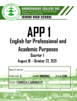 APP 1 English for Professional and Academic Purposes Quarter 1 August 16 – October 22, 2021 Name of Learner: ______________________________________________ Grade Level: 11 Section: OBEDIENCE Strand: STEM Teacher: FLORDELIZA D. CANCHICO,LPT 1|Page APP 1 Welcome professionals in the making! This subject talks about English for Professional and Academic Purposes. It aims to improve and hone your skills in writing academically and also, prepares you to practice those skills when you will become a professional someday. This class aims to a simple yet a vital goal, which is to establish the development of communication skills in English for academic and professional purposes. This module contains calendar of the learning tasks and the topics that we are about to discuss in this subject. It features students- centered leaning module that design not only to test comprehension of concepts and theories discussed in the module, but more importantly, to help us relate the lessons to our experiences as individuals, as a member of their immediate groups, and our society. All activities and quizzes shall be submitted through GOOGLE CLASSROOM every Friday at exactly 4:00 P.M. Week 1 & 2: Week 3 & 4: Week 6: Week 7 & 8: Culminating Performance Task will be submitted on or before September 21, 2021 2|Page Welcome to all professionals in the making! This class aims to a simple yet a vital goal, which is to establish the development of communication skills in English for academic and professional purposes. Flordeliza D. Canchicp canhcicoflordeliza@gmail.com Plong Plong Plong Plong 09514175043/09 Here are some reminders to guide you through out this subject: 1. Always come in time for our Zoom Meetings. 2. Be diligent in doing your tasks. 3. Do not hesitate to reach out to your subject teacher about your problems, about the subject or even about life. She will try her best to respond to you as soon as she gets your message. 4. All activities shall be submitted through GOOGLE CLASSROOM or if you have special cases like unstable internet connection and that you cannot access your google account, please feel free to submit it to your assigned section gmail account with the subject line: WEEK NUMBER + LAST NAME + SECTION 3|Page 0 Week Learning Tasks Platform Page No. School Orientation on LMS and Learning Packets Introduction to English for Academic and Professional Purposes – 8 AM 1-2 Task to Do 1: Text Analysis Task to Do 2: Jigsaw Task to Submit: Concept Mapping 3-4 Classroom Learning Module Notebook 6 Zoom 6 Zoom/Google 6 Classroom Task to Do 1: Concept Mapping Notebook Task to Do 2: Practice Summarizing Notebook Task to Submit: Paraphrase, Summarize, Create Thesis Statement 5-6 Zoom/Google Zoom/ Google Classroom Task to Do 1: Pictionary Zoom Task to Do 2: Outlining Notebook Task to Submit: Virtual Conferencing and Culminating Performance Task Zoom/Google Classroom 4|Page Task to Do 1: Reviewing Sessions 7-8 Task to Do 2: Slogan Making Task to Submit: Development Plan Facebook Group Zoom/ Google Notebook Task to Do 2: Let’s Analyze Notebook Learning Task to Do: Putting Value Culminating Performance Task 49 Classroom Task to Do 1: Written Narrative 9-10 48-49 Zoom Module 56 57 58 5|Page WEEK I & II– Reading Academic Texts After this lesson, learners will be able to: a. differentiates language used in academic texts from various disciplines. b. Identify the dominant text structures in sample academic texts; c. Determine text structure by applying appropriate text mapping strategies and by outlining; d. Note language features in texts across disciplines; and e. value the exchange of ideas with your discussion partner/groupmates regarding the assigned text TASK TASKTO TODO DO11 Notebook Notebook Reflection TextCritical Analysis Instruction: Answer the following question based on your own understanding. Write your answer in the notebook. 15 minutes TASK TASK TO TO SUBMIT SUBMIT Module Google Classroom: Concept Mapping Instruction: Analyze and determine the sentences given based on the types of text structure and language of academic and professional text. 20 minutes TASK TO DO 2 Zoom Jigsaw Instruction: exchange of ideas with your discussion partner/groupmates regarding the assigned text 30 minutes 6|Page READING MATERIAL 1 Concept Presentation LESSON 1: The Structure and Language of Academic and Professional Texts In this Age of Information, when there is so much to know, students are expected to be good at processing various informational texts. Fortunately for you, informational texts follow certain structures or principles of organization that you need to become familiar with in order to facilitate your understanding of the information that you have to learn. Prior knowledge of text structure, therefore, helps you to mentally prepare yourself for what you are about to read and to align your processing of the material to match the demands of the particular text. What this means is that you will be able to understand faster and remember better a text – that is the practical value of a knowledge of a text structure. A. Informational Text Structures Text type depends on the primary purpose of a text, which in turn determines how it’s written – what information the author introduces in the text and how this information is organized. The nine main informational text structures are: 1. Definition/Elucidation A definition text explains the nature of something. 2. Description A descriptive text gives concrete details about appearance, characteristics, and actions. 3. Recount of a Sequence A recount of a sequence is a chronological narration of a historical period, a sequential description of a process or procedure. 4. Cause and Effect A cause-effect text presents reasons why a situation is obtained. Though logically the cause comes before the result, in academic writing, it is the effect that is usually presented first, perhaps, to achieve a more dramatic effect. 7|Page 5. Problem-Solution A problem-solu