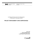 Treasury Board of Canada Secretariat Secrétariat du Conseil du Trésor du Canada An Enhanced Framework for the Management of Information Technology Projects PROJECT MANAGEMENT CORE COMPETENCIES March, 1998 Project Management Office Chief Information Officer Branch Treasury Board of Canada Secretariat Canada Project Management Core Competencies Additional copies of this publication are available from the Treasury Board Distribution Centre, (613) 995-2855 or fax (613) 996-0518 Publication number xxxx Page 2 Project Management Core Competencies TABLE OF CONTENTS 1. INTRODUCTION................................................................................................. 2 PROJECT MANAGEMENT TARGET GROUPS ................................................. 7 Roles 7 2. PROJECT MANAGEMENT CORE COMPETENCIES ................................. 9 3. GENERAL MANAGEMENT.............................................................................. 4 3.1 3.2 3.3 3.4 3.5 3.6 3.7 3.8 Judgment, Integrity, Self-confidence, Flexibility, Initiative, Perseverance5 Thinking Skills ............................................................................................ 6 Organizational Awareness........................................................................... 7 Knowledge .................................................................................................. 8 Leadership ................................................................................................... 9 Interpersonal Relations.............................................................................. 11 Communications ....................................................................................... 12 Action Management .................................................................................. 13 4. PROJECT MANAGEMENT ............................................................................. 14 4.1 4.2 4.3 4.4 4.5 4.6 4.7 4.8 4.9 Project Integration Management ............................................................... 15 Project Scope Management....................................................................... 17 Project Time Management ........................................................................ 20 Project Cost Management ......................................................................... 22 Project Quality Management..................................................................... 24 Project Human Resource Management ..................................................... 25 Project Reporting Management................................................................. 26 Project Risk Management ......................................................................... 28 Project Procurement Management ............................................................ 30 5. IT MANAGEMENT ........................................................................................... 32 5.1 5.2 5.3 Lifecycle Management.............................................................................. 33 Tools and Techniques Management.......................................................... 36 Architecture Management ......................................................................... 37 6.APPENDIX ............................................................................................................ 41 6.1 REFERENCES .................................................................................................... 39 Page 1 Project Management Core Competencies 1. INTRODUCTION This document details the core competencies, or basic skills, required by a person managing an information technology (IT) project in the Canadian federal government. This section provides an overview of the complete document, outlines the target groups for project management professional development and their overall roles, and it illustrates how managing an IT project unites three basic knowledge areas: general management, project management and IT management. Section 2 details the core competencies required for general management. These are skills that any manager must have and that are required for project management as well. Section 3 details the core competencies that any project manager (PM) must have. They are based on the nine knowledge areas in the Project Management Body of Knowledge developed by the Project Management Institute. Section 4 details the core competencies — that is, the unique technical skills — required to manage IT projects. APPENDIX A lists the references used to prepare this document. Page 2 Project Management Core Competencies 1.1 Summary Project management requires three areas of knowledge General Management To ensure proper management practices. Project Management To ensure quality project process and results. IT Management To create or acquire quality IT product. First, the PM must have skills in general management. Skills such as leading, negotiating, communicating, team building and so forth are necessary in any management position. Second, the PM must understand generally accepted project management skills, such as managing project scope, time, cost, quality, and so forth. Third, the PM of an IT project must have the IT management skills, such as lifecycle phasing, estimating, constructing software, and so forth. Page 3 Project Management Core Competencies General Management Knowledge Areas The Profile of Public Service Leaders and Managers (reference 1) defines the following knowledge areas and objectives: KNOWLEDGE AREA OBJECTIVE Judgment, Integrity, Self-confidence, Flexibility, Initiative, Perseverance To act with consideration of issues, ethically, confidently, in a style appropriate to the environment, beyond the basic necessities and consistently with the plan of action. Thinking Skills To arrive at accurate conclusions and solutions by visualizing new potentials, and by identifying, defining and analyzing problems and situations using rational and intuit