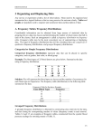 BIOSTATISTICS NURS 3324 3 Organizing and Displaying Data Any survey or experiment yields a list of observations. These need to be organized and summarized in a logical fashion so that we may perceive the outcome clearly. Tables and graphs are popularly used to organize and summarize data and description of data. A. Frequency Tables/ Frequency Distributions Considerable information can be obtained from large masses of statistical data by grouping the raw data into classes and determining the number of observations that fall in each of the classes. Such an arrangement is called a frequency distribution or frequency table. Frequency table may be the most convenient way of summarizing or displaying data. The types of frequency distributions that will be considered here are categorical or qualitative frequency distributions, and grouped frequency distributions. Categorical or Simple Frequency Distributions Categorical frequency distributions represent data that can be placed in specific categories, such as gender, hair color, or blood group. Example: The blood types of 25 blood donors are given below. Summarize the data using a frequency distribution. AB O B A A B B O O B A O B AB AB O A B AB O B O B O A Solution: We will represent the blood types as classes and the number of occurrences for each blood type as frequencies. The frequency table (distribution) in the following table summarizes the data. Frequency Table for the above Example Class (Blood Type) A B O AB Total Frequency 5 8 8 4 25 Grouped Frequency Distributions A grouped frequency distribution is obtained by constructing class intervals for the data, and then listing the corresponding number of values (frequency count) in each interval. Tables 3.2 and 3.3 are examples of frequency tables, constructed from the systolic blood pressure readings (by smoking status) of Table 3.1. 13 BIOSTATISTICS NURS 3324 Table 3.1 Smoking status and the systolic blood pressure for a sample of 100 individuals Smoking Status* Systolic blood pressure Smoking Status* Systolic blood pressure 1 2 3 4 5 1 0 1 1 0 102 138 190 122 128 36 37 38 39 40 0 0 0 1 1 142 122 146 126 176 6 7 8 9 10 0 0 1 0 0 112 128 116 134 104 41 42 43 44 45 1 0 1 1 1 11 12 13 14 15 16 17 18 19 20 1 0 0 0 0 0 1 0 0 0 116 152 134 132 130 118 136 108 108 128 46 47 48 49 50 51 52 53 54 55 21 22 23 24 25 1 1 1 0 1 118 134 178 134 162 26 27 28 29 30 0 1 0 0 0 31 32 33 34 35 0 1 0 0 0 ID Smoking Status* Systolic blood pressure 71 72 73 74 75 1 0 1 1 0 116 154 126 140 122 104 112 140 102 142 76 77 78 79 80 0 1 0 0 1 154 140 120 140 114 1 0 1 0 1 0 0 1 0 1 146 92 112 152 116 118 128 116 134 108 81 82 83 84 85 86 87 88 89 90 0 0 0 0 0 1 0 0 1 0 122 94 122 172 100 150 154 170 140 144 56 57 58 59 60 0 0 0 0 0 134 124 124 114 154 91 92 93 94 95 0 0 0 1 0 156 132 140 150 130 162 120 98 144 118 61 62 63 64 65 1 0 1 0 1 114 114 98 128 130 96 97 98 99 100 0 0 0 0 1 118 162 128 130 208 118 138 134 108 96 66 67 68 69 70 1 1 0 0 0 122 112 106 128 128 ID ID *: 1 and 0 represent smoking and nonsmoking person respectively. How to construct a frequency table? 1. Arrange the data into an array, a listing of all observations from smallest to largest in order to determine the interval spanned by the data. We find that the blood pressure interval for smokers for example is 98-208. 14 BIOSTATISTICS Systolic Blood Pressure of Smokers from Table 3.1 98 116 130 150 102 116 134 150 102 116 136 162 104 116 138 176 108 118 140 178 112 120 140 190 112 122 140 208 114 122 140 114 126 142 116 126 146 NURS 3324 Systolic Blood Pressure of Non-Smokers from Table 3.1 92 112 122 128 134 144 162 94 112 122 128 134 146 170 96 114 122 128 134 152 172 98 114 122 128 134 152 100 118 124 130 134 154 104 118 124 130 138 154 106 118 128 130 140 154 108 118 128 132 140 154 108 118 128 132 142 156 108 120 128 134 144 162 2. Determine the range (R) from the difference between the smallest and largest value in the set of observations i.e. R = largest data value – smallest data value = 208-98 =110 mm. 3. Divide the range into a number of equal and non-overlapping segments called class intervals. Important Note The number of intervals in general should range from 5 to 15. With too many class intervals, the data are not summarized enough for a clear visualization of how they are distributed. With too few, the data are over-summarized and some of the details of the distribution may lost. Sturges’s formula and the desired number of class intervals Those who wish more specific guidance in the matter of deciding how many class intervals are needed may use Sturges’s formula; k = 1 + 3.322(log10 n), where k stands for the number of class intervals and n is the number of values in the data set under consideration (or the sample size) Example: Determine the k value for the 37 smokers we want to group. k = 1 + 3.322(log10 37) k = 1 + 3.322(1.568) = 6.21 6 Note that the value of k has been rounded to the nearest whole number. The answer obtained by Sturges’ rule should not considered as final, but as guide only, should be increased or decreased for convenience and clear presentation. Suppose we decide to use 6 intervals. 15 BIOSTATISTICS NURS 3324 4. Determine the size (length or width) of the class interval (w) by dividing the range (R) by the number of class intervals required or (k). If you want the class width to be a whole number, always increase the result to the next whole number so that the classes cover the data. w R/k = 110/6 = 18.3 increase to 19 or for easiness to 20. 5. Construct a table with three columns, and then write the class intervals in the first column. Start the first class interval with the smallest value or less. This value is called as the lower class limit. Example: The smallest value for systolic blood pressure of smokers and nonsmokers is 98 and 92 respectively. For easiness and for comparison purposes, we will begin at 90. Add the class width to this number to get the lower class limit of the next class interval