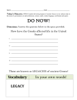 Name ________________________________________ Date ___________________________ Today’s Objective: SWBAT explain the lasting impacts of ancient Greece on our culture today in the areas of: government, art and architecture, science, math, written language, and theater and sports. DO NOW! Directions: Answer the question below in the space provided. How have the Greeks affected life in the United States? 1. __________________________________________________________________ _____________________________________________________________________ 2. __________________________________________________________________ _____________________________________________________________________ 3. __________________________________________________________________ ____________________________________________________________________ 4. __________________________________________________________________ _____________________________________________________________________ These are known as LEGACIES of ancient Greece! Vocabulary LEGACY In your own words! Name: ANSWER KEY Today’s Objective: SWBAT explain the lasting impacts of ancient Greece on our culture today in the areas of: government, art and architecture, science, math, written language, and theater and sports. DO NOW! Directions: Answer the question below in the space provided. How have the Greeks affected life in the United States? ANSWERS: Answers will vary. They may include any of the following: 1. _Giving us the Olympics_ 2. __Giving us democracy_ 3. _Inspiring books like the Percy Jackson Books and the Hunger Games. __ 4. __Influencing architecture/art in the US_ 5. __Introducing the ideas of Philosophy_ _Documenting history__ 6. These are known as LEGACIES of ancient Greece! Vocabulary LEGACY In your own words! Answers will vary. Name ________________________________________ Date ___________________________ Station 1: Greek Government Directions: 1. Pass out the role cards 2. As the reader reads, students should: a. Box proper nouns b. Circle numbers AND c. Underline ways the Greeks helped to advance ideas about how to run a government Reading Comprehension Question (Timer should give everyone 1 minute to write) Question Answer My Answer: In what kind of societies would a direct democracy and a representative democracy work best? Other’s Answers: Directions: Using information from the reading and the map to answer the questions below. 2012 Map of Democracies in the World 1. What two continents shown on the map have the most non-democratic countries? 2. Name a country where people choose their government through voting 3. Name a country where people do not get to vote or their vote does not count. 4. Name two ways that Athenian democracy and democracy in the United States are similar. Name: ANSWER KEY Station 1: Greek Government Directions: Pass out role cards As the reader reads students should box proper nouns and circle numbers AND Underline ways the Greeks helped to advance ideas about how to run a government Reading Comprehension Question ( Timer should give everyone 1 minute to write) Question In what kind of societies would a direct democracy and a representative democracy work best? Answer ANSWER: Direct democracies work best with a small group of people. Representative democracies work best with a large group of people because it would be very difficult to get everyone in the US to debate and vote on every bill becoming a law. Representative democracies also work well in societies where people cannot leave their job frequently to participate in the government. Directions: Using information from the reading and the map to answer the questions below. 2012 Map of Democracies in the World 1. What two continents have the most non-democratic countries? ANSWER: Africa and Asia 2. Name a country where people choose their government through voting ANSWER: Answers will vary. Students can choose any country with a blue dot on it. 3. Name a country where people do not get to vote or their vote does not count. ANSWER: Answers will vary. Students can choose any country that does NOT have a blue dot on it. 4. Name two ways that Athenian democracy and democracy in the United States are similar. ANSWER: Answers will vary. Answers may include 1. There were juries in both Athens and the US. 2. People voted. 3. Men over the age of 18 who were citizens could vote. 4. The people have a say in how the government is run. Name ________________________________________ Date ___________________________ Station 2: Greek Architecture Directions: 1. Pass out the role cards 2. As the reader reads, students should: a. Box proper nouns b. Circle numbers AND c. Underline ways the Greeks helped to advance ideas about how to run a government Reading Comprehension Question (Timer should give everyone 1 minute to write) Question The Athenians decided to rebuild the My Answer: Parthenon after the Persian Wars. If you had lived in ancient Greece would you have supported the decision to rebuild the Parthenon? WHY or WHY Not? Other’s Answers: (Hint: think about time, money, favor or the gods, strength of Athens) Answer Pictures: Directions: Look at each picture and decide if the American building shown has been influenced by Greek Architecture. - Circle the correct description - If the building has been influenced by the Greeks explain in a sentence how you know! Name: ANSWER KEY Station 2: Greek Architecture Directions: Pass out role cards As the reader reads students should box proper nouns and circle numbers AND Underline ways the Greeks helped to advance ideas about Art and Architecture Reading Comprehension Question (Timer should give everyone 1 minute to write) Question Answer The Athenians decided to rebuild the Parthenon after the Persian Wars. If you had lived in ancient Greece would you have supported the decision to rebuild the Parthenon? WHY or WHY Not? ANSWER: Answers will vary. Reasons to rebuild Athens: 1. It showed that the Athenians had money and strength en