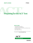 2021 l 2022 FREE Preparing for the ACT Test ® What’s Inside • • • • Full-Length Practice ACT Test, including the Optional Writing Test Information about the Multiple-Choice and Writing Sections Test-Taking Strategies What to Expect on Test Day Esta publicación también se puede ver o descargar en español en www.actstudent.org www.actstudent.org *080192220* A Message to Students This booklet is an important first step as you get ready for college and your career. The information here is intended to help you do your best on the ACT to gain admission to colleges and universities. Included are helpful hints and test-taking strategies, as well as a complete practice ACT, with “retired” questions from earlier tests given on previous test dates at ACT test sites. Also featured are a practice writing test, a sample answer document, answer keys, and self-scoring instructions. Read this booklet carefully and take the practice tests well before test day. That way, you will be familiar with the tests, what they measure, and strategies you can use to do your best on test day. You may also want to consider The Official ACT® Self-Paced Course, Powered by Kaplan® to learn test content and strategies in a virtual classroom. To view all of our test preparation options, go to www.act.org/the-act/testprep. Overview of the ACT Contents A Message to Students b Overview of the ACT b Test-Taking Strategies 1 The full ACT consists of four multiple-choice sections—in English, mathematics, reading, and science—with an optional writing section. Some colleges and universities require or accept ACT writing scores, so you may consider taking the writing section. Prohibited Behavior at the Test Center 3 Test Content of the ACT Sections 4 Taking the Practice Tests 8 Minutes per Test English 75 45 Mathematics 60 60 Reading 40 35 40 35 1 essay 40 Science Practice Multiple- Writing (optional) Choice Sections 9 ACT tries out questions on National test dates to develop future tests. Your test may include questions that will not count towards your score. Please try your best on these questions. Your participation can help shape ACT’s future. Practice Writing Test 50 Practice Answer Document 53 Scoring Your Tests 55 © 2021 by ACT, Inc. All rights reserved. JA00003.CJ7027 Questions b Test-Taking Strategies Test Strategies for the ACT may want to work out the answer you feel is correct and look for it among the choices given. If your answer is not among the choices provided, reread the question and consider all the answer choices. Each multiple-choice section contains questions with either four or five answers from which you are to choose the correct, or best, answer. 9 Read each question carefully. The ACT measures the knowledge, understanding, and skills you have acquired throughout your years in school. Because of this, it is unlikely that a “cram” course can improve your scores. However, it is a good idea to do some test preparation to be familiar with the tests and what to expect on test day. You need to understand exactly what each question asks. Some questions will require you to go through several steps to find the correct or best answer, while others can be answered more quickly. 9 Answer the easy questions first. Here are three strategies to help you prepare for the ACT: A good strategy is to answer the easy questions and skip the questions you find difficult. After answering the easy questions, go back and answer the more difficult questions if you have time. 9 Get familiar with the content of the sections. Review the information in this booklet. Note which content areas make up a large proportion of the sections. The topics included in each content area are examples of possible topics; 9 Use logic on more difficult questions. they do not include all possibilities. When you return to the more difficult questions, try to use logic to eliminate incorrect answers. Compare the answer choices to each other and note how they differ. Such differences may provide clues as to what the question requires. Eliminate as many incorrect answers as you can, then make an educated guess from the remaining answers. 9 Update your knowledge and skills in the content areas. Review content areas that you have studied but are not fresh in your mind. Refresh your knowledge in the content areas that make up large portions of the test. 9 Study content areas you are not familiar with. 9 Answer every question. If some content areas of the ACT are unfamiliar to you, consider taking coursework in those areas before you take the test. Your scores in the sections will be based only on the number of questions that you answer correctly; there is no penalty for guessing. Try to answer every question within the time allowed for each section. Tips for Taking the Multiple-Choice Sections 9 Review your work. 9 Pace yourself. If there is time left after you have answered every question in a section, go back and check your work. You will not be allowed to go back to any other section or mark responses to a section after time has been called in that section. It is important that you have enough time to read the passages/ questions and figure out your responses. For each section, subtract the number of minutes you estimate you will spend skimming the passages or reading the information provided, then divide the total number of remaining minutes allowed by the number of questions to determine the estimated time you should spend on each question. If possible, spend less time on each question and use the remaining time allowed for a section to review your work and return to the questions in that section that were most difficult for you. When testing on an answer document: 9 Be precise in choosing your responses. If you are taking the ACT on paper, make sure that you properly select the desired answer on your answer document. Marks on your answer document that extend beyond the intended oval may be scored as incorrect. The time limits 