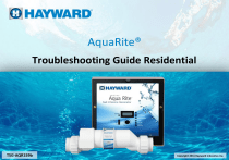 AquaRite® Troubleshooting Guide Residential TSG-AQR159b Copyright 2016 Hayward Industries Inc. Safety Precautions Warning High Voltage Electrocution Hazard Hazardous voltage can shock, burn, cause serious injury and or death. To reduce the risk of electrocution and or electric shock hazards: • Only qualified technicians should remove the panel • Replace damaged wiring immediately • Insure panel is properly grounded and bonded 2 ! Table of Contents How AquaRite® Works & Main PCB Layout How To: Change Metric to Standard & Change Default Reading Set TurboCell® Type & Reset Average Salt Adjust Chlorine Output & Clean TurboCell Troubleshooting: 1. Check Salt & Inspect Cell: flashing or ON 2. High Salt: LED ON 3. No Flow: LED flashing or ON 4. Display ONLY, Lights ONLY, or Neither 5. LCD: Displaying “HOT” or “COLD” Additional Information: Cell Compatibility Chart & Salt Addition Table Chlorine Output & Salt Levels Reading Serial Numbers 3 Pg. 4-5 Pg. 6-14 7-8 9-10 11-14 Pg. 15-37 16-19 20-24 25-29 30-35 36-37 Pg. 38-43 39-40 41-42 43 AquaRite: How It Works • The AquaRite Salt Chlorine Generator is designed to convert 99% pure salt into chlorine gas (HOCl). • The conversion occurs in the Electrolytic Cell, also known as the TurboCell® (used throughout this guide). • Power is sent from the AquaRite Control Center to the TurboCell, when chlorine production is scheduled (based on time percentage). • When power is applied to the TurboCell, conductive plates produce a field; which in-turn establishes an electrochemical reaction between Chloride ions & the water to create Hypochlorous Acid. 4 AquaRite: Main PCB Layout PCB Input Power (120/240VAC) B Transformer Input (120VAC & 120VAC) C External Control Jumper D Display Output (5-10VDC) E Rectifier Output (18-33VDC) F Comm Block – External Control (5-10VDC) G Transformer Output (12 VAC) H Chlorinator Fuse (20A – ATO style) I Rectifier Input (12 VAC) J Cell Input/Output K Flow Switch Input/Output E B C F D G H A I K 5 A J AquaRite® How To: How To: Switch from Metric to US Standard If the first reading (average salt) is displayed in decimal form instead of a number represented in thousands, then the unit has been set to ‘Metric Mode’. Step 1 Step 2 3.20 To change the unit from Metric Mode to US Standard, start by pressing the ‘Diagnostics’ button one time. 30 Once showing the temperature in Celsius, move the switch up to ‘Super Chlorinate’ then back to ‘Auto’. Step 4 Step 3 86 Immediately the temperature reading should change to reflect a Fahrenheit value. If it does not repeat step 2. 3200 After 30 seconds the unit should settle back to the default reading. The reading should now reflect a number in thousands. NOTE: The process is the same to go from US Standard to Metric. 7 How To: Change the Default Display If the first reading represents a number followed by the letter ‘P’, then the default reading has been changed to express the ‘Desired Output %’. Step 1 Step 2 77P AL-4 To change the default reading back to the average salt, start by pressing the ‘Diagnostics’ button two times. Step 4 Step 3 AL-0 Continue moving the switch up to ‘Super Chlorinate’ and back to ‘Auto’ until the display reads ‘AL-0’. 8 When the unit reads ‘AL-4’ move the switch up to ‘Super Chlorinate’ and back to ‘Auto’. 3200 It takes about 30 seconds for the unit to settle back on the default reading. It should now reflect the average salt level. How To: Set TurboCell Type Before operation, the AquaRite must be configured to the correct TurboCell installed. “t-15” is the factory default. If the incorrect cell is chosen the salt level will be inaccurate and the system will likely suspend chlorination as a result. Step 1 Step 2 t -15 3200 Start with the main toggle switch in the ‘Auto’ position. Step 4 Step 3 t -3 To change cell type, cycle slide switch up to ‘Super Chlorinate’. 9 Push the diagnostics button until ‘t - 15, t - 9, t -5 , t - 3’ appears. t -9 Return switch to ‘AUTO’. Repeat until display shows correct cell. How to: Reset Average Salt Level The Average Salt level needs to be reset after initial start up, after a board replacement, following major pool chemistry adjustments, and when a cell is replaced. Step 1 Step 2 -3200 1600 To reset, move the switch to ‘Off’ and then back to ‘Auto’. Wait for the relay to click (5 to 10 seconds). Press Diagnostics button 5 times to display the Instant Salt level. Wait for the number to stabilize. Step 4 Step 3 -3200 When the instant salt level is stable (and the negative sign still present), slide switch to ‘Super Chlorinate’ and back to ‘Auto’. 3200 It takes about 30 seconds for the unit to settle back on the default reading. It should now reflect the new average salt level. NOTE: Repeat this process once more to ensure both polarities are reading within 500ppm of each other. 10 How To: Adjust Chlorine Output The ‘Desired Output %’ dial, sets the level of cell operation in % of operating time, in 3 hour increments. Example: 50% (factory default) implies the cell is producing chlorine half the total pump/filter operating time; so the cell should produce chlorine for the first 90 minutes of 3 hours before repeating. Rotate dial to the left to lower chlorine production. Rotate dial to the right to raise chlorine production. NOTE: If the chlorine level does not increase within 24 hours after increasing output, test water using an independent test kit to determine the current salt, stabilizer, phosphate, and nitrate levels. More information related to chlorine production on Pages 41-42). NOTE: Output is scaled back to 20% or lower (depending on where the dial is set) at 60°F and chlorine production stops altogether at 50°F. 11 How To: Clean the TurboCell Cell cleaning frequency is dependent on several factors; pH & calcium levels have the greatest effect on how often cells requires cleaning. In pH environments betwe