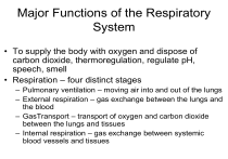 Major Functions of the Respiratory System • To supply the body with oxygen and dispose of carbon dioxide, thermoregulation, regulate pH, speech, smell • Respiration – four distinct stages – Pulmonary ventilation – moving air into and out of the lungs – External respiration – gas exchange between the lungs and the blood – GasTransport – transport of oxygen and carbon dioxide between the lungs and tissues – Internal respiration – gas exchange between systemic blood vessels and tissues Respiratory System • Consists of the respiratory & conducting zones • Respiratory zone – Site of gas exchange – Consists of bronchioles, alveolar ducts, and alveoli – Organs have thin, moist membranes providing large surface area for gas exchange • Conducting zone – Provides rigid conduits for air to reach the sites of gas exchange – Includes all other respiratory structures (e.g., nose, nasal cavity, pharynx, trachea) • Respiratory muscles – diaphragm and other muscles that promote ventilation Respiratory System Figure 21.1 Function of the Nose • The only externally visible part of the respiratory system: – Provides an airway for respiration – Moistens and warms the entering air – Filters inspired air and cleans it of foreign matter – Serves as a resonating chamber for speech – Houses the olfactory receptors Structure of the Nose • The nose is divided into two regions • The external nose, including the frontal & nasal bones, cartilage and external nares – – – – Bridge: superior connection to frontal bone Apex: cartilagenous tip Philtrum: a shallow vertical groove inferior to the apex The external nares (nostrils) are bounded laterally by the alae • The internal nasal cavity Structure of the Nose Figure 21.2b Nasal Cavity • Space within the internal nose, lies in and posterior to the external nose • Divided by a midline nasal septum – Formed from cartilage, the vomer and ethmoid bone • Opens posteriorly into the nasopharynx via posterior nasal apertures (internal nares) • The ethmoid and sphenoid bones form the roof • The floor is formed by the hard and soft palates • Lateral walls formed from pterygoid process of sphenoid and medial, superior and inferior conchae Nasal Cavity • Vestibule – nasal cavity superior to the nares – Lined with stratified squamous epithelium – Sweat glands, sebaceous glands and hair follicles – Vibrissae: hairs that filter coarse particles from inspired air • Olfactory mucosa – Lines the superior nasal cavity – Contains smell receptors • Respiratory mucosa – Lines the balance of the nasal cavity – Glands secrete mucus containing lysozyme and defensins to help destroy bacteria Nasal Cavity Figure 21.3b Nasal Cavity • During inhalation the conchae and nasal mucosa: – Filter, heat, and moisten air • Inspired air is: – Humidified by the high water content in the nasal cavity – Warmed by rich plexuses of capillaries – Attacked by lysozyme and defensins • Ciliated mucosal cells remove contaminated mucus • Sensitive mucosa triggers sneezing when stimulated by irritating particles • During exhalation these structures: – Reclaim heat and moisture – Minimize heat and moisture loss Paranasal Sinuses • Sinuses in bones that surround the nasal cavity – Ethmoid, sphenoid, frontal and maxillary • Sinuses lighten the skull • Help to warm and moisten the air – Lined with a mucous membrane of pseudostratified ciliated columnar epithelium Pharynx • Funnel-shaped passage of skeletal muscle that connects the: – Nasal cavity and mouth superiorly – Larynx and esophagus inferiorly • Extends from the base of the skull to the level of the sixth cervical vertebra • It is divided into three regions – Nasopharynx – Oropharynx – Laryngopharynx Nasopharynx • Lies posterior to the nasal cavity, inferior to the sphenoid, & superior to the level of the soft palate • Strictly an air passageway • Lined with pseudostratified columnar epithelium • Closes via uvula during swallowing to prevent food from entering the nasal cavity • Contains the pharyngeal tonsils (adenoids) • Pharyngotympanic (eustachian/auditory) tubes open into the lateral walls – Equalize pressure on both sides of the eardrum Oropharynx • Extends inferiorly from the level of the soft palate to the epiglottis • Opens to the oral cavity via an archway called the fauces • Serves as a common passageway for food and air • The epithelial lining is protective stratified squamous epithelium • Palatine tonsils lie in the lateral walls of the fauces • Lingual tonsil covers the base of the tongue • Tongue anchored at the base of the oropharynx Laryngopharynx • Serves as a common passageway for food and air • Lies posterior to the upright epiglottis • Extends to the larynx, where the respiratory and digestive pathways diverge – Air carried to anterior trachea – Food carried to posterior esophagus Larynx (Voice Box) • Attaches to the hyoid bone and opens into the laryngopharynx superiorly • Continuous with the trachea inferiorly • The three functions of the larynx are: – To provide a patent airway – To act as a switching mechanism to route air and food into the proper channels – To function in voice production (sound, not speech) Framework of the Larynx • Cartilages (hyaline) of the larynx – Thyroid cartilage: largest and most anterior with a midline laryngeal prominence (Adam’s apple); enlarges in response to testosterone – Cricoid cartilage: ring–shaped cartilage under thyroid cartilage; above 1st ring of the trachea – Three pairs of small arytenoid, cuneiform, and corniculate cartilages • Epiglottis – elastic cartilage that covers the laryngeal inlet (glottis) during swallowing Framework of the Larynx Figure 21.4a, b Vocal Ligaments • Attach the arytenoid cartilages to the thyroid cartilage • Composed of elastic fibers that form mucosal folds c
