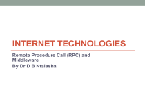 INTERNET TECHNOLOGIES Remote Procedure Call (RPC) and Middleware By Dr D B Ntalasha Programming clients and servers • Programmers who build clients and servers must deal with the complex issues of communication. • Although many of the needed functions are supplied by standard API such as the socket interface, programmers still face a challenge. • The socket calls require the programmer to specify many low-level details such as names, addresses, protocols and ports. • Small errors in the code that can easily go undetected when the program is tested can cause major problems when the program runs in production Conti • Programmers who write client and servers realise that multiple programs often follow the same general structure and repeat many of the same details. • That is, most client-server software systems follow a few basic architectural patterns. • Furthermore, because implementations tend to use the same standard API (e.g., the socket interface), much of the detailed code found in one program is replicated in others. • For example, all client programs that use a connectionoriented transport must create a socket, specify the server's endpoint address, open a connection to the server, send requests, receive responses and close the connection when interaction is complete. Conti • To avoid writing the same code repeatedly and to produce • • • • code that is both correct and efficient, programmers use automated tools to construct clients and servers. A tool is software that generates all or part of a computer program. The tool accepts a high-level description of the service to be offered, and produces much of the needed code automatically. The tool can not eliminate all programming - a programmer must supply code that performs the computation for the particular service. However, a tool can handle the communication details. As a result, the code contains fewer bugs. The remote procedure call paradigm • One of the earliest facilities that was created to help programmers write client-server software is known generally as a Remote Procedure Call (RPC) mechanism. • The idea of RPC arises from the observation that most programmers are familiar with procedure calls as an architectural construct. • When programmers build a large program, they begin by dividing the program into major pieces. • The most widely available programming language feature used for such divisions is the procedure. RPC Paradigm • A programmer begins by associating a procedure with • • • • • each major piece of the design. When implementing a program, the programmer uses procedures to keep the code manageable. Instead of defining a single, large procedure that performs many tasks, the programmer divides the tasks into sets and uses shorter procedures to handle each set. Thus the overall form of a program consists of a hierarchy of procedure calls. The procedural hierarchy of a program can be represented with a directed graph in which each node represents a procedure and an edge from node X to node Y means that procedure X contains a call to procedure Y. The graphical representation is known as a procedure call graph. Example • We can think of a main program that calls three • • • • • • procedures, A, B and C. Procedure A calls procedure D and procedure C calls two other procedures, E and F. To make procedures general and enable a given procedure to solve a set of related tasks, each procedure is parameterised. The procedure definition is given with a set of formal parameters. When the procedure is invoked, the caller supplies actual arguments that correspond to the formal parameters. Because parameterised procedures have worked well as a programming abstraction, researchers have examined ways to use a procedural abstraction to build clients and servers. Researchers have investigated ways to make client-server programming as much like conventional programming as possible Explanation • Unfortunately, most programming languages are designed to produce code for a single computer. • Neither the language nor the compiler are designed for a distributed environment - the code that is generated restricts the flow of control and parameter passing to a single address space. • Some researchers have investigated language modifications that embed client-server facilities in the language. • For example, Modula-3 and Java Remote Invocation (Java RMI) both have facilities that allow a program to invoke procedures on other computers conventional programming • Also, both have facilities that synchronise the computation • • • • • from separate machines to ensure consistent results. In other words: Because conventional programming languages do not allow procedure calls to pass from a program on one computer across a network to a program on another, tools are used to help programmers build client-server software using the procedure call abstraction. When using RPC, a programmer's attention is not focused on the computer network or communication protocols. Instead, the programmer is encouraged to think about the problem being solved. The programmer designs and builds the program using procedure calls as the basic architectural feature. Once a programmer has built a conventional program to solve the problem at hand, the programmer then considers how to divide the program into two pieces. Conventional programs • In essence, the programmer must partition the call graph into two parts. • The part that contains the main program and some of the procedures it calls becomes the client, while the remaining procedures become the server. • When selecting a set of procedures that comprise the client and a set that comprise the server, a programmer must consider data - the global data that each procedure references must be located on the same computer as the procedure. procedure call mechanism • RPC extends the procedure call mechanism to allow a • • • • • • pro