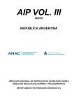 AIP VOL. III MAPRI REPÚBLICA ARGENTINA DIRECCIÓN NACIONAL DE INSPECCIÓN DE NAVEGACIÓN AÉREA DIRECCIÓN REGULACIÓN, NORMAS Y PROCEDIMIENTOS DEPARTAMENTO INFORMACIÓN AERONÁUTICA DEJADA INTENCIONALMENTE EN BLANCO / LEFT INTENTIONALLY IN BLANK DIRECCIÓN NACIONAL DE INSPECCIÓN DE NAVEGACIÓN AÉREA DEPARTAMENTO INFORMACIÓN AERONÁUTICA Dirección AFS: SABBYNYX Tel/Fax: (5411) 5941-3011 e-mail: dianac@anac.gov.ar AZOPARDO 1405 PISO 3º (C1104 ADY) - C.A.B.A. ARGENTINA AMDT AIP VOL. III 6 DICIEMBRE 2018 ENMIENDA N° 2/2018 AL AIP VOLUMEN III Fecha de efectividad de la presente: 31 de ENERO de 2019 La barra en el margen derecho de la lista de cartas, indica que la información ha sido modificada. Esta flecha es insertada en la lista de cartas, para indicar que se ha incorporado información nueva. SUP AIP A 10-16-20-21-22-26-38-42-44/2013 (No incorporados en la presente AMDT). _________________________________ -ACTUALICE SU DOCUMENTACIÓN- CONSULTE PERIÓDICAMENTE LOS NOTAM (http://www.anac.gov.ar/anac/web/index.php/2/310/informacion-aeronautica/notam) ÍNDICE AIP VOLUMEN III MANUAL DE PROCEDIMIENTOS INSTRUMENTALES Lista de Cartas “Aeródromos Internacionales/Nacionales” Generalidades Definiciones Abreviaturas Tablas y señales Simbología Lista de cartas STAR IAC SID y Planos de Aeródromos Internacionales y Nacionales. Pág. 1 Pág. 15 Pág. 25 Pág. 57 Pág. 65 Pág. 73 DEJADA INTENCIONALMENTE EN BLANCO AIP ARGENTINA VOL III (MAPRI) GENERALIDADES GENERALIDADES Gen 1- PREFACIO 1.1 Nombre de la autoridad responsable de la publicación La AIP Volumen III contiene el Manual de Procedimientos Instrumentales (MAPRI) publicado por el Departamento Información Aeronáutica, perteneciente a la Dirección Regulación, Normas y Procedimientos; dependiente de la Dirección de Inspección de Navegación Aérea. La realización y autorización de la cartografía y publicaciones de información aeronáutica necesaria para la circulación aérea se regirá por las prescripciones del Decreto N° 353 del 10 de Febrero de 1977. NOTA: Aquellos operadores propietarios del Manual de Procedimientos Instrumentales que estén haciendo uso del mismo con anterioridad a la fecha de la presente publicación podrán seguir haciendo uso de este documento con la sola salvedad de tener la cartografía (IAC, SID, STAR, Planos de AD) actualizada a la presente edición. 1.2 Documentos O.A.C.I. aplicados La documentación incluida en este Volumen está confeccionada de acuerdo con los contenidos de los siguientes documentos: • Anexo 4 al Convenio de Aviación Civil Internacional – Cartas Aeronáuticas. • Anexo 5 al Convenio de Aviación Civil Internacional – Unidades de Medida. • Anexo 6 al Convenio de Aviación Civil Internacional – Operación de Aeronaves. • Anexo 15 al Convenio de Aviación Civil Internacional – Información Aeronáutica. • Anexo 11 al Convenio de Aviación Civil Internacional – Servicios de Tránsito Aéreo. • DOC 8697 - AN/889/2 – Manual de Cartas Aeronáuticas. • DOC 8168 - Procedimientos para los Servicios de Navegación Aérea Operación de Aeronaves (PANS -OPS) de la OACI. • DOC 8400 - Procedimientos para los Servicios de Navegación Aérea – Abreviaturas y códigos de la OACI • DOC 9613 AN /937 Manual de Navegación basado en la performance (PBN) • DOC 9906 AN /472 Manual de Garantía de calidad para el diseño de procedimientos de vuelo. • DOC 9931 AN /476 Manual de operaciones de descenso continuo (CDO) • DOC 9993 AN /495 Manual de operaciones de ascenso continuo (CCO) DEPARTAMENTO INFORMACIÓN AERONÁUTICA Pág. 1 AIP ARGENTINA VOL III (MAPRI) • • GENERALIDADES DOC 9992 AN /494 Manual sobre el uso de la navegación basada en la performance ( PBN) en el diseño del espacio aéreo DOC 9997 AN /498 Manual de aprobación operacional de la navegación basada en la performance (PBN) 1.3 Contenido y estructura de la AIP VOL III El contenido fundamental es: • Salidas Normalizadas por Instrumentos (SID) • Cartas de Llegadas Normalizadas por Instrumentos (STAR) • Cartas de Aproximación por Instrumentos (IAC) • Planos de aeródromos Toda esta documentación está referida a los Aeródromos controlados Nacionales e Internacionales del país con procedimientos instrumentales. La presente publicación forma parte de la Documentación básica necesaria para la planificación y ejecución de un vuelo por instrumentos, juntamente con el manual de Aeródromos y Helipuertos (MADHEL) y la documentación integrada de información aeronáutica (AIP VOL I y II y sus enmiendas; Suplementos a la AIP, NOTAM y Boletines de Información Previa al Vuelo – PIB – AIC; listas de verificación y resúmenes). 1.3.1 Parte 1 La parte 1 consta de 6 secciones y contiene la información que se detalla a continuación: • Generalidades (GEN): Aspectos genéricos y de carácter informativo que hacen a este Volumen III. • Definiciones (DEF): Establecidas por OACI. • Abreviaturas (ABR): Detalle de las abreviaturas aeronáuticas. • • • • Tablas (TyS): Se presentan las que se consideran de utilidad para la planificación del vuelo por instrumentos. Señales de búsqueda y salvamento (TyS): Se adjuntan las reconocidas internacionalmente, para conocimiento de la comunidad aeronáutica en caso de ser necesario su uso. Alfabeto fonético Internacional y Código Morse (TyS). Simbología (SIMB): Descripción de aquellas que son de uso y aplicación en la documentación 1.3.2. Parte 2 La parte 2 contiene una Lista Recapitulativa de Cartas IAC/SID/STAR y Planos de aeródromos; Salidas Normalizadas por Instrumentos (SID); Llegadas Normalizadas por Instrumentos (STAR); Cartas de Aproximación por Instrumentos (IAC), de los Aeródromos controlados Nacionales e Internacionales del país. DEPARTAMENTO INFORMACIÓN AERONÁUTICA Pág. 2 AIP ARGENTINA VOL III (MAPRI) GENERALIDADES 1.4 Servicio a contactar en caso de detectar errores u omisiones en la documentación de este volu