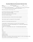 11 Functional Behavioral Assessment Interview Form Name ________________ Information Provider ________________Date___/___/___ Interviewer____________________ Interview method _______________________ How long have you known the person? ______ How often do you currently see the person? ________ How much time did you spend together this past week?_________ What are the person’s favorite things to do? _________________________________ ____________________________________________________________________ How often does she/he get to engage in those activities? _______________________ Who are some of her/his best friends? ______________________________________ How often does she/he get to see these friends?______________________________ Name some individual strengths __________________________________________ ____________________________________________________________________ What activities does she/he currently do that use those strengths?________________ _____________________________________________________________________ What activities might be an opportunity for those strengths? ____________________ ____________________________________________________________________ What forms of communication does she/he use? ____________________________ ____________________________________________________________________ Is special effort or training required by the receiver of the communication? ________ Does she/he have a universally understandable (UU) or an idiosyncratic signal (IS) to communicate the following: Example: Yes. (UU) nods head or says “yes” or (IS) high pitched squeak and hop Yes. ________________________________________________________________ No. _________________________________________________________________ More. _______________________________________________________________ Done. _______________________________________________________________ I want Xxxx. __________________________________________________________ I need Xxxx. __________________________________________________________ Greeting comment. _____________________________________________________ Departing comment. ____________________________________________________ What receptive communication modes does she/he respond to? (verbal, sign language, written words, picture cues, body language, visual schedule) ___________________________ ______________________________________________________________________ 12 Does she/he exhibit any disruptive behaviors? (e.g. screaming/task refusal) List behaviors ___________________________________________________________ ___________________________________________________________________ Does she/he exhibit any destructive behaviors? (e.g., aggression, self-injury, or property destruction) List behaviors _______________________________________ ______________________________________________________________________________________ Are medications taken that effect behavior? ___ How? ________________________ ____________________________________________________________________ Are there sleeping or eating issues that effect behavior? _______________________ ____________________________________________________________________ Are there other medical or physical problems that effect behavior (e.g. allergies/acid reflux/constipation)? ___________________________________________________ ____________________________________________________________________ During which activities does she/he have many problem behaviors? _____________ ____________________________________________________________________ During which activities does she/he have few or no problem behaviors? __________ ____________________________________________________________________ Does she/he show any behaviors that signal a problem behavior is likely to occur? (e.g. loud humming, foot tapping, pacing) __________________________________ ____________________________________________________________________ Does she/he have verbal communication that provides a warning problem behavior may soon occur? ______________________________________________________ How would she/he react to the following situations? Left alone with no preferred items for 15 minutes? ____________________________ ____________________________________________________________________ Left alone with preferred activities? ________________________________________ ____________________________________________________________________ With attention from a non-preferred person? _______________________________ ___________________________________________________________________ The person is required to complete an easy and preferred task? _________________ ____________________________________________________________________ 13 The person is required to complete an easy but non-preferred task? ____________________________________________________________________ ____________________________________________________________________ The person is required to complete a difficult task? ___________________________ ____________________________________________________________________ Would it make a difference in any of the above demand situations if attention/assistance is not available? _______________________________________ A preferred activity has to be discontinued to transition to a less preferred activity? __ ____________________________________________________________________ A preferred item or activity is unavailable? __________________________________ ____________________________________________________________________ A preferred person is unavailable? ________________________________________ ____________________________________________________________________ A setting which contains intense sensory stimulation (e.g., mall, fire drill, class hallways)? _______________________________________________________ List one event that is almost guaranteed to produce severe problem behavior. _____ ___________________________________________________________________