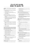 CÂU HỎI TRẮC NGHIỆM KINH TẾ QUỐC TẾ CHƯƠNG 1: LÝ THUYẾT CỔ ĐIỂN VỀ THƯƠNG MẠI QUỐC TẾ. b) Tài nguyên kinh tế của các quốc gia giao thương được khai thác có hiệu quả hơn. Câu 001: Theo quan điểm mậu dịch tự do của Adam Smith thì: c) Thu nhập của nền kinh tế thế giới cao hơn so với tình trạng tự cung tự cấp. d) Cả ba câu trên đều đúng. a) Mua bán giữa các quốc gia sẽ không bị cản trở bởi các hàng rào thương mại. Câu 007: Lợi ích kinh tế thế giới tăng thêm nhờ thực hiện theo yêu cầu của lý thuyết lợi thế tuyệt đối đã thể hiện rằng: b) Thị trường có tính chất cạnh tranh hoàn hảo. c) Chính phủ không nên can thiệp vào hoạt động kinh tế của các doanh nghiệp. a) Lý thuyết lợi thế tuyệt đối đúng trong mọi trường hợp. d) Cả ba câu trên đều đúng. b) Sự kết hợp hài hòa giữa chuyên môn hóa sản xuất với phân công lao động quốc tế là nguyên nhân cơ bản làm tăng tích cực lợi ích kinh tế. Câu 002: Thị trường có tính chất cạnh tranh hoàn hảo khi: a) Hầu hết các doanh nghiệp đều có qui mô nhỏ, không doanh nghiệp nào có khả năng chi phối lũng đoạn giá cả thị trường. c) Ngay cả một nước nhỏ bé (trình độ sản xuất còn thấp kém) cũng có thể thực hiện tốt yêu cầu của lý thuyết lợi thế tuyệt đối để tối ưu hóa lợi ích kinh tế. b) Sự cạnh tranh lành mạnh chỉ dựa trên chất lượng và giá cả sản phẩm, nên các doanh nghiệp có thể tham gia hay rút khỏi thị trường một cách dễ dàng. d) Cả ba câu trên đều đúng. c) Hai câu a và b đều đúng. d) Hai câu a và b đều sai. Câu 003: Lợi thế tuyệt đối là: a) Sự cao hơn tuyệt đối về năng suất và chi phí lao động để làm ra cùng một loại sản phẩm so với quốc gia giao thương. b) Sự cao hơn tuyệt đối về năng suất hoặc chi phí lao động để làm ra cùng một loại sản phẩm so với quốc gia giao thương. c) Hai câu a và b đều sai. d) Cả ba câu trên đều sai. Câu 004: Năng suất lúa bình quân của Thái Lan thường thấp hơn từ 20 – 30% so với Việt Nam. Nhưng do nhu cầu gạo nội địa cao hơn nên xuất khẩu gạo của Việt Nam chỉ đứng hàng thứ hai trên thế giới (xếp sau Thái Lan). Do vậy, sản xuất lúa gạo của Việt Nam có lợi thế tuyệt đối: a) Cao hơn so với Thái Lan, Việt Nam nên chuyên môn hóa sản xuất để xuất khẩu gạo cho Thái Lan. b) Cao hơn so với tất cả các nước có canh tác lúa nước trên thế giới, ngoại trừ Thái Lan. c) Cao hơn so với tất cả các nước có canh tác lúa nước trên thế giới, kể cả Thái Lan. d) Cao hơn so với Thái Lan, nhưng không chắc lợi thế so sánh có cao hơn hay không ? Câu 005: Lý thuyết lợi thế tuyệt đối yêu cầu mỗi quốc gia: Câu 008: Lý thuyết lợi thế tuyệt đối đặt quan hệ giao thương giữa các quốc gia trên cơ sở bình đẳng, các bên cùng có lợi. Điều đó có nghĩa là, so với trường hợp không trao đổi mậu dịch quốc tế: a) Lợi ích tăng thêm của các bên không nhất thiết phải bằng nhau. b) Lợi ích tăng thêm của các bên phải bằng nhau. c) Lợi ích tăng thêm của nước lớn phải nhiều hơn so với nước nhỏ. d) Lợi ích tăng thêm của nước nhỏ phải nhiều hơn so với nước lớn. Câu 009: Theo lý thuyết tính giá trị bằng lao động (Labour Theory) thì: a) Lao động là yếu tố chi phí duy nhất để sản xuất ra sản phẩm. b) Lao động là yếu tố đồng nhất (Homogeneous), được sử dụng với cùng tỷ lệ trong mọi sản phẩm. c) So sánh giữa các ngành sản xuất khác nhau, trị tuyệt đối năng suất của ngành nào lớn hơn thì ngành đó có lợi thế tuyệt đối cao hơn. d) Cả ba câu trên đều đúng. Câu 010: Theo mô hình thương mại quốc tế đơn giản (hai quốc gia và hai sản phẩm) của David Ricardo, thì: a) Lợi suất kinh tế theo qui mô không đổi vì kỹ thuật sản xuất giống nhau giữa hai quốc gia và chi phí sản xuất giống nhau giữa hai loại sản phẩm. b) Mậu dịch tự do nên hàng hóa, dịch vụ và các yếu tố sản xuất di chuyển dễ dàng qua các biên giới quốc gia mà không phải tính chi phí vận chuyển. a) Chuyên môn hóa sản xuất vào các sản phẩm có lợi thế tuyệt đối; b) Xuất khẩu sản phẩm có lợi thế tuyệt đối; đồng thời, nhập khẩu sản phẩm không có lợi thế tuyệt đối. c) Hai câu a và b đều đúng. d) Cả ba câu trên đều đúng. c) Hai câu a và b đều đúng. d) Cả ba câu trên đều đúng. Câu 011: Dấu hiệu cơ bản để nhận biết sản phẩm có lợi thế so sánh là: Câu 006: Lợi ích kinh tế khi thực hiện theo yêu cầu của lý thuyết lợi thế tuyệt đối: a) Năng suất cao hơn so với sản phẩm cùng loại của quốc gia giao thương. a) b) Năng suất cao hơn tất cả sản phẩm còn lại ở trong nước. Là mối lợi “kép” trên cả 2 chiều xuất khẩu và nhập khẩu. c) Sản phẩm có lợi thế tuyệt đối so với sản phẩm còn lại ở trong nước, bất kể nó có lợi thế tuyệt đối so với sản phẩm cùng loại của quốc gia giao thương hay không. d) Cả ba câu trên đều đúng. b) EX2/EW là tỷ trọng của kim ngạch xuất khẩu X trong t