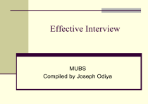Effective Interview MUBS Compiled by Joseph Odiya Learning outcome The meaning of Interview The preparation required to excel in the interview The interview processes The different types of interviews The Dos and don’t of Interview Interview tips The FAQ in interview Your questions in the interview The different web resources for interview Qualities employers look for in the interview Business Interviews 2 Facts of Interviewing Interviews are the most widely used process for screening job applicants. They provide the most direct information about a candidate’s background, personality, and skills. The purpose of an interview is to receive the job offer. Business Interviews 3 Facts of Interviewing cont’d.. Interview = A meeting with an objective Employer’s objective is to find the best person for the job Employer: reviews candidate’s experience and abilities Can you do the job? (skills, abilitie, qualifications) Will you do the job? (interest, attitude & motivation) How will you fit into the organisation? (personality) You: impress employer and assess position on offer What does this position offer me? How does it fit with my career plans? Congratulations - you have passed the first hurdle You must prove that you are the most suitable candidate for this position Business Interviews 4 Interview Preparation Situational Knowledge Where/when the interview takes place Arrive 10 minutes early! Mental Preparation Knowledge of company Practice a mock interview Physical Preparation Get plenty of rest Dress for success Written Preparation Take extra resumes, references, etc. Make notes Ask questions Business Interviews 5 Interview Preparation cont’d Review own skills, experiences and qualities Research organisation Websites, reports, articles, company literature, etc Contacts with knowledge of organisation or sector Relevant articles in the press Personal visit or telephone call Research job and occupational area Check CV Anticipate questions and identify relevant examples Prepare key selling points Job description – or similar Current issues Prepare your questions Business Interviews Practice 6 Watch the Body Language First impressions very powerful Halo effect or Devil effect Allow time to relax Dress appropriately Entrance, introductions & handshake Smile and make eye contact Be aware of own movements Watch body language of interviewer Business Interviews 7 Know Yourself Employment objective and how it relates to the position and the employer Educational background and how it relates to the position and the employer Work experience Abilities and skills Always be able to give examples! Business Interviews 8 Know the Employer Research! Research! Research! Prepare to demonstrate your knowledge of the profession and the company Prepare to give reasons for your interest in working in that profession/company Develop questions in advance to ask about the job/organization Business Interviews 9 What creates a bad impression Poor personal appearance Negative attitude – evasive, using excuses Lack of interest and enthusiasm Lack of preparation Poor knowledge of role Failure to give concrete examples of skills Over emphasis on money/rewards Lack of career plan Business Interviews 10 Types of Interviews Interviews are categorized broadly in two categories; information oriented and feelings. A. Information oriented interview 1. Job interview: The employers wants to know about applicant’s suitability (ability and experience) for the job applied for. It’s normally formal and structured 2. Information interview: The interviewer seeks facts that bears on a decision or contribute to basic understanding. 3. Persuasive interviews: Here a person tells an idea with justification why the employer should accept certain recommendation e.g. a new product 4. Exit interviews: This is conducted to understand and get insight on why the interviewee is leaving the organisation. Business Interviews 11 Types of Interviews cont.…. Interviews are categorized broadly in two categories; information oriented and feelings. B. Interview focused on feelings; 5. Evaluation interview: The employers wants to know the performance and progress of the interviewee over the year and his ability to take up higher position. 6. Counseling interview: The supervisor talks with an employee about personal problems that are interfering with his work performance. 7. Conflict resolution interviews: Two conflicting parties sit together to identify and resolve their conflict in order to create a productive environment 8. Disciplinary interviews: a supervisor tries to correct the behaviour of an employee who has ignored the organisation’s rules and regulations to enable them realise their mistakes.. 12 Business Interviews Forms of Interviews Basic/traditional interview Telephone interview Group interview Interview during a meal or social occasion Serial interview Business Interviews 13 Telephone Interviews Prepare as thoroughly as for ‘real’ interview Select comfortable, private, quiet place Advise neighbours you are answering phone Have copy of CV and company information Have pen and paper at hand Prepare for usual interview questions Practice on phone Record answers Try standing Smile and use gestures Avoid monotones Be yourself Business Interviews 14 Other forms of Interview Rotating Like one-to-one with different interviewers Group 6-8 candidates Group observed while discussing topic Be aware of group interaction Panel 2-5 interviewers, or as many as 13!! Try to identify different roles Respond to interviewer, include others through eye contact May involve presentation Business Interviews 15 Assessment Centres Company premises or neutral venue Includes social or informal events Meeting with recent graduates or managers Activities include: Group exercises Practical tasks and exercises Report writing Oral Presentations Psychometric assessments Interviews Simulates real work environment Business Interviews 16 Psychometric Tests Ap