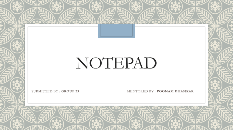 NOTEPAD SUBMITTED BY : GROUP 23 MENTORED BY : POONAM DHANKAR INTRODUCTION To learn how to build your text editor like Notepad using python. This is a detailed tutorial with code and explanation using which you will be able to create your text editor. Tkinter is a GUI library from python from which we can create multiple GUI apps. Here, using tkinter we will develop a notepad like text editor. This notepad will have the menu where we can create new file, open existing file, save the file, editing, cut and paste, all functionality will there. Prerequisite 1. Python installed. 2. Tkinter installed. ABOUT Notepad is a simple text editor for Microsoft Windows that allows users to create text documents, save them as plain text, and edit plaintext files. It is extremely useful for viewing or writing relatively short text documents saved as plain text. 1. The File menu has options like New, Open, Save, Save As, and Exit. 2. The Edit menu has options like Cut, Copy, Paste, Delete, Find, Select All, and Time/Date. MENU ITEMS Our notepad will have four main menu items: File, Edit, Commands & Help. Our file menu item will have four sub-items- New, Open, Save & Exit. Our edit menu item will have three sub-items- cut, copy & paste. And our help menu will have one subitem- About notepad FUNCTIONALITY OF MENU ITEMS Now we have the menu items ready, now we are going to add functionality to each of the menu items. Below the list of functionality, we going to add to this notepad (of course you can add many others too). • Open file • New file • Save file • Quit Application • Show About • Cut • Copy • Paste FACILITIES REQUIRED SOFTWARE • Python • Pycharm LIBRARIES • Tkinter Firstly we need to import tkinter after installing it for python import tkinter import os from tkinter import * # To get the space above for message from tkinter.messagebox import * # To get the dialog box to open when required from tkinter.filedialog import The above code will enable tkinter for further use Next up, we need a menu bar for the notepad we are developing, the code for that will be as follows # Add controls(widget) self.__thisTextArea.grid(sticky = N + E + S + W) # To open new file self.__thisFileMenu.add_command(label = "New", command = self.__newFile) # To open a already existing file self.__thisFileMenu.add_command(label = "Open", command = self.__openFile) # To give a feature of cut self.__thisEditMenu.add_command(label = "Cut", command = self.__cut) # To give a feature of copy self.__thisEditMenu.add_command(label = "Copy", command = self.__copy) # To save current file # To give a feature of paste self.__thisFileMenu.add_command(label = "Save", self.__thisEditMenu.add_command(label = "Paste", command = self.__saveFile) command = self.__paste) # To create a line in the dialog self.__thisFileMenu.add_separator() # To give a feature of editing self.__thisMenuBar.add_cascade(label = "Edit", # To terminate menu self.__thisFileMenu.add_command(label = "Exit", = self.__thisEditMenu) command = self.__quitApplication) self.__thisMenuBar.add_cascade(label = "File", menu = self.__thisFileMenu) # To create a feature of description of the notepad self.__thisHelpMenu.add_command(label = "About Notepad", command = self.__showAbout) self.__thisMenuBar.add_cascade(label = "Help", menu = self.__thisHelpMenu) self.__root.config(menu = self.__thisMenuBar) self.__thisScrollBar.pack(side = RIGHT, fill = Y) # Scrollbar will adjust automatically # according to the content self.__thisScrollBar.config(command = self.__thisTextArea.yview) self.__thisTextArea.config(yscrollcommand = self.__thisScrollBar.set) Further ahead, we need to add the MENU and the FUNCTIONALITY of our notepad, and then merge all these three segments of code into one for compilation using tkinter (the codes for those are very long and will be put in the report for this project) after that we will save the filename with the extension .py and run our code to check, outputs in next slide THANK YOU