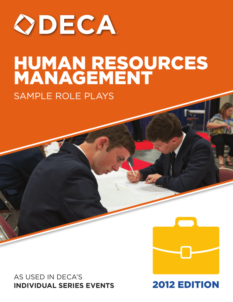 HUMAN RESOURCES MANAGEMENT SAMPLE ROLE PLAYS AS USED IN DECA’S INDIVIDUAL SERIES EVENTS 2012 EDITION Human Resources Management Individual Series Events DECA Images 1908 Association Drive Reston, Virginia 20191-1594 DECA Images Published 2012 by DECA Images. Copyright © 2012 by DECA Inc. No part of this publication may be reproduced for resale without written permission from the publisher. Printed in the United States. 1 2 Human Resources Management TABLE OF CONTENTS Introduction......................................................................................................................3 Role Plays Role Play #1................................................................................................................5 Role Play #2..............................................................................................................11 Role Play #3..............................................................................................................17 Role Play #4..............................................................................................................23 INTRODUCTION This publication is designed to assist DECA members and their local chapter advisors in preparing for the Individual Series Events. This document will be useful in preparing students for local, state and international competition by familiarizing them with the format, structure and evaluation tools used in international competition. This series of events is presented as an example of the types of events in which a student might expect to participate at the International Career Development Conference. The competitive events found herein, however, are not representative of all performance indicators that the student may be expected to demonstrate on the international level. A complete list of performance indicators upon which the events are written can be found at www.deca.org/competitions/2/. PROCEDURE An individual series event consists of two major parts: a written comprehensive exam and two preliminary role-playing events. A third role-play activity will be given to finalists. The comprehensive exam is a 100-question multiple-choice test developed especially for each series based on the knowledge, skills and attributes associated with the particular occupation. Exams from previous years are available for sale through DECA Images at www.deca.org/shop. In the role-playing portion of the event, participants must accomplish a task by translating what they have learned into effective, efficient and spontaneous action. The participant is given a situation to review. It may indicate a product or service to sell, a merchandising decision or a problem in communication and interpersonal skills. Participants are allowed 10 minutes to review the situation and to develop a professional approach to solving the problem. Up to 10 minutes are then allowed for the participant to be examined by a competent judge and asked to explain how (s)he would solve the situation or problem. The judge is a qualified business executive playing the role of second party in the situation. Following the examination, the judge evaluates the participants’ responses and records the results on an evaluation form which has been developed specifically for each competitive event. 3 PREPARATION In order for DECA members to realize success in competition, DECA advisors are encouraged to carefully plan curriculum which will contribute to student success in the competency based competitive events and to provide real world experiences specifically necessary in the occupational area for which the student has a career interest. Competency based competitive events are intended to be a motivational tool used by the DECA advisor to encourage student learning. The success of the member’s participation in competency based competitive events directly relates to the experiences (s)he has gained in the classroom and / or at the training station. As the local, district, state or international competitive event approaches, the advisors are encouraged to further prepare the competitor in tasks such as the following: Prepare yourself mentally. The competitor should get sufficient sleep the night before competition so that (s)he will be mentally alert and able to concentrate on the activities. Dress appropriately. Professional dress should be worn to all conference sessions. Please note: Competitors at the ICDC must wear an official DECA blazer during interaction with the judges. Official DECA blazers are sold through DECA Images. Follow the program agenda. Competitors should carefully follow the program agenda provided at the conference. (S)he should locate the event room beforehand and arrive at the site early enough to be acclimated to the environment, relaxed, etc. Competitors must be on time for each event. Use preparation time wisely. Competitors should take advantage of the time provided for each activity of the event. During the written tests, the competitor should think through each item completely and carefully while gauging the time appropriately. If time allows, recheck the answers. While preparing for role play events, competitors should use all the time allotted constructively. 4 CAREER CLUSTER Business Management and Administration CAREER PATHWAY Human Resources Management INSTRUCTIONAL AREA Human Resources Management HUMAN RESOURCES MANAGEMENT SERIES EVENT PARTICIPANT INSTRUCTIONS PROCEDURES 1. The event will be presented to you through your reading of these instructions, including the Performance Indicators and Event Situation. You will have up to 10 minutes to review this information to determine how you will handle the role-play situation and demonstrate the performance indicators of this event. During the preparation period, you may make notes to use during the role-play situation. 2. You will have up to 10 minutes to role-play your situation with a judge (you may have more than one judge). 3. You will be evaluate