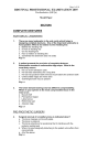 Page 1 of 10 BDS FINAL PROFESSIONAL EXAMINATION 2007 Prosthodontics (MCQs) Model Paper SECTION I COMPLETE DENTURES ANATOMICAL LANDMARKS 1. There are many landmarks in the oral cavity which helps in designing complete dentures. One of the important landmarks is fovea palatini. What is its relation to the vibrating line: a. Behind the vibrating line b. In front of vibrating line c. On the vibrating line d. Has no relation to vibrating line e. sometimes this landmark does not exists Key: b 2. A patient presents for provision of complete dentures. Examination reveals an unfavorable ridge slope. What is the most likely reason: a. He is a recent extraction case b. He has been edentulous for a long time c. He has had posterior teeth removed much before the anterior teeth d. Unfavourable ridges are never seen e. Submerged tooth may be present Key: a 3. The lower denture bearing area has different compressibility. Which in your opinion is the most compressible tissue in the lower arch; a. Buccal shelf b. Premylohoid region c. Labial sulcus d. Retromolar pad e. Alveolar ridge Key: d PRE-PROSTHETIC SURGERY 4. Surgical removal of a maxillary torus is indicated when? a. The torus impinges on the soft palate b. The torus is undercut c. The torus extends so far posteriorly that it interferes with the posterior palatal seal d. When it is psychologically disturbing to the patient who suffers from cancerphobia e. All of the above Key: e Page 2 of 10 BDS FINAL PROFESSIONAL EXAMINATION 2007 Prosthodontics (MCQs) Model Paper DENTURE SUPPORT 5. How will the alveolar ridge respond to a mandibular complete denture base that terminates short of retromolar pad: a. Marked ridge resorption will occur b. The apposition of bone on the ridge will occur c. The alveolar ridge will not be affected at all d. Soreness of the soft tissue e. Fracture of the ridge may occur Key: a 6. The primary denture support area for a mandibular complete denture is: a. The vestibule b. The buccal shelf c. The palatopharyngeal fold d. The franulum e. All of the above Key: b IMPRESSION TECHNIQUES 7. There are many impression techniques which are used in recording impressions of the edentulous areas. Which impression technique will be used in a patient with a sharp mandibular ridge? a. Minimum pressure impression technique b. Selective pressure impression technique c. Excessive pressure impression technique d. All of the above of impression techniques Key: a JAW REGISTRATION 8. The position of the upper occlusal rim in the articulator is adjusted by: a. Arbitrary means b. By using a facebow c. By adjusting the intercondylar distance d. By adjusting the incisal pin e. Visually Key: b 9. A loss in vertical dimension in complete denture will cause the mandible to move: a. Backward in relation to upper jaw b. Forward in relation to upper jaw c. No change in the position of the jaws d. Loss of vertical dimension is very rare e. In eccentric movements Key: b Page 3 of 10 BDS FINAL PROFESSIONAL EXAMINATION 2007 Prosthodontics (MCQs) Model Paper 10. While recording the rest position of the mandible, the patient’s: a. Head should be upright and unsupported b. Head should be supported by the head rest c. Patient should be lying in repose position d. The neck should be extended e. Head can be in any position Key: a SETUP OF TEETH 11. The correct bucco-lingual placement of the teeth plays an important role in phonation. What should be the relationship of teeth and tongue in pronouncing “t” and “d” sounds: a. The tongue will protrude forwards b. Contact of the tip of the tongue with the anterior palate and lingual surfaces of the maxillary anterior teeth c. The lips will contact with each other only d. Constricted palate form e. No relationship is present Key: b OCCLUSION 12. Balanced occlusion in complete denture is essential: a. For the patient to masticate properly b. For the dentures to have adequate retention c. To ensure even pressure in all parts of the arch, which maintains the stability of the dentures when the mandible is in centric and eccentric position. d. Balanced occlusion is not essential in complete dentures e. For aesthetic purposes Key: c POST INSERTION COMPLAINTS 13. A patient is referred to the prosthodontist with complaint of a newly made denture which is loose and causes soreness even after repeated adjustments. What is the most important protocol to follow in such a case? a. To check the occlusion b. To take another impression denture immediately c. To relieve the denture at the sore spots d. To ask the patient to use denture fixatives e. To tolerate the denture Key: a Page 4 of 10 BDS FINAL PROFESSIONAL EXAMINATION 2007 Prosthodontics (MCQs) Model Paper 14. A complete denture wearer, reports complaining of discomfort with his dentures. On examination it is observed that the posterior teeth are set edge to edge, without horizontal overjet, the possible discomfort may be: a. Gagging b. Cheek biting c. Reduced taste d. Speech aberrations e. Lip biting Key: b 15. After the provision of complete denture the first review appointment for evaluating the new dentures should be carried out after: a. 03 hours after delivery b. 12 hours after delivery c. 24 hours after delivery d. 36 hours after delivery e. 48 hours after delivery Key: c MUSCLE BALANCE 16. The oral muscular forces have a definitive effect, on the position of the mandible. What position will the mandible be braced during typical empty mouth swallowing? a. The intercuspal position b. The retruded contact position c. The protruded contact position d. Centric relation e. Eccentric relation Key: a 17. An overextended disto buccal corner of a mandibular denture will push against which muscle during function: a. Zygomaticus b. Orbicularis c. Temporalis d. Masseter e. Buccinator Key: d 18. Mandibular movement pattern of complete denture patients and those with natural teeth are: a. Same b. Mandibular movement in complete denture patients are completely different c. Mandibu