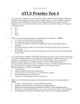 mcatest.wixsite.com/atls ATLS Practice Test 4 1. A 25-year-old man, injured in a motor vehicular crash, is admitted to the emergency department. His pupils react sluggishly and his eyes open to painful stimuli. He does not follow commands, but he does moan periodically. His right arm is deformed and does not respond to painful stimulus; however, his left hand reaches toward it. Both legs are stiffly extended. His Glasgow Coma Scale score is a. two b. four c. six d. nine e. twelve 2. Which one of the following statements concerning massive hemothorax is TRUE? a. It is usually caused by blunt thoracic trauma. b. It is commonly confused with a pneumothorax. c. The diagnosis should be confirmed by upright, plain chest roentgenograms prior to treatment. d. The initial draining of 1,000 mL of blood after chest tube insertion requires immediate thoracotomy. e. The condition should be suspected in situations associated with shock and unilateral absent breath sounds. 3. A 25-year-old man is brought to the hospital after being involved in a motor vehicular crash when his car struck a bridge abutment. He is intoxicated, has a Glasgow Coma Scale score of 13, and complains of abdominal pain. His blood pressure was 80 mm Hg systolic by palpation on admission to the hospital, but it rapidly increased to 110/70 with the administration of intravenous fluids. His heart rate is now 120 beats per minute. The chest roentgenogram shows loss of the aortic knob, widening of the mediastinum, no rib fractures, and no hemopneumothorax. Contrast CT angiography a. is not indicated. b. should be performed after tube thoracostomy. c. is not necessary if non-contrast CT scan of the chest is normal. d. should be performed after a FAST scan. e. is positive for aortic rupture in 80% of similar cases. 4. Which one of the following statements regarding abdominal trauma in the pregnant patient is TRUE? a. The fetus is in jeopardy only with major abdominal trauma. b. Leakage of amniotic fluid is an indication for hospital admission. c. Indications for peritoneal lavage are different from those in the nonpregnant patient. d. Penetration of an abdominal hollow viscus is more common in late than in early pregnancy. e. The secondary survey follows a different pattern from that of the nonpregnant patient. 1 mcatest.wixsite.com/atls 5. The first maneuver to improve oxygenation after chest injury is a. intubate the patient. b. assess arterial blood gases. c. administer supplemental oxygen. d. ascertain the need for a chest tube. e. obtain a lateral cervical spine roentgenogram. 6. A 17-year-old helmeted motorcyclist loses consciousness when he is struck broad side by an automobile at an intersection. He arrives in the emergency department with a blood pressure of 140/92, pulse rate of 88 beats per minute, a respiratory rate of 18 breaths per minute, and a Glasgow Coma Scale score of seven. Appropriate initial immobilization of this patient should include a semi-rigid cervical collar and a. a scoop stretcher. b. a long spine board. c. a short spine board. d. cervical traction tongs. e. pneumatic antishock garment. 7. A 34-year-old man is brought to the hospital after being pinned to the wall of a building by a cement truck. He is in obvious shock, and has deformities and marked swelling of both thighs, although no open wounds are present. His shock a. cannot be explained without concomitant pelvic fracture. b. signifies a loss of approximately 15% of his blood volume. c. is consistent with blood loss from bilateral femoral fractures. d. will likely be reversed if appropriate traction splints are applied. e. cannot be explained by his observed injuries unless a major arterial injury exists. 8. Prior to passage of a urinary catheter, it is essential to a. examine the abdomen. b. determine pelvic stability. c. examine the rectum and perineum. d. perform a retrograde urethrogram. e. know the history and mechanism of injury. 9. The best guide for adequate fluid resuscitation of the burn patient is a. adequate urinary output. b. reversal of systemic acidosis. c. normalization of the heart rate. d. a normal central venous pressure. e. total fluids in 24 hours = 4 x weight (kg) x percent body surface area burned. 2 mcatest.wixsite.com/atls 10. The LEAST likely cause of a depressed level of consciousness in the multisystem injured patient is a. shock. b. head injury. c. hyperglycemia. d. impaired oxygenation. e. alcohol and other drugs. 11. Establishing a diagnosis of shock must include a. confirming hypoxemia. b. the finding of acidosis. c. confirming increased vascular resistance. d. documenting hypotension and low cardiac output. e. evidence of inadequate perfusion of the body's organs. 12. A seven-year-old boy is brought to the emergency department by his parents several minutes after he fell through a window. He is bleeding profusely from a 6 cm (2.4 inch) wound of his medial right thigh. Immediate management of the wound should consist of a. application of a tourniquet. b. direct pressure on the wound. c. apply a hemostat to bleeding vessels. d. direct pressure on the femoral artery at the groin. e. application of the pediatric PASG and inflation of the right leg compartment. 13. For the trauma patient with cerebral edema, hypercarbia should be avoided to prevent a. metabolic acidosis. b. respiratory acidosis. c. cerebral vasodilatation. d. neurogenic pulmonary edema. e. reciprocal high levels of PaCO2. 14. A 23-year-old man sustains four stab wounds to the right upper hemithorax during an altercation and is brought by ambulance to a community hospital. The wounds are all above the nipple. He is endotracheally intubated, closed tube thoracostomy is performed, and two liters of Ringer's lactate solution are infused through two large-calibre IVs. His blood pressure now is 60/0, pulse rate is 160 beats per minute, and respiratory rate is 14 breaths per minute (ventilated with 100% O2). The most appropriate next step in managing this patien