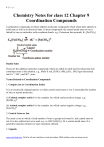 1|Page Chemistry Notes for class 12 Chapter 9 Coordination Compounds Coordination compounds are those addition molecular compounds which retain their identity in solid state as well as in dissolved state. In these compounds. the central metal atom or ion is linked by ions or molecules with coordinate bonds. e.g., Potassium ferrocyanide, K 4 [Fe(CN)6]. Double Salts These are the addition molecular compounds which are stable in solid state but dissociate into constituent ions in the solution. e.g., Mohr’S salt, [FeSO4·(NH4)2SO4 . 6H2O get dissociated into Fe2+, NH+4 and SO2-4 ions. Terms Related to Coordination Compounds 1. Complex ion or Coordination Entity It is an electrically charged species in which central metal atom or ion is surrounded by number of ions or neutral molecules. (i) Cationic complex entity It is the complex ion which carries positive charge. e.g., [Pt(NH3)4]2+ (ii) Anionic complex entity It is the complex ion which carries negative charge. e.g., [Fe(CN)6]42. Central Atom or Ion The atom or ion to which a fixed number of ions or groups are bound is .ned central atom or ion. It is also referred as Lewis acid. e.g., in (NiCI2(H2O)4]. Ni is central metal atom. It is generally transition element or inner-transition element. 3. Ligands www.ncerthelp.com (Visit for all ncert solutions in text and videos, CBSE syllabus, note and many more) 2|Page Ligands is electron donating species (ions or molecules) bound to the Central atom in the coordination entity. These may be charged or neutral. LIgands are of the following types : (i) Unidentate It is a ligand, which has one donor site, i.e., the ligand bound to a metal ion through a single donor site. e.g., H2O, NH3, etc. (ii) Didentate It is the ligand. which have two donor sites. (iii) Polydentate It is the ligand, which have several donor sites. e.g., [EDTA]4- is hexadentate ligand. (iv) Ambidentate ligands These are the monodentate ligands which can ligate through two different sites, e.g., NO-2, SCN-, etc. (v) Chelating ligands Di or polydentate ligands cause cyclisation around the metal atom which are known as chelate IS , Such ligands USes two or more donor atoms to bind a single metal ion and are known as chelating ligands. More the number of chelate rings, more is the stability of complex. The stabilisation of coordination compounds due to chelation is known as chelate effect. π – acid ligands are those ligands which can form π – bond and n-bond by accepting an appreciable amount of 1t electron density from metal atom to empty π or π – orbitals. 4. Coordination Number It is defined as the number of coordinate bonds formed by central metal atom, with the ligands. www.ncerthelp.com (Visit for all ncert solutions in text and videos, CBSE syllabus, note and many more) 3|Page e.g., in [PtCI6]2-, Pt has coordination number 6. In case of monodentate ligands, Coordination number = number of ligands In polydentate ligands. Coordination number = number of ligands * denticity 5. Coordination Sphere The central ion and the ligands attached to it are enclosed in square bracket which is known as coordination sphere. The ionisable group written outside the bracket is known as counter ions. 6. Coordination Polyhedron The spatial arrangement of the ligands which are directly attached to the central atom or ion, is called coordination polyhedron around the central atom or ion. 7. Oxidation Number of Central Atom The charge of the complex if all the ligands are removed along with the electron pairs that are shared with the central atom, is called oxidation number of central atom. e.g., [CU(CN4)3-, oxidation number of copper is +1, and represented as Cu(I). Types of Complexes 1. Homoleptic complexes Complexes in which the metal atom or ion is linked to only one kind of donor atoms, are called homoleptic complexes e.g., [Co(NH3)6]3+ 2. Heteroleptic complexes Complexes in which the metal atom or ion is linked to more than one kind of donor atoms are called heteroleptic complexes e.g., [Co(NH3)4CI2]+ 3. Labile and Inert complexes Complexes in which the ligand substitution is fast are known as labile complexes and in which ligand substitution is slow, are known as inert complexes. Effective Atomic Number (EAN) www.ncerthelp.com (Visit for all ncert solutions in text and videos, CBSE syllabus, note and many more) 4|Page This concept was proposed by Sidgwick. In a complex, the EAN of metal atom is equal to the total number of electrons present in it. EAN = Z – ON of metal + 2 * CN (where, Z = atomic number of metal atom ON = oxidation number of metal and CN = coordination number of complex) An ion with central metal atom having EAN equal to next inert gas will be more stable. IUPAC Naming of Complex Compounds Naming is based on set of rules given by IUPAC. 1. Name of the compound is written in two parts (i) name of cation, and (ii) name of anion. 2. The cation is named first in both positively and negatively charged coordination complexes. 3. The dissimilar ligands are named in au alphabetical order before the name of central metal atom or ion. 4. For more then one similar ligands. the prefixes di, tri, tetra, etc are added before its name. If the di, tri, etc already appear in the complex then bis, tris, tetrakis are used. 5. If the complex part is anion, the name of the central metal ends with suffix ‘ate’. 6. Names of the anionic ligands end in ‘0’, names of positive ligands end with ‘ium’ and names of neutral ligands remains as such. But exception are there as we use aqua for H2O, ammine for NH3, carbonyl for CO and nitrosyl for NO. 7. Oxidation state for the metal in cation, anion or neutral coordination compounds is indicated by Roman numeral in parentheses. 8. The name of the complex part is written as one word. 9. If the complex ion is a cation, the metal is named same as the element. 10. The neutral complex molecule is named similar to that of the complex cation. Some examples are (i) [Cr(NH3)3(H2O)3]Cl3 triammine