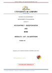 CACC011 -Module 5- VAT -Question Book AND Memo - 2021 UNIVERSITY OF LIMPOPO TURFLOOP CAMPUS SCHOOL OF ACCOUNTANCY DEPARTMENT OF ACCOUNTING CACC011 ACCOUNTING 1 - QUESTION BOOK AND MEME MODULE 5 - VAT - All QUESTIONS PAGES (19) Prepared by: Mr TG MALEKA AND MR G NYIRENDA- (MAY 2021) ACCOUNTANCY DREAM @ UL COPYRIGHT RESERVED – A BRANDT , R PRINSLOO, G NYIRENDA & TG MALEKA 1 CACC011 -Module 5- VAT -Question Book AND Memo - 2021 CONTENTS PAGE QUESTION 1: 3-5 QUESTION 2: 6 - 16 QUESTION 3: 17 - 19 COPYRIGHT RESERVED – A BRANDT , R PRINSLOO, G NYIRENDA & TG MALEKA 2 CACC011 -Module 5- VAT -Question Book AND Memo - 2021 MODULE 5 - QUESTION 1.1 A) The following are the selling price of goods including 15% VAT. Calculate the VAT that is included in each selling price: o 1.1 - R 3.65 o 1.2 - R 14.90 o 1.3 - R 356.98 o 1.4 - R 3 980.00 o 1.5 - R 13 540.00 o 1.6 - R 4 560 000.00 B) The following are the selling price of products excluding 15% VAT. Calculate the selling price inclusive of VAT: o 1.1 - R 1.20 o 1.2 - R 18.50 o 1.3 - R 54.00 o 1.4 - R 168.00 o 1.5 - R 13 460.00 o 1.6 - R 210 530.00 C) The following are the selling price of products including 15% vat. calculate the selling price exclusive of vat: o 1.1 - R 12.80 o 1.2 - R 135.00 o 1.3 - R 2 030.00 o 1.4 - R 15 070.00 o 1.5 - R 135 694.00 o 1.6 - R 1 900 590.00 QUESTION 1.2 The following transactions took place in the books of IT Support. VAT is included at 15%, where applicable. IT Support is a registered VAT vendor and so are all entities it is trading with. ◦ ◦ ◦ ◦ ◦ ◦ ◦ ◦ ◦ ◦ ◦ ◦ ◦ ◦ 1. Buy 3 new computers at R 6 583-00 each. 2. Purchase stationery on credit for R 574-00. 3. Received interest on fixed deposit – R 262-20. 4. Sell a computer for R 7 954-00. 5. Pay wages R 1890-00. 6. Paid the rent for premises by cheque – R 3 420-00. 7. Paid for staff entertainment – R 1 083-00. 8. Paid interest on bond – R 54 720-00. 9. Paid the rent for premises by cheque – R 3 420-00. 10. Render a repair service of R 783-00. 11. Buy a delivery vehicle and pay cash R 146 835-00. 12. Sell a printer for R 3 961-00. 13. Paid salaries – R 9 234-00. 14. Buy a passenger vehicle for business use amounting to R 171 000-00. COPYRIGHT RESERVED – A BRANDT , R PRINSLOO, G NYIRENDA & TG MALEKA 3 CACC011 -Module 5- VAT -Question Book AND Memo - 2021 MODULE 5 - QUESTION 1.2 – Continued Required: Identify Account debited element & Amount Amount Input / No VAT / credited financial including VAT excluding VAT Output VAT statement Asset; SoFP 1 Computer R 19 749 R 17 173-04 R2 575-96 Input ◦ Calculate the value of the above transactions without VAT, using the following table: QUESTION 1.1 – MEMO A) 1.1 R3,65 X 15/115 =R0,48 1.2 R14,90 X15/115 = R1, 94 1.3 R356,98 X 15/115 = R46,56 1.4 R3 980X 15/115=R519,13 1.5 R13 540 X15/115= R1 766,09 1.6 R4 560 000 X 15/115 =R594 782, 61 B) 1.1 R1,20 X 115/100 = R1, 38 1.2 R18,50 X 115/100 = R21,28 1.3 R54 X 115/100 = R62,10 1.4 R168 X 115/100 = R193,20 1.5 R13 460 X 115/100 = R15 479 1.6 R210 530 X 115/100 = R242 109, 50 COPYRIGHT RESERVED – A BRANDT , R PRINSLOO, G NYIRENDA & TG MALEKA 4 CACC011 -Module 5- VAT -Question Book AND Memo - 2021 C) 1.1 R12,80 X 100/115 = R11,13 1.2 R13,50 X 100/115 = R11,74 1.3 R2 030 X 100/115 = R1 765, 22 1.4 R15 070 X 100/ 115 = R13 104, 35 1.5 R135 694 X 100 / 115 = R117 994, 78 1.6 R1 900 590 X 100/115 = R1 652 686, 96 QUESTION 1.2 – MEMO TR. NO AMOUNT AMOUNT INCL. VAT EXCL. VAT R6 583 R5 724,35 ACCOUNT DR / CR 1 INVENTORY ELEMENT IN F/S CA - SOFP 2 STATIONARY INTEREST 3 RECEIVED 4 REVENUE/SALES 5 SALARIES 6 RENT EXPENSE 7 INTERTAINMENT 8 INTEREST EXPENSE 9 RENT EXPENSE SERVICES 10 RENDERED 11 VEHICLE @ COST 12 REVENUE/SALES 13 SALARIES 14 VEHICLE @ COST EXP. SOPL OTHER INCOME – SOPL REVENUE - SOPL EXP - SOPL EXP - SOPL EXP - SOPL EXP - SOPL EXP - SOPL R262,20 R7 954 R6 916,52 R1 890 R3 420 R2 973,91 R1 083 R54 740 R3 420 R2 973,91 REVENUE - SOPL NCA -SOFP REVENUE - SOPL EXP - SOPL NCA -SOFP R783 680,87 R146 835 R127 682,61 R3 961 R3 444,35 R9 234 R171 000 R148 695,65 R574 R499,13 COPYRIGHT RESERVED – A BRANDT , R PRINSLOO, G NYIRENDA & TG MALEKA VAT - R R858,65 INPUT / OUTPUT INPUT R74,87 INPUT R1 037,48 OUTPUT R446,09 INPUT R446,09 INPUT R102,13 R19 152,39 R516,65 OUTPUT INPUT OUTPUT R22 304,35 5 CACC011 -Module 5- VAT -Question Book AND Memo - 2021 MODULE 5 - QUESTION 2 Baba Traders is a registered VAT vendor and so are all entities trading with it. VAT is levied at 15%. The year-end of Baba Traders is 31 December. Baba Traders uses the perpetual inventory system. The following balances appeared in the following general ledger accounts of Baba Traders on 31 July 2019: Balances as at 31 July 2019 Debit – R Trade receivables 275 620.00 VAT account - (SARS) 3 680.00 Bank account Credit - R 12 850.00 The following transactions occurred during August 2019: 1) Baba Traders ordered inventory on 1 August 2019 amounting to R 20 360-00 (including VAT). The inventory was delivered on 5 August 2019 and was paid by EFT on the same day. The supplier allowed a cash discount of 2,5%. 2) On 10 August 2019, Baba Traders delivered trade inventories that were sold on the same day for cash. The invoice indicates the sale price as R 23 370 (including VAT). Baba Traders allowed a cash discount of 2%. The cost of the trade inventories sold was R 8 200. 3) Baba Traders purchased a double cab bakkie on 15 August 2019 and paid R 370 500 (including VAT) by cheque no 1357. The bakkie was delivered on the same day. 4) Baba Traders paid the rent for August 2019 on the first day of the month. The rent amounted to R 22 800 (including VAT). 5) Advertising costs amounting to R 13 110 (including VAT) were paid on 5 August 2019. 6) On 12 August 2019, Baba Traders also purchased a smaller single cab bakkie to be used for deliveries. The cost of the bakkie is R 228 000 (including VAT) and will be paid to the supplier on 31 August 2019. The bakkie was delivered to Baba Tr