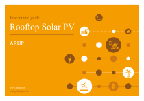 Five minute guide: Rooftop Solar PV Five minute guide Rooftop Solar PV www.arup.com energy@arup.com Five minute guide: Rooftop Solar PV What is a rooftop PV system? A solar photovoltaic (PV) system, mounted on the roof or integrated into the façade of a building, is an electrical installation that converts solar energy into electricity. This can be used to meet the building’s own energy consumption requirements or, in certain situations, fed back into the electrical grid. Rooftop solar PV systems are distributed electricity generation options, which help to meet a building’s energy needs, or provide electricity within an existing distribution network. The size of the installation can vary dramatically, and is dependent on the size of the building, the amount of electricity required, the funding available for the project, and the grid operator’s willingness to accept excess capacity. Core system components include PV modules, their accompanying mounting structure and an inverter. However, other components can also be incorporated into the system, depending on its size and complexity. These include: • • • • • string boxes; batteries; generators; transformers; and meters PV module array Electric vehicles String boxes Battery Charge controller Electrical load Inverter Back-up generator Meter The layout and configuration of systems can differ, depending on the load type and the energy supply requirements. An indicative layout is shown to the right. LV/MV transformer Grid Five minute guide: Rooftop Solar PV Global solar resources Global solar irradiation has the potential to meet all of our energy requirements and recent installation growth rates in the PV sector have demonstrated the potential for benefitting from this abundant resource, even in areas with lower than average irradiation. World map of global horizontal irradiation Five minute guide: Rooftop Solar PV Breakdown of capacity installed in 2000 Installation growth trends Breakdown of capacity installed in 2013 Source: EPIA, 2014 Small (<1MW) distributed PV capacity investment Source: BNEF PV systems provide a clean and increasingly affordable option for building owners and occupants to produce their own electricity. Globally, investments in small scale PV installations increased consistently between 2006 and 2012. This trend is expected to continue going forward, and it is estimated that solar PV installations could total 403GW by 2020. Annual installed capacity (GW) The increase in the uptake of solar PV installations is influenced by: • decreasing PV technology costs; • economies of scale achieved; • the learning curve associated with utility scale installations; • increasing grid supplied electricity prices; • the availability of preferential feed-in-tariffs or other financial incentives for renewable energy technologies (including tax credits); • carbon emission reduction targets; • the availability of alternative financing options; • air pollution concerns; and • energy security concerns Installed capacity (GW) Source: EPIA, 2014 The number and size of PV installations has increased exponentially since 2000, with Europe, China, the Americas and Asia-Pacific driving this growth. Source: EPIA, 2014 Recent years have seen a rapid increase in the installed capacity of PV systems around the world. Five minute guide: Rooftop Solar PV PV system costs Utility scale PV system installed cost projection 2014 Overall installation costs for PV technologies have decreased significantly in recent years; the cost of generating electricity from crystalline PV modules, for example, has dropped by approximately 53% since 2009. This does not include any backup supply options, such as batteries or generators. This trend is expected to continue going forward and overall system costs are forecasted to decrease by between 40% and 75% by 2050, compared to 2014 costs. Maximum USD 806/kWp Minimum USD 362/kWp USD / kWp USD / kWp USD / kWp Breakdown of utility scale PV system installed costs, 2014 Source: F-ISE System components make up the majority of the overall capital cost, with modules and inverters accounting for more than 60% of total costs. Balance of system (BOS) costs include the mounting system, electrical equipment (such as transformers and cables), grid connection, installation and planning costs. USD 1,329/kWp USD/EUR Average exchange rate for 2014 applied – OANDA.com The cost of installing a PV system is driven by the cost of the following: • PV system component costs; • project development costs; and • installation and commissioning costs 2050 projection Source: BNEF Technical advances and increased demand and associated economies of scale have led to reduced system costs for PV modules and balance of system components. Five minute guide: Rooftop Solar PV Global pricing trends Overall system cost reductions, together with increased demand and associated manufacturing capacity, has led to significant decreases in the price associated with solar PV. Grid supplied electricity tariffs have been increasing globally and the margin in price between PV and traditional electricity generation sources is therefore decreasing. In many markets, PV has reached retail electricity price parity, and given the recent trend for increasing grid supplied electricity tariffs, this trend is expected to continue. Country specific examples Recognising the rapid cost declines being achieved in the PV sector, the German government reduced their Feed-in Tariff financial incentive for rooftop PV in 2012 by between 32% and 37%. The installation rates are expected to remain stable despite this, with installations of between 2.5GW and 3.5GW expected on an annual basis. This is therefore resulting in commercial and industrial electricity consumers (often on retail tariffs) viewing small scale, grid connected PV systems as increasingly attractive investment options. In South Africa, through a utility scale government procurement pr