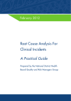 February 2012 Root Cause Analysis For Clinical Incidents A Practical Guide Prepared by the National District Health Board Quality and Risk Managers Group This document provides advice on how to manage the Root Cause Analysis (RCA) process for Severity Assessment Code 1 and 2 incidents to assist RCA Teams. The information provided in this document aligns with the New Zealand Health and Disability Services – National Reportable Events Policy 2012. Contents 1. Background................................................................................................................................... 3 2. Overview of the RCA process.......................................................................................................... 4 3. When is it not appropriate to conduct an RCA?................................................................................. 5 4. Notification and escalation process.................................................................................................. 7 5. Commissioning an RCA.................................................................................................................. 8 6. Support for staff........................................................................................................................... 13 7. Communication with the patient and patient’s family........................................................................ 13 8. Selecting the RCA team................................................................................................................ 15 9. Guide for RCA team members....................................................................................................... 16 10. Process – ways to conduct an RCA investigation.............................................................................. 19 11. Preparing the final report.............................................................................................................. 26 12. Finishing the report...................................................................................................................... 32 13. Implementation and monitoring recommendations............................................................................ 34 14. Distribution/communication of the final report................................................................................. 38 15. Document control......................................................................................................................... 38 2 Root Cause Analysis For Clinical Incidents 1. Background Education and training was provided nationally in 2008/2009 – “New Zealand Incident Management System: A National Approach to the Management of Health care Incidents.” A training manual was provided which covered theory, process, templates, and articles with the aim of increasing knowledge and informing the rollout of the system. A gap was identified by District Health Boards (DHBs) between the theory provided, the suggested tools, and how to apply the policy in practice within the resources and structures. The National Quality and Risk Managers decided to produce this RCA Practical Guide to help DHBs across the country to standardise their approach to RCA investigations. While the approach should be consistent and standardised, in line with the policy, it is recognised that DHBs do things in different ways so a variety of sample documents are appended to this guide which can be used and adapted as necessary. This Guide has been prepared specifically for DHBs, but it may be of use to other health and disability service providers who are free to adapt the information to their own needs. This Guide will be periodically updated by the Health Quality & Safety Commission (HQSC) working closely with the sector. It is current as at February 2012. Root Cause Analysis For Clinical Incidents 3 2. Overview of the RCA process In 2005 the World Health Organization defined the characteristics of a successful reporting system: Non-punitive Reporters are free from fear of retaliation against themselves or punishment of others as a result of reporting. Confidential The identities of the patient, reporter, and institution are never revealed. Independent The reporting system is independent of any authority with power to punish the reporter or the organisation. Expert analysis Reports are evaluated by experts who understand the clinical circumstances and are trained to recognise underlying systems causes. Timely Reports are analysed promptly and recommendations are rapidly disseminated to those who need to know, especially when serious hazards are identified. Systems-oriented Recommendations focus on changes in systems, processes, or products, rather than being targeted at individual performance. Responsive The agency that receives reports is capable of disseminating recommendations. Participating organisations commit to implementing recommendations whenever possible. What is an RCA? An RCA is a formal process that involves a multidisciplinary team commissioned by the Chief Executive or delegate. It is a thorough investigation to identify root causes of a SAC 1 or SAC 2 incident and to make recommendations that can be signed off by the Chief Executive or delegate, so the incident does not reoccur within that health care setting again. An RCA is also an approach or way of thinking. Best practice seeks to apply this type of thinking to all health care incidents. Undertaking an RCA is a way to learn as much about the incident or close call as possible so changes to systems and processes can be made internally, but just as importantly the knowledge gained and the systemic changes can be shared nationally, via the Commission. An RCA asks what happened? Why did it happen? What are the underlying causes? Because the process is focused on systems rather than individuals, persons involved in the incident will not be named. Documentation and communications
