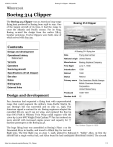 10/30/21, 5:22 PM Boeing 314 Clipper - Wikipedia Boeing 314 Clipper The Boeing 314 Clipper was an American long-range flying boat produced by Boeing from 1938 to 1941. One of the largest aircraft of its time, it had the range to cross the Atlantic and Pacific oceans. For its wing, Boeing re-used the design from the earlier XB-15 bomber prototype. Twelve Clippers were built, nine of which served with Pan Am. Boeing 314 Clipper Contents A Boeing 314 flying low Design and development Operational history Retirement Role Flying boat airliner Variants Manufacturer Boeing Airplane Company Operators First flight June 7, 1938 Surviving aircraft Introduction 1939 Specifications (314A Clipper) Retired 1948 See also Status Retired Notes Primary users Pan American World Airways British Overseas Airways Corporation United States Navy Produced 1938–1941 Number built 12 National origin United States Bibliography External links Design and development Pan American had requested a flying boat with unprecedented range that could augment the airline's trans-Pacific Martin M130. Boeing's bid was successful and on July 21, 1936, Pan American signed a contract for six. Boeing engineers adapted the cancelled XB-15's 149 ft (45 m) wing, and replaced the 850 hp (630 kW) Pratt & Whitney Twin Wasp radial engines with the 1,600 hp (1,200 kW) Wright Twin Cyclone.[1] Pan Am ordered six more aircraft with increased engine power and capacity for 77 daytime passengers as the Boeing 314A. The Yankee Clipper in 1939 The huge flying boat was assembled at Boeing's Plant 1 on the Duwamish River in Seattle, and towed to Elliott Bay for taxi and flight tests. The first flight was on June 7, 1938, piloted by Edmund T. "Eddie" Allen. At first the aircraft had a single vertical tail, and Allen found he had inadequate directional control. The aircraft https://en.wikipedia.org/wiki/Boeing_314_Clipper 1/11 10/30/21, 5:22 PM Boeing 314 Clipper - Wikipedia returned to the factory and was fitted with the endplates on the ends of the horizontal tail in place of the single vertical fin. This too was found to be insufficient and finally the centerline vertical fin was restored, after which the aircraft flew satisfactorily.[2] The 314 used a series of heavy ribs and spars to create a robust fuselage and cantilevered wing, eliminating the need for external drag-inducing struts to brace the wings. Boeing also incorporated Dornier-style sponsons into the hull structure.[3] The sponsons, broad lateral extensions at the waterline on both sides of the hull, served several purposes: They provided a wide platform to stabilize the craft while floating, they acted as a gangway for boarding and exiting, and they possessed intentional shaping to contribute additional aerodynamic lift in flight. Passengers and their baggage were weighed, with each passenger allowed up to 77 pounds (35 kg) free baggage allowance (in the later 314 series) but then charged $3.25 per pound ($7.2/kg) (equivalent to $60 in 2020) for exceeding the limit.[4] To fly the long ranges needed for trans-Pacific service, the 314 carried 4,246 US gallons (16,070 l; 3,536 imp gal) of gasoline. The later 314A model carried a further 1,200 US gallons (4,500 l; 1,000 imp gal). A capacity of 300 US gallons (1,100 l; 250 imp gal) of oil was required for operation of the radial engines. Pan Am's "Clippers" were built for "one-class" luxury air travel, a necessity given the long duration of transoceanic flights. The seats could be converted into 36 bunks for overnight accommodation; with a cruising speed of 188 miles per hour (303 km/h) (typically flights at maximum gross weight were flown at 155 miles per hour (249 km/h)) in 1940, Pan Am's schedule San Francisco to Honolulu was 19 hours. The 314s had a lounge and dining area, and the galleys were crewed by chefs The California Clipper at Cavite, the from four-star hotels. Men and women were provided with Philippines, 1940 separate dressing rooms, and white-coated stewards served five and six-course meals with gleaming silver service. The standard of luxury on Pan American's Boeing 314s has rarely been matched on heavier-than-air transport since then; they were a form of travel for the super-rich, priced at $675 (equivalent to $12,000 in 2020) round trip from New York to Southampton.[5] Most of the flights were transpacific, with a one-way ticket from San Francisco to Hong Kong via the "stepping-stone" islands posted at $760 (equivalent to $14,000 in 2020).[6] The Pan Am Boeing 314 Clippers brought exotic destinations like the Far East within reach of air travelers and came to represent the romance of flight. Transatlantic flights to neutral Lisbon and Ireland continued after war broke out in Europe in September 1939 (and until 1945), but military passengers and cargoes necessarily got priority, and the service was more spartan. Equally critical to the 314's success was the proficiency of its Pan Am flight crews, who were extremely skilled at long-distance, over-water flight operations and navigation. For training, many of the transpacific flights carried a second crew.[7] Only the very best and most experienced flight crews were assigned Boeing 314 flying boat duty. Before coming aboard, all Pan Am captains as well as first and second officers had thousands of hours of flight time in other seaplanes and flying boats. Rigorous training in dead reckoning, timed turns, judging drift from sea current, celestial navigation, and radio navigation were conducted. In conditions of poor or no visibility, pilots sometimes made successful landings at fogged-in harbors by landing out to sea, then taxiing the 314 into port.[8] Operational history https://en.wikipedia.org/wiki/Boeing_314_Clipper 2/11 10/30/21, 5:22 PM Boeing 314 Clipper - Wikipedia The first 314 flight on the San Francisco-Hong Kong route left Alameda on February 23, 1939 with regular passenger and Foreign Air Mail Route #14 (http://www.aeroda cious.com/FAM014.HTM) service [9][10] beginnin
