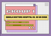 MANILA DOCTORS HOSPITAL VS. SO UN CHUA BY: ADRIAN GABRIEL CAPUYAN LORRAINE ALBA JULIAN FALGUI MARK JUNICKO ANCHETA SLIDESMANIA.COM PETITIONER ● MANILA DOCTORS HOSPITAL RESPONDENTS ● So Un Chua and Vicky Ty SLIDESMANIA.COM FACTS SLIDESMANIA.COM ● December 13, 1993 - respondents filed a Complaint ● October 30, 1990 - respondent Chua, the mother of respondent Vicky Ty, was admitted in petitioner's hospital for hypertension and diabetes; that while respondent Chua was confined, Judith Chua, the sister of respondent Ty, had been likewise confined for injuries suffered in a vehicular accident; ● that partial payments of the hospital bills were made, totaling P435,800.00; ● that after the discharge of Judith Chua, respondent Chua remained in confinement and the hospital bills for both patients accumulated; ● that respondent Chua was pressured by the petitioner, through its Credit and Collection Department, to settle the unpaid bills; ● that respondent Ty represented that she will settle the bills as soon as the funds become available ● that respondent Ty pleaded to the management that in view of the physical condition of her mother, respondent Chua, the correspondences relating to the settlement of the unpaid hospital bills should be relayed to the former ● that these pleas were unheeded by the petitioner; ● that petitioner threatened to implement unpleasant measures unless respondent Ty undertakes her mother's obligation as well as the obligation of her sister, Judith Chua, to pay the hospitalization expenses; ● that petitioner made good its threat and employed unethical, unpleasant and unlawful methods which allegedly worsened the condition of respondent Chua, particularly, by (i) cutting off the telephone line in her room and removing the air-conditioning unit, television set, and refrigerator, (ii) refusing to render medical attendance and to change the hospital gown and bed sheets, and (iii) barring the private nurses or midwives from assisting the patient. ● Respondents thus prayed for the award of moral damages, exemplary damages, and attorney's fees. SLIDESMANIA.COM ● In its Answer, Amended Answer, and Rejoinder, petitioner specifically denied the material ● ● ● ● ● SLIDESMANIA.COM averments of the Complaint and Reply, and interposed its counterclaims arguing that as early as one week after respondent Chua had been admitted to its hospital, Dr. Rody Sy, her attending physician, had already given instructions for her to be discharged, but respondents insisted that Chua remain in confinement; that, through its staff, petitioner accordingly administered medical examinations, all of which yielded negative results; that respondent Ty voluntarily undertook, jointly and severally, to pay the hospital bills for both patients; that although respondent Ty paid up to P435,000.00, more or less, she reneged on her commitment to pay the balance in violation of the Contract for Admission and Acknowledgment of Responsibility for Payment dated October 30, 1990 which she voluntarily executed; that she signed a Promissory Note on June 5, 1992 for the unpaid balance of P1,075,592.95 and issued postdated checks to cover the same; that no such undue pressure had been imposed upon respondent Chua to settle the bills, the truth being that, as a matter of standard procedure, the reminders to settle the bills were transmitted not to the patients but to their relatives who usually undertook to pay the same; ● that respondent Ty evaded the staff when the latter attempted to inform her that the room facilities will be cut off to minimize the rising charges; ● and that respondents instituted the present civil case purposely as leverage against the petitioner after the latter had filed criminal charges for violation of Batas Pambansa (B.P.) Blg. 22 against respondent Ty for issuing checks, later dishonored, totaling P1,075,592.95, the amount referring to the unpaid hospital bills. ● In its compulsory counterclaim, petitioner prayed, among other items, for the award of no less than P1,000,000.00 as compensatory damages due to the filing of a malicious and unfounded suit, and, in its permissive counterclaim, petitioner prayed for respondents to pay P1,075,592.95, the amount representing the due and demandable obligation under the Promissory Note dated June 5, 1992, including the stipulated interest therein and the 25 percent of the total amount due as attorney's fees. SLIDESMANIA.COM ● ● ● ● ● Judith Chua was confined from June 14, 1991 to May 2, 1992; respondents failed to pay the balance despite repeated reminders; the said reminders referred to the hospital bills of respondent Chua and Judith Chua; one of the attending physicians of respondent Chua was Dr. Rody Sy; and, the petitioner ordered the removal of the facilities in question from the room of its patient, respondent Chua, with the qualification that they were constrained to discontinue the same after the representative of respondent Chua refused to update the hospital bills or refused to transfer her to semi-deluxe room or ward to lessen costs. SLIDESMANIA.COM ● The petitioner alleged that that as early as one week after respondent Chua had been admitted to its hospital, Dr. Rody Sy had already given instructions for her to be discharged, but respondents insisted that Chua remain in confinement. It also alleged that she voluntarily signed the agreement that she will pay the bills and that no undue pressure was exerted by them; and that the cutting-off of the telephone line and removal of the air-conditioning unit, television set, and refrigerator cannot constitute unwarranted actuations, for the same were resorted to as cost-cutting measures and to minimize respondents' charges that were already piling up. SLIDESMANIA.COM Problems and Issues Involved ● This case originated from an action for damages filed with the RTC by respondents So Un Chua and Vicky Ty against petitioner Manila Doctors Hospital. T