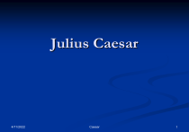 Julius Caesar 4/11/2022 Caesar 1 Summary Slide Vocabulary Act 1 Act 2 Act 3 Act 4 Act 5 Act Notes Act 1 Act 2 Act 3 Act 4 Act 5 4/11/2022 Act 1 Act 2 Act 3 Act 4 Act 5 Looking Back & Ahead Questions Act 1 Act 2 Act 3 Act 4 Quotations Study Questions Author Notes Act 1 Act 2 Act 3 Act 4 Act 5 Caesar 2 Vocabulary – Act 1 1. Cull (296, line 42) 7. Pick out “And do you now cull out a holiday?” 2. Intermit (296, 47) Stop for a time “Pray to the gods to intermit the plague.” 3. Servile (297, 68) Submissive “And keep us all in servile fearfulness.” 4. 5. 8. 9. Prodigies (306, 21) Remarkable people “Hooting and shrieking. When these prodigies” 10. Portentous (306, 24) Predicting evil “For, I believe, they are portentous things” 11. Prodigious (308, 51) Marvelous “In personal action, yet prodigious grown” Lamented (300, 55) Expressed sorrow “And it is very much lamented, Brutus,” 4/11/2022 Repute (302, 156) Reputation “Than to repute himself a son of Rome” Construe (298, 45) Interpret “Nor construe any further my neglect,” 6. To appear “Weigh them, it is as heavy; conjure with ‘em,” Derisive (298, 23) Mocking “When others join in Antony’s derisive laughter…” Conjure (302, 146) Caesar 3 Vocabulary – Act 2 1. Adder (315, 14) 7. Snake “It is the bright day that brings forth the adder;” 2. Pleasant; friendly “Hide it in smiles and affability;” 8. Augmented (316, 30) 9. Instigations (316, 49) 10. Phantasma (316, 65) 11. Ague (326, 112) Sickness “As that same ague which hath made you lean.” Imagination “Like a phantasma, or a hideous dream:” 6. Portents (326, 80) Omens “And these does she apply for warnings, and portents,” Redress (316, 55/57) Set right; repair “’Speak, strike, redress!’” Am I entreated” 5. Whelped (323, 17) Gave birth “A lioness hath whelped in the streets;” Urgings Such instigations have been often dropped” 4. Semblance (317, 83) Outward appearance “For if thou path, thy native semblance on,” Increased “Fashion it thus; that what he is, augmented,” 3. Affability (317, 82) Insurrection (317, 69) Uprising The nature of an insurrection 4/11/2022 Caesar 4 Vocabulary – Act 3 1. Puissant (333, 33) 6. Powerful/mighty Most high, most mighty, and most puissant Caesar 2. Fawning (333, 43) Cringing/bowing Low-crooked court’sies and base spaniel-fawning 3. Firmament (334, 62) Desire to harm Our arms in strength of malice, and our hearts 7. Enfranchisement (334, 81) 8. Abridged (336, 104) 9. Carrion (340, 275) Dead/decaying flesh With carrion men, groaning for burial 10. Shortened So are we Caesar’s friends, that have abridged 4/11/2022 Hart (338, 204) A deer Pardon me, Julius! Here wast thou bayed, brave hart; Set free “Liberty, freedom, and enfranchisement 5. Appeased (338, 179) Satisfied Only be patient till we have appeased Arch/sky There is no fellow in the firmament 4. Malice (338, 174) Censure (341, 16) Criticize That you may believe; censure me in your wisdom, and… Caesar 5 Vocabulary – Act 4 1. Triumvirate (351, intro.) 5. Three-man rule …forming the second triumvirate. 2. Chastisement (355, 16) Sharp or biting When you are waspish 6. A punishment And chastisement doth therefore hide his head 3. Base (356, 24) Testy (356, 46) 7. Chides (359, 124) Scolds He’ll think your mother chides, and leave you so. 8. Easily annoyed; impatient Under your testy humor? By the gods, 4/11/2022 Vaunting (356, 52) Bragging; boasting Let it appear so; make your vaunting true, Lacking higher qualities Contaminate our fingers with base bribes, 4. Waspish (356, 50) Sepulchral (362, 251) Related to a funeral Ghost (in sepulchral tones) Caesar 6 Vocabulary – Act 5 1. Disheveled (368, Stage directions) Disordered or or full of disarray Several soldiers, disheveled and weary from fighting 2. Disconsolate (370, 56) Cheerless; dejected All disconsolate,/With Pindarus his bondman, on this hill. 3. Apt (370, 68) Ready; likely Why dost thou show to the apt thoughts of men 4. Engendered (370, 71) Produced; procreated But kill’st the mother that engendered thee 5. Envenomed (370, 76) Made poisonous For piercing steel and darts envenomed 6. Entrails (372, 95) Bowels; inner workings In our own proper entrails. 4/11/2022 Caesar 7 Act 1 Notes Scene 1 This scene shows the true conflict of the play – the jealousy and dislike of those in power vs. Julius Caesar The mob is FICKLE – they loved Pompey, but now they love Caesar even though he killed Pompey and his sons Flavius disrobes (takes down the decorations) the statues – great disrespect to Caesar Puns were very popular in Elizabethan audiences: 4/11/2022 Sole – soul Awl – all Cobbler – shoemaker and bungler Caesar 8 Act 1 Notes Scene 2 Feast of Lupercal – festival of fertility. Caesar wants Calpurnia to have a child. He had no children Caesar is not overly superstitious at this point – listens to Soothsayer but doesn’t believe him “Beware the Ides of March” one of most important Shakespearean quotes Brutus is depressed – he is “at war with himself.” Cassius is sneaky and wants Brutus to join his plan because Brutus is one of the most respected men in Rome 4 ways Cassius tries to persuade Brutus: 4/11/2022 Arouse his envy Finds fault with their position Tries to arouse ambition Ancient liberty of Rome This scene shows Caesar’s weakness of mind and body Caesar 9 Act 1 Notes Scene 2 (cont.) 4/11/2022 Brutus says he will consider what Cassius has said – provides a spark of hope for Cassius Casca tells Brutus and Cassius that Caesar got so upset he went into an epileptic seizure (historically accurate) – no crown and Antony might have been first to cross finish line Caesar is very good at sizing up individuals – Cassius would worry him if he weren’t Caesar Caesar very arrogant and unafraid Casca is quick to action and slow to thinking – good conspirator First soliloquy – spoken by Cassius. Reveals his plan concerning Brut