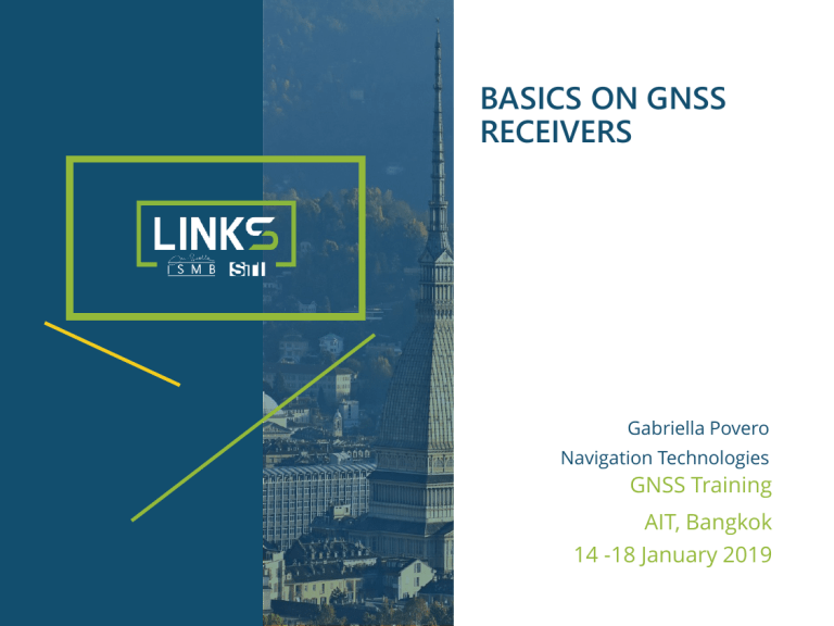 BASICS ON GNSS RECEIVERS Gabriella Povero Navigation Technologies GNSS Training AIT, Bangkok 14 -18 January 2019 ©2019 LINKS 1 THE HARD WORK OF GNSS RECEIVERS Control system errors: • Clocks • Ephemeris Doppler Atmospheric errors: • Ionosphere • Troposphere Low SNR Urban canyons Indoor Multipath Bluetooth WLAN Interference and jamming ©2019 LINKS 2 THE RECEIVER CHAIN Let us consider the SIS of a single SV (space vehicle) π¦ππ π‘ = π¦π πΉ π‘ = 2ππ c π‘ d π‘ cos 2π ππ πΉ π‘ + ππ πΉ 2ππ c π‘ − π d π‘ − π cos 2π ππ πΉ + ππ π‘ + ππ πΉ + π€(π‘) y RF (t ) Antenna RF Front-end ©2019 LINKS ADC GNSS Digital receiver 3 THE RECEIVER CHAIN Let us consider the SIS of a single SV (space vehicle) π¦ππ π‘ = 2ππ c π‘ d π‘ cos 2π ππ πΉ π‘ + ππ πΉ noise π¦π πΉ π‘ = 2ππ c π‘ − π d π‘ − π cos 2π ππ πΉ + ππ π‘ + ππ πΉ + π€(π‘) y RF (t ) Antenna delay RF Front-end ©2019 LINKS Doppler frequency ADC GNSS Digital receiver 4 GNSS ANTENNAS β’ Antennas receive, amplify and band-pass filters GNSS signals β’ GNSS antennas are Right Hand Circularized Polarized (RHCP) β’ Important parameters used to characterize GPS antennas are: β’ Central frequency (e.g.: GPS L1 = 1575.42 MHz) and bandwidth β’ Single or multi-frequency β’ Radiation pattern (directivity). Antenna GPS antennas are usually hemispherical β’ Impedance (typically 50 ohm) β’ Voltage Standing Wave Ratio (VSWR) β’ Noise factor β’ Gain β’ Multipath rejection capability β’ Jamming mitigation capability ©2019 LINKS 5 THE RECEIVER CHAIN Let us consider the SIS of a single SV (space vehicle) π¦ππ π‘ = π¦π πΉ π‘ = 2ππ c π‘ d π‘ cos 2π ππ πΉ π‘ + ππ πΉ 2ππ c π‘ − π d π‘ − π cos 2π ππ πΉ + ππ π‘ + ππ πΉ + π€(π‘) y RF (t ) Antenna y IF [n ] ο½ 2 PR c ( b ) ( nTs ο ο΄ )d ( nTs RF Down-convertor π¦πΌπΉ π‘ = ©2019 LINKS y IF (t ) ADC GNSS Digital receiver 2ππ c π‘ − π d π‘ − π cos 2π ππΌπΉ + ππ π‘ + ππΌπΉ + π€(π‘) 6 GNSS FRONT-END RF down convertor It down-converts and filters RF signals to an intermediate frequency (IF) compatible with analogue-to-digital converter (ADC) acceptable input. Key parameters: β’ Input frequency/ies β’ Noise β’ Linearity β’ Automatic Gain Control (AGC) β’ Isolation y RF (t ) Antenna RF Down-convertor π¦πΌπΉ π‘ = ©2019 LINKS y IF (t ) ADC GNSS Digital receiver 2ππ c π‘ − π d π‘ − π cos 2π ππΌπΉ + ππ π‘ + ππΌπΉ + π€(π‘) 7 ANALOG TO DIGITAL CONVERTER (ADC) Important parameters used to characterize the ADC are: β’ # of bits: GNSS receivers works well with a low number of bits per samples (1,2, 1.5, 4 bits). Higher number of bits (8 bits) used for specific applications (e.g.: interference detection) β’ Analog input range: defines the voltage range in input. Used in the design of the front end gain β’ Maximum sampling frequency: depends on the device (e.g.: 60, 80, 100 Msps) β’ Analog input bandwidth: Determine the maximum frequency of the signal that can be processed by the device From Analog Device AD9288 ©2019 LINKS 8 THE RECEIVER CHAIN Let us consider the SIS of a single SV (space vehicle) π¦ππ π‘ = π¦π πΉ π‘ = 2ππ c π‘ d π‘ cos 2π ππ πΉ π‘ + ππ πΉ 2ππ c π‘ − π d π‘ − π cos 2π ππ πΉ + ππ π‘ + ππ πΉ + π€(π‘) y RF (t ) Antenna RF y IF [n ] ο½ GNSS 2 PR c ( b ) ( nTs ο ο΄ )d ( nTs y IF (t ) ADC Front-end Digital receiver y IF [n ] ο½ 2 PR c ( b ) ( nTs ο ο΄ )d ( nTs ο ο΄ ) cos( 2ο° ( f IF ο« f d )nTs ο« οIF ) ο« wIF [n ] delay ©2019 LINKS Doppler frequency 9 GNSS RECEIVER OPERATIONS y IF [n ] ο½ 2 PR c ( b ) ( nTs ο ο΄ )d ( nTs ο ο΄ ) cos( 2ο° ( f IF ο« f d )nTs ο« οIF ) ο« wIF [n ] 1 Sky search Acquisition 2 3 ©2019 LINKS Search for IDs of visible satellites Tracking Code delay and Doppler estimates, rough alignment of code and carrier Refines code and carrier alignment 10 GNSS RECEIVER FUNCTIONALITIES Baseband processing: Acquires and tracks incoming signals, demodulates signals. Carrier & Code correlator Channel 1 antenna Channel 2 RF Front End Carrier & Code tracking ©2019 LINKS NAV Unit Acquisition stage Channel n 11 GNSS RECEIVER FUNCTIONALITIES Baseband processing: Acquires and tracks incoming signals, demodulates signals. Key parameters: β’ Number of channels β’ Measurement rate β’ Carrier-to-Noise ratio (C/N0) β’ Multipath immunity β’ Signals/modulationsCarrier processed & Code correlator β’ Dynamics β’ Interference cancellation antenna β’ Jamming mitigation RF Front End Channel 2 NAV Unit Acquisition stage Carrier & Code tracking ©2019 LINKS Channel 1 Channel n 12 GNSS RECEIVER OPERATIONS 4 Measurements 5 Computation 6 Usually the PVT Integration with external info 7 ©2019 LINKS Pseudorange and data demodulation HMI Not present in all receivers Not present in all receivers 13 GNSS RECEIVER FUNCTIONALITIES PVT (& Application) processing: Computes the estimated position and receiver time offset relative to the constellation’s reference time. Evaluation of user position Channel 1 antenna Channel 2 RF Front End Key parameters: β’ Solution type (GNSS, Differential GNSS) β’ Single or Multi constellation β’ Update rate NAV Unit Acquisition stage Position Velocity Time Channel n External aiding β’ Latency ©2019 LINKS 14 RECEIVERS CLASSES Description Handheld receivers for hikers and sailors. Small size with latitude-longitude displays and maps. Integrated GPS in mobile phones. Low cost and mostly single frequency. Device Price [€] 100 - 600 50-600 Maritime navigators. Fixed mount, large screens with electronics chart 100-3000 In-car navigation systems. Detailed street maps and turn-by-turn directions. These systems can be 