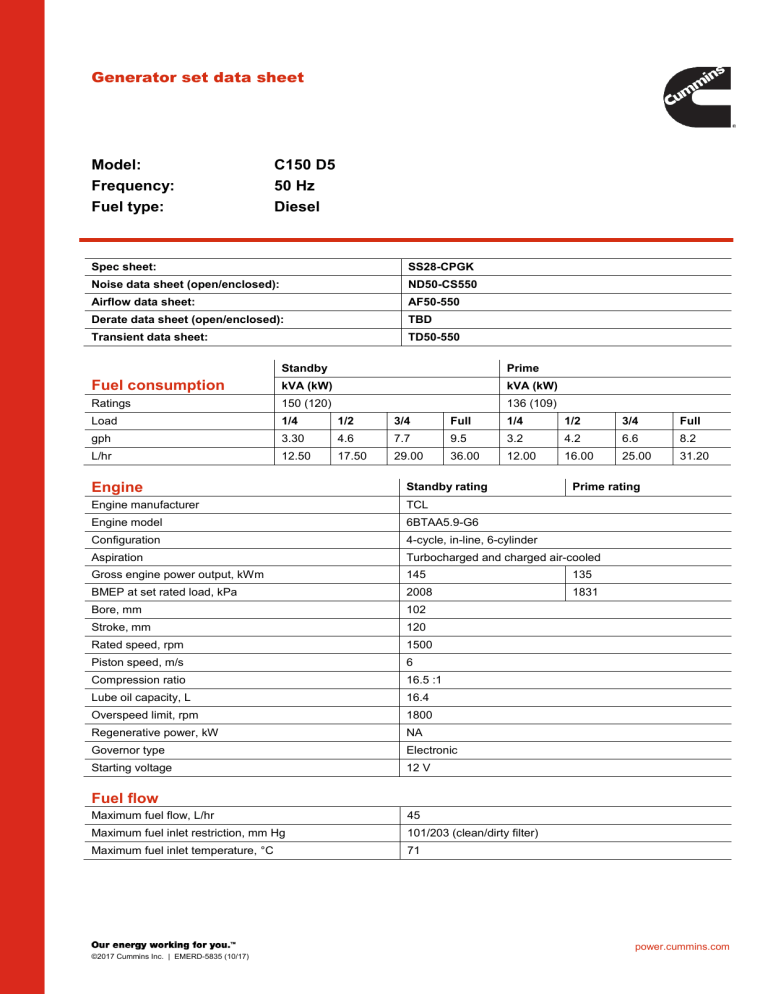 Generator set data sheet Model: Frequency: Fuel type: C150 D5 50 Hz Diesel Spec sheet: SS28-CPGK Noise data sheet (open/enclosed): ND50-CS550 Airflow data sheet: AF50-550 Derate data sheet (open/enclosed): TBD Transient data sheet: TD50-550 Standby Prime Fuel consumption kVA (kW) kVA (kW) Ratings 150 (120) Load 1/4 1/2 3/4 Full 1/4 1/2 3/4 Full gph 3.30 4.6 7.7 9.5 3.2 4.2 6.6 8.2 L/hr 12.50 17.50 29.00 36.00 12.00 16.00 25.00 31.20 136 (109) Engine Standby rating Engine manufacturer TCL Engine model 6BTAA5.9-G6 Configuration 4-cycle, in-line, 6-cylinder Aspiration Turbocharged and charged air-cooled Gross engine power output, kWm 145 135 BMEP at set rated load, kPa 2008 1831 Bore, mm 102 Stroke, mm 120 Rated speed, rpm 1500 Piston speed, m/s 6 Compression ratio 16.5 :1 Lube oil capacity, L 16.4 Overspeed limit, rpm 1800 Regenerative power, kW NA Governor type Electronic Starting voltage 12 V Prime rating Fuel flow Maximum fuel flow, L/hr 45 Maximum fuel inlet restriction, mm Hg 101/203 (clean/dirty filter) Maximum fuel inlet temperature, °C 71 power.cummins.com ©2017 Cummins Inc. | EMERD-5835 (10/17) Air Standby rating Prime rating Combustion air, m /min 8.95 8.35 Maximum air cleaner restriction, kPa 3.74 3 Exhaust 3 Exhaust gas flow at set rated load, m /min 31 29 Exhaust gas temperature, °C 520 519 Maximum exhaust back pressure, kPa 10.15 Standard set-mounted radiator cooling Ambient design, °C 50 Fan load, kWm 9.8 Coolant capacity (with radiator), L 3 22.1 Cooling system air flow, m /sec @ 12.7 mm H2O 3.77 Total heat rejection, Btu/min 4071 Maximum cooling air flow static restriction mm H2O 12.7 Weights* Open Enclosed Unit dry weight kgs 1635 2390 Unit wet weight kgs 1650 2400 3867 * Weights represent a set with standard features. See outline drawing for weights of other configurations. Dimensions Length Width Height Standard open set dimensions mm 2537 1090 1846 Enclosed set standard dimensions mm 3460 1090 2387 Genset outline Open set power.cummins.com ©2017 Cummins Inc. | EMERD-5835 (10/17) Enclosed set Outlines are for illustrative purposes only. Please refer to the genset outline drawing for an exact representation of this model. Alternator data Connection 1 2 Temp rise ºC Duty Alternator Voltage Wye 163 ESP UCI274E 190 - 208 & 380 - 416 V Wye 150 ESP UCI274F 190 - 208 & 380 - 416 V Wye 125 PRP UCI274E 190 - 208 & 380 - 416 V Wye 105 PRP UCI274F 190 - 208 & 380 - 416 V Ratings definitions Emergency Standby Power (ESP): Limited-Time Running Power (LTP): Prime Power (PRP): Base Load (Continuous) Power (COP): Applicable for supplying power to varying electrical load for the duration of power interruption of a reliable utility source. Emergency Standby Power (ESP) is in accordance with ISO 8528. Fuel Stop power in accordance with ISO 3046, AS 2789, DIN 6271 and BS 5514. Applicable for supplying power to a constant electrical load for limited hours. Limited-Time Running Power (LTP) is in accordance with ISO 8528. Applicable for supplying power to varying electrical load for unlimited hours. Prime Power (PRP) is in accordance with ISO 8528. Ten percent overload capability is available in accordance with ISO 3046, AS 2789, DIN 6271 and BS 5514. Applicable for supplying power continuously to a constant electrical load for unlimited hours. Continuous Power (COP) is in accordance with ISO 8528, ISO 3046, AS 2789, DIN 6271 and BS 5514. Formulas for calculating full load currents: Three phase output Single phase output kW x 1000 kW x Single Phase Factor x 1000 Voltage x 1.73 x 0.8 Voltage For more information contact your local Cummins distributor or visit power.cummins.com ©2017 Cummins Inc. All rights reserved. Cummins is a registered trademark of Cummins Inc. PowerCommand, AmpSentry, InPower and “Our energy working for you.” are trademarks of Cummins Inc. Other company, product, or service names may be trademarks or service marks of others. Specifications are subject to change without notice. EMERD-5835 (10/17)