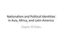 Nationalism and Political Identities in Asia, Africa, and Latin America Chapter 35 Notes Asian Paths to Autonomy India's Quest for Home Rule Indian National Congress and Muslim League • After WWI, both organizations dedicated to achieving independence • Indian nationalists inspired by Wilson's Fourteen Points and the Russian Revolution • Frustrated by Paris Peace settlement: no independence for colonies • British responded to nationalist movement with repressive measures Mohandas K. Gandhi (1869-1948) • Leader of Indian nationalism • Raised as a well-to-do Hindu, studied law in London • Spent twenty-five years in South Africa – Embraced tolerance and nonviolence • Developed technique of passive resistance – Followed a simple life Mohandas K. Gandhi (1869-1948) • Became political and spiritual leader – Called the Mahatma ("Great Soul") • Opposed to caste system – Especially the exclusion of untouchables • From 1920-1922 led the Non-Cooperation Movement • In 1930 led the Civil Disobedience Movement The India Act of 1937 • 1919 British massacre at Amritsar killed 379 demonstrators – Aroused public against British rule • Repression failed – British offered modified self-rule through the India Act • Unsuccessful because India's six hundred princes refused to support The India Act of 1937 • Muslims would not cooperate – Wanted an independent state • Great Depression worsened conflict between Hindus and Muslims • Muslims believed Hindus discriminated against them • Muhammad Ali Jinnah was head of the Muslim League – Proposed two states, one of which would be Pakistan China's Search for Order The Republic After 1911 • 1911 revolution did not establish a stable republic; China fell into warlords' rule • Through unequal treaties, foreign states still controlled economy of China Growth of Chinese Nationalism • Chinese intellectuals expected Paris Peace Conference to end treaty system • Instead, Paris treaties approved Japanese expansion into China • May Fourth Movement: Chinese youths and intellectuals opposed to imperialism • Some were attracted to Marxism and Leninism; CCP established in 1921 CCP (Chinese Communist Party) and Guomindang (The Nationalist Party) • CCP leader Mao Zedong advocated women's equality, socialism • Guomindang leader Sun Yatsen favored democracy and nationalism • Two parties formed alliance, assisted by the Soviet Union, against foreigners Chinese Civil War • After death of Sun Yatsen in 1925 Guomindang led by Jiang Jieshi – Guomindang and CCP parties launched Northern Expedition to reunify China • Successful, Jiang then turned on his communist allies • 1934-1935, CCP retreated to Yan'an – Mao’s Long March of 6,215 miles Mao Zedong • Emerged as the leader of CCP • Developed Maoist ideology – Communist Revolution would come from the peasants Imperial and Imperialist Japan Japan Emerged from Great War as a World Power • Participated in the League of Nations • Signed treaty with United States guaranteeing China's integrity Japanese Economy Boosted by War • Sold munitions to Allies • Prosperity short-lived – Economy slumped during Great Depression • Labor unrest – Demands for social reforms Political Conflict • Internationalists on one side – Supporters of western-style capitalism • Nationalists on the other – Hostile to foreign influences The Mukden Incident • Occurred in 1931 in Manchuria • Chinese unification threatened Japanese interests in Manchuria • Japanese troops destroyed tracks on Japanese railroad – Claimed Chinese attack • Incident became pretext for Japanese attack against China The Mukden Incident • Military, acting without civilian authority took all Manchuria by 1932 • League of Nations called for withdrawal of Japanese troops and restoration of Chinese sovereignty – Japan responded by leaving the League • The new militant Japanese national identity helped set the stage for global conflagration Africa Under Colonial Domination Africa and the Great War • Many belligerents were colonial powers in Africa – Nearly every colony took sides • German colonial administration faced combined colonial forces of Great Britain, France, Belgium, Italy, and Portugal – Britain sought to maintain naval supremacy and to secure victor's spoils after war – France sought recovery of territory earlier ceded to Germany – Germans, outnumbered ten to one, could not win but 15,000 troops tied down 60,000 Allied forces until late in the war African Participation in the Great War • Large numbers of Africans participated actively in the war as soldiers or carriers – Some volunteered – Some were impressed – Some were formally conscripted • Greater than 150,000 African soldiers and carriers died and many were injured or disabled Africans Challenge European Authority • During the war Africans challenged European colonial authority – Colonial subjects noticed that an already thin European presence became even thinner as war channeled colonial personnel elsewhere – Africans stage armed revolts, requiring colonial powers to divert military resources to meet these challenges – The cause of revolts varied but they included panIslamic opposition to war; anti-European and antiChristian sentiment; and compulsory conscription of Africans • Colonial authorities ruthlessly put down all the revolts The Colonial Economy African Economy After the War • Africa was transformed by the pursuit of two economic objectives by colonial powers – Ensuring that the costs of colonial administration were borne by the colonized – Developing export-oriented economies in which unprocessed raw materials or minimally processed crops were sent abroad • Previously self-sufficient African economies were destroyed in favor of colonial economies dependent upon a European-dominated economy • During the Great Depression, colonial economies suffered as trade volu