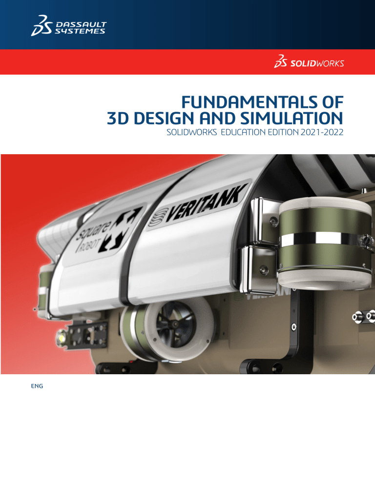FUNDAMENTALS OF 3D DESIGN AND SIMULATION SOLIDWORKS EDUCATION EDITION 2021-2022 ENG Fund3D.book Page 1 Monday, February 10, 2020 2:19 PM SOLIDWORKS Education Edition Fundamentals of 3D Design and Simulation To be used with SOLIDWORKS Education Edition 2020-2021 or 2021-2022 Dassault Systèmes SolidWorks Corporation 175 Wyman Street Waltham, MA 02451 U.S.A. Fund3D.book Page 2 Monday, February 10, 2020 2:19 PM © 1995-2019, Dassault Systemes SolidWorks Corporation, a Dassault Systèmes SE company, 175 Wyman Street, Waltham, Mass. 02451 USA. All Rights Reserved. The information and the software discussed in this document are subject to change without notice and are not commitments by Dassault Systemes SolidWorks Corporation (DS SolidWorks). No material may be reproduced or transmitted in any form or by any means, electronically or manually, for any purpose without the express written permission of DS SolidWorks. The software discussed in this document is furnished under a license and may be used or copied only in accordance with the terms of the license. All warranties given by DS SolidWorks as to the software and documentation are set forth in the license agreement, and nothing stated in, or implied by, this document or its contents shall be considered or deemed a modification or amendment of any terms, including warranties, in the license agreement. Patent Notices SOLIDWORKS® 3D mechanical CAD and/or Simulation software is protected by U.S. Patents 6,611,725; 6,844,877; 6,898,560; 6,906,712; 7,079,990; 7,477,262; 7,558,705; 7,571,079; 7,590,497; 7,643,027; 7,672,822; 7,688,318; 7,694,238; 7,853,940; 8,305,376; 8,581,902; 8,817,028; 8,910,078; 9,129,083; 9,153,072; 9,262,863; 9,465,894; 9,646,412; 9,870,436; 10,055,083; 10,073,600; 10,235,493 and foreign patents, (e.g., EP 1,116,190 B1 and JP 3,517,643). eDrawings® software is protected by U.S. Patent 7,184,044; U.S. Patent 7,502,027; and Canadian Patent 2,318,706. U.S. and foreign patents pending. Trademarks and Product Names for SOLIDWORKS Products and Services SOLIDWORKS, 3D ContentCentral, 3D PartStream.NET, eDrawings, and the eDrawings logo are registered trademarks and FeatureManager is a jointly owned registered trademark of DS SolidWorks. CircuitWorks, FloXpress, PhotoView 360, and TolAnalyst are trademarks of DS SolidWorks. FeatureWorks is a registered trademark of HCL Technologies Ltd. SOLIDWORKS 2020, SOLIDWORKS Standard, SOLIDWORKS Professional, SOLIDWORKS Premium, SOLIDWORKS PDM Professional, SOLIDWORKS PDM Standard, SOLIDWORKS Simulation Standard, SOLIDWORKS Simulation Professional, SOLIDWORKS Simulation Premium, SOLIDWORKS Flow Simulation, SOLIDWORKS CAM, SOLIDWORKS Manage, eDrawings Viewer, eDrawings Professional, SOLIDWORKS Sustainability, SOLIDWORKS Plastics, SOLIDWORKS Electrical Schematic Standard, SOLIDWORKS Electrical Schematic Professional, SOLIDWORKS Electrical 3D, SOLIDWORKS Electrical Professional, CircuitWorks, SOLIDWORKS Composer, SOLIDWORKS Inspection, SOLIDWORKS MBD, SOLIDWORKS PCB powered by Altium, SOLIDWORKS PCB Connector powered by Altium, and SOLIDWORKS Visualize are product names of DS SolidWorks. Other brand or product names are trademarks or registered trademarks of their respective holders. COMMERCIAL COMPUTER SOFTWARE - PROPRIETARY The Software is a “commercial item” as that term is defined at 48 C.F.R. 2.101 (OCT 1995), consisting of “commercial computer software” and “commercial software documentation” as such terms are used in 48 C.F.R. 12.212 (SEPT 1995) and is provided to the U.S. Government (a) for acquisition by or on behalf of civilian agencies, consistent with the policy set forth in 48 C.F.R. 12.212; or (b) for acquisition by or on behalf of units of the Department of Defense, consistent with the policies set forth in 48 C.F.R. 227.7202-1 (JUN 1995) and 227.7202-4 (JUN 1995). In the event that you receive a request from any agency of the U.S. Government to provide Software with rights beyond those set forth above, you will notify DS SolidWorks of the scope of the request and DS SolidWorks will have five (5) business days to, in its sole discretion, accept or reject such request. Contractor/ Manufacturer: Dassault Systemes SolidWorks Corporation, 175 Wyman Street, Waltham, Massachusetts 02451 USA. Copyright Notices for SOLIDWORKS Standard, Premium, Professional, and Education Products Portions of this software © 1986-2018 Siemens Product Lifecycle Management Software Inc. All rights reserved. This work contains the following software owned by Siemens Industry Software Limited: D-Cubed® 2D DCM © 2019. Siemens Industry Software Limited. All Rights Reserved. D-Cubed® 3D DCM © 2019. Siemens Industry Software Limited. All Rights Reserved. D-Cubed® PGM © 2019. Siemens Industry Software Limited. All Rights Reserved. D-Cubed® CDM © 2019. Siemens Industry Software Limited. All Rights Reserved. D-Cubed® AEM © 2019. Siemens Industry Software Limited. All Rights Reserved. Portions of this software © 1998-2019 HCL Technologies Ltd. Portions of this software incorporate PhysX™ by NVIDIA 20062010. Portions of this software © 2001-2019 Luxology, LLC. All rights reserved, patents pending. Portions of this software © 2007-2019 DriveWorks Ltd. © 2012, Microsoft Corporation. All rights reserved. Includes Adobe® PDF Library technology. Copyright 1984-2016 Adobe Systems Inc. and its licensors. All rights reserved. Protected by U.S. Patents 6,563,502; 6,639,593; 6,754,382; Patents Pending. Adobe, the Adobe logo, Acrobat, the Adobe PDF logo, Distiller and Reader are registered trademarks or trademarks of Adobe Systems Inc. in the U.S. and other countries. For more DS SolidWorks copyright information, see Help > About SOLIDWORKS. Copyright Notices for SOLIDWORKS Simulation Products Portions of this software © 2008 Solversoft Corporation. PCGLSS © 1992-2017 Computational Applications and System Integration, Inc. All rights reserved. Copyright Notices for SOLIDWORKS PDM Professional P