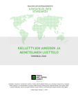 MAAILMAN ANTIDOPINGSÄÄNNÖSTÖ KANSAINVÄLINEN STANDARDI KIELLETTYJEN AINEIDEN JA MENETELMIEN LUETTELO TAMMIKUU 2018 Kiellettyjen aineiden ja menetelmien luettelon virallista tekstiä ylläpitää WADA, ja se julkaistaan englanniksi ja ranskaksi. Mikäli englannin- ja ranskankielisten versioiden välillä ilmenee ristiriitaisuuksia, englanninkielinen versio pätee. Mikäli suomeksi käännetyn version ja englanninkielisen version välillä on ristiriitaisuuksia, englanninkielinen versio pätee. Luettelo astuu voimaan 1.1.2018 KAIKKINA AIKOINA KIELLETYT AINEET JA MENETELMÄT (KILPAILUJEN AIKANA JA KILPAILUJEN ULKOPUOLELLA) MAAILMAN ANTIDOPINGSÄÄNNÖSTÖN ARTIKLAN 4.2.2 MUKAISESTI KAIKKIA KIELLETTYJÄ AINEITA PIDETÄÄN ”ERIKSEEN MÄÄRITELTYINÄ AINEINA”, LUKUUN OTTAMATTA RYHMIIN S1, S2, S4.4, S4.5 JA S6.A KUULUVIA AINEITA SEKÄ RYHMIIN M1, M2 JA M3 KUULUVIA KIELLETTYJÄ MENETELMIÄ. KIELLETYT AINEET Mestanoloni; Mesteroloni; Metandienoni (17β-hydroxy-17α-methylandrosta-1,4-dien-3one); Metenoloni; Metandrioli; Metasteroni (17β-hydroxy-2α,17α-dimethyl-5α-androstan-3one); Metyylidienoloni (17β-hydroxy-17α-methylestra-4,9-dien-3one); Metyyli-1-testosteroni (17β-hydroxy-17α-methyl-5α-androst-1en-3-one); Metyylinortestosteroni (17β-hydroxy-17α-methylestr-4-en-3one); Metyylitestosteroni; Metriboloni (metyylitrienoloni, 17β-hydroxy-17α- methylestra4,9,11-trien-3-one); Miboleroni; Norboletoni; Norklosteboli; Noretandroloni; Oksaboloni; Oksandroloni; Oksimesteroni; Oksimetoloni; Prostanotsoli (17β-[(tetrahydropyran-2-yl)oxy]-1'Hpyrazolo[3,4:2,3]-5α-androstane); S0 MYYNTILUVATTOMAT LÄÄKEAINEET Kaikkien sellaisten lääkeaineiden käyttö, joita mikään tämän Luettelon kohdista ei kata ja joiden lääkinnälliselle käytölle ihmisillä ei ole minkään valtion terveysviranomaisen myöntämää voimassa olevaa hyväksyntää (esimerkiksi lääkeaineet, jotka ovat prekliinisessä tai kliinisessä tutkimusvaiheessa tai joita ei enää kehitetä tai valmisteta, ja aineet, joiden rakennetta on muunneltu, tai vain eläinlääketieteelliseen käyttöön hyväksytyt lääkeaineet), on kielletty kaikkina aikoina. S1 ANABOLISET AINEET Anaboliset aineet ovat kiellettyjä. 1. ANABOLIS-ANDROGEENISET STEROIDIT (AAS) a. Eksogeeniset* AAS-aineet, esimerkiksi: 1-Androsteenidioli (5α-androst-1-ene-3β,17β-diol); 1-Androsteenidioni (5α-androst-1-ene-3,17-dione); 1-Androsteroni (3α-hydroxy-5α-androst-1-ene-17-one); 1-Testosteroni (17β-hydroxy-5α-androst-1-en-3-one); 4-Hydroksitestosteroni (4,17β-dihydroxyandrost-4-en-3-one); Stanotsololi; Stenboloni; Tetrahydrogestrinoni (THG; 17-hydroxy-18a-homo-19-nor-17αpregna-4,9,11-trien-3-one); Trenboloni (17β-hydroxyestr-4,9,11-trien-3-one); Bolandioli (estr-4-ene-3β,17β-diol); Bolasteroni; Danatsoli ([1,2]oxazolo[4',5':2,3]pregna-4-en-20-yn-17α-ol); Dehydrokloorimetyylitestosteroni (4-chloro-17β-hydroxy-17αmethylandrosta-1,4-dien-3-one); sekä muut kemialliselta rakenteeltaan tai biologisilta vaikutuksiltaan vastaavat aineet. Desoksimetyylitestosteroni (17α-methyl-5α-androst-2-en17β-ol); Drostanoloni; Etyyliestrenoli (19-norpregna-4-en-17α-ol); Fluoksimesteroni; Formeboloni; Furatsaboli (17α-methyl [1,2,5]oxadiazolo[3',4':2,3]-5αandrostan-17β-ol); Gestrinoni; Kalusteroni; Klosteboli; Kvinboloni; 2 b. Endogeeniset** AAS-aineet elimistön ulkopuolisesti annosteltuna: 2. MUUT ANABOLISET AINEET Esimerkiksi: Klenbuteroli, selektiiviset androgeenireseptorin modulaattorit (SARM, esimerkiksi andariini, LGD-4033, ostariini ja RAD140), tiboloni, tseranoli ja tsilpateroli. 19-Norandrosteenidioli (estr-4-ene-3,17-diol); 19-Norandrosteenidioni (estr-4-ene-3,17-dione); Androstanoloni (5α-dihydrotestosteroni, 17β-hydroxy-5αandrostan-3-one); Androsteenidioli (androst-5-ene-3β,17β-diol); Androsteenidioni (androst-4-ene-3,17-dione); Boldenoni; Boldioni (androsta-1,4-diene-3,17-dione); Nandroloni (19-nortestosterone); Prasteroni (dehydroepiandrosteroni, DHEA, 3βhydroxyandrost-5-en-17-one); Termien selityksiä: * Eksogeeninen tarkoittaa ainetta, jota ei yleensä muodostu luonnostaan elimistössä. ** Endogeeninen tarkoittaa ainetta, jota yleensä muodostuu elimistössä luonnostaan. S2 Testosteroni; PEPTIDIHORMONIT, KASVUTEKIJÄT, VASTAAVAT AINEET JA MIMEETIT Seuraavat aineet sekä muut kemialliselta rakenteeltaan tai biologisilta vaikutuksiltaan vastaavat aineet ovat kiellettyjä: sekä niiden aineenvaihduntatuotteet ja isomeerit, esimerkiksi: 1. Erytropoietiinit (EPO) ja erytropoieesiin vaikuttavat aineet, esimerkiksi: 1.1 Erytropoietiinireseptorin agonistit, esimerkiksi: Darbepoietiinit (dEPO); Erytropoietiinit (EPO); EPO-pohjaiset konstruktit [EPO-Fc, metoksipolyetyleeniglykoliepoietiini beeta (CERA)]; EPO-mimeettiset aineet ja niiden konstruktit (esimerkiksi CNTO-530, peginesatidi). 3β-Hydroxy-5α-androstan-17-one; 5α-Androst-2-ene-17-one; 5α-Androstane-3α,17α-diol; 5α-Androstane-3α,17β-diol; 5α-Androstane-3β,17α-diol; 5α-Androstane-3β,17β-diol; 5β-Androstane-3α,17β-diol; 7α-Hydroksi-DHEA; 7β-Hydroksi-DHEA; 4-Androsteenidioli (androst-4-ene-3β, 17β-diol); 1.2 Hypoksian indusoiman tekijän (HIF) aktivaattorit, esimerkiksi: Argon; Koboltti: Molidustat; Roxadustat (FG-4592); 5-Androsteenidioni (androst-5-ene-3,17-dione); 7-Keto-DHEA; 19-Norandrosteroni; 19-Noretiokolanoloni; Androst-4-ene-3α,17α-diol; Androst-4-ene-3α,17β-diol; Ksenon. Androst-4-ene-3β,17α-diol; Androst-5-ene-3α,17α-diol; 1.3 GATA-inhibiittorit, esimerkiksi: K-11706; Androst-5-ene-3α,17β-diol; Androst-5-ene-3β,17α-diol; Androsteroni; Epidihydrotestosteroni; Epitestosteroni; Etiokolanoloni. 1.4 TGF-beeta (TGF-β) -inhibiittorit, esimerkiksi: Luspatercept; Sotatercept. 3 S3 β2-AGONISTIT 1.5 Synnynnäisen korjausreseptorin agonistit, esimerkiksi Asialo EPO; Karbamyloitu EPO (CEPO). Kaikki selektiiviset ja ei-selektiiviset β2-agonistit, mukaan lukien niiden kaikki optiset isomeerit, ovat kiellettyjä. Esimerkiksi: Fenoteroli; Formoteroli; H