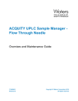 ACQUITY UPLC Sample Manager Flow Through Needle Overview and Maintenance Guide 715005051 Revision D Copyright © Waters Corporation 2019 All rights reserved General information Copyright notice © 2010 – 2019 WATERS CORPORATION. PRINTED IN THE UNITED STATES OF AMERICA AND IN IRELAND. ALL RIGHTS RESERVED. THIS DOCUMENT OR PARTS THEREOF MAY NOT BE REPRODUCED IN ANY FORM WITHOUT THE WRITTEN PERMISSION OF THE PUBLISHER. The information in this document is subject to change without notice and should not be construed as a commitment by Waters Corporation. Waters Corporation assumes no responsibility for any errors that may appear in this document. This document is believed to be complete and accurate at the time of publication. In no event shall Waters Corporation be liable for incidental or consequential damages in connection with, or arising from, its use. For the most recent revision of this document, consult the Waters website (www.waters.com). Trademarks ACQUITYTM is a trademark of Waters Corporation. ACQUITY UPLCTM is a trademark of Waters Corporation. EmpowerTM is a trademark of Waters Corporation. MassLynxTM is a trademark of Waters Corporation. THE SCIENCE OF WHAT'S POSSIBLETM is a trademark of Waters Corporation. TORX® is a registered trademark of Acument Intellectual Properties, LLC in the United States or other countries. WatersTM is a trademark of Waters Corporation. Waters Quality PartsTM is a trademark of Waters Corporation. All other trademarks are property of their respective owners. Customer comments Waters’ Customer Experience and Knowledge Management organization invites you to report any errors that you encounter in this document or to suggest ideas for otherwise improving it. Help us June 11, 2019, 715005051 Rev. D Page ii better understand what you expect from our documentation so that we can continuously improve its accuracy and usability. We seriously consider every customer comment we receive. You can reach us at tech_comm@waters.com. Contacting Waters Contact Waters with enhancement requests or technical questions regarding the use, transportation, removal, or disposal of any Waters product. You can reach us via the Internet, telephone, fax, or conventional mail. Waters contact information Contacting medium Information Internet The Waters website includes contact information for Waters locations worldwide. Visit www.waters.com Telephone and fax From the USA or Canada, phone 800-252-4752, or fax 508-872-1990. For other locations worldwide, phone and fax numbers appear in the Waters website. Conventional mail Waters Corporation Global Support Services 34 Maple Street Milford, MA 01757 USA Safety considerations Some reagents and samples used with Waters instruments and devices can pose chemical, biological, or radiological hazards (or any combination thereof). You must know the potentially hazardous effects of all substances you work with. Always follow Good Laboratory Practice (GLP), and consult your organization’s standard operating procedures as well as your local requirements for safety. Safety hazard symbol notice symbol indicates a potential hazard. Consult the documentation for important The information about the hazard and the appropriate measures to prevent and control the hazard. June 11, 2019, 715005051 Rev. D Page iii Considerations specific to the SM-FTN Warning: To avoid electric shock, do not remove protective panels from the device. The components within are not user-serviceable. Warning: To avoid electric shock, observe these precautions: • Use SVT-type power cords in the United States and HAR-type power cords, or better, in Europe. For requirements elsewhere, contact your local Waters distributor. • Inspect the power cords for damage and replace them if necessary. • Power-off and unplug each module before performing any maintenance operation on it. • Connect each module to a common ground. Warning: To avoid spinal and muscular injury, do not attempt to lift a system module without assistance. See also: For safety considerations regarding specific system modules, consult the appropriate information on the user documentation CD. FCC radiation emissions notice Changes or modifications not expressly approved by the party responsible for compliance, could void the user's authority to operate the equipment. This device complies with Part 15 of the FCC Rules. Operation is subject to the following two conditions: (1) this device may not cause harmful interference, and (2) this device must accept any interference received, including interference that may cause undesired operation. Electrical power safety notice Do not position the device so that it is difficult to disconnect the power cord. Equipment misuse notice If equipment is used in a manner not specified by its manufacturer, the protection provided by the equipment may be impaired. Safety advisories Consult the "Safety advisories" appendix in this publication for a comprehensive list of warning advisories and notices. June 11, 2019, 715005051 Rev. D Page iv Operating the device When operating the device, follow standard quality-control (QC) procedures and the guidelines presented in this section. Applicable symbols The following symbols can be present on the device, system, or packaging. Symbol Definition Manufacturer Date of manufacture Confirms that a manufactured product complies with all applicable European Community directives Australia EMC compliant Confirms that a manufactured product complies with all applicable United States and Canadian safety requirements Environmentally friendly use period (China RoHS): indicates the number of years from the date of manufacture until the product, or components within the product, are likely to be discarded or degrade into the environment Consult instructions for use Alternating current Electrical and electronic equipment with this symbol may contain hazardous substances and should not be disposed of as general waste For compliance with the Waste