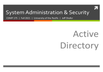 System Administration & Security ì COMP 175 | Fall 2021 | University of the Pacific | Jeff Shafer Active Directory 2 Active Directory System Administration & Security Fall 2021 3 Active Directory System Administration & Security Fall 2021 4 Active Directory ì Organization-wide centralized management for large computer networks ì ì ì ì ì ì User authentication (who are they?) User authorization (what can they do?) User auditing (what did they do?) Specification and enforcement of security policies Software installation, configuration, updates Individual profiles (consistent across all computers) ì Tracks objects in a hierarchical manner ì First released with Windows 2000 Server System Administration & Security Fall 2021 5 Authentication vs Authorization ì Authentication ì Confirm the user identity ì Authorization ì Grant access to specific resources System Administration & Security Fall 2021 6 Active Directory Objects ì Security Principle Object ì Active Directory object that can be authenticated and assigned permissions ì Example: User account, computer account, security group ì Each security principle has ì GUID – 128 bit Globally Unique ID ì SID – Security Identifier System Administration & Security Fall 2021 7 Active Directory Objects: User ì User is part of organization ì Unique identity within the domain ì Authenticated by domain ì Obtains authorization from domain for resources ì Login ì Username & Password? ì Username & Smart Card? System Administration & Security Fall 2021 8 Active Directory Objects: Computer ì Computer is part of organization ì Individual computers, workstations, servers, … ì Unique account within the domain ì Authenticated by domain ì Obtains authorization from domain for resources System Administration & Security Fall 2021 9 Active Directory Objects: Groups ì Groups ì Contains members which can be any valid AD object ì “Domain Admin” ì “Domain Users” ì “CTC Printers” ì All permissions, authorizations, and restrictions applied to the group apply to all members of the group System Administration & Security Fall 2021 10 Active Directory Objects: Organizational Unit ì Organization Unit (OU) ì Contains many objects, computers, groups, and other organization units ì Parent / child relationship ì Any privilege of the parent will be inherited by the child by default ì Intended to mirror organizational structure ì Faculty / Staff / Students? ì HR / Finance / Sales / Engineering / Facilities? ì Seattle office / SF office / NYC office? System Administration & Security Fall 2021 11 Active Directory Objects: Leaf vs Container Leaf Objects Examples: Computer, User, Printer, …. System Administration & Security Container Object Examples: Group, Organization Unit, …. Fall 2021 12 Active Directory Objects: Resources ì Shared Folder ì Printer System Administration & Security Fall 2021 13 Domain Controller ì Domain Controller is a server running the Active Directory Domain Services (AD DS) role ì Responds to security authentication requests ì Responsible for ì Active Directory (AD) ì Group Policy (GP) System Administration & Security Fall 2021 14 Domain Controller DC1 System Administration & Security Replicated for fault tolerance DC2 Fall 2021 15 Login with Domain Controller Domain Computer ? Local Accounts Domain Controller ? Active Directory System Administration & Security (1) Domain computer searches local accounts for matching user (2) Domain computer sends login request to Domain Controller Fall 2021 16 Group Policy Management ì Provides remote management for all domain users and computers ì Group Policy Objects (GPO) contain client settings ì Group policy can be specified for a user, computer, group, or organization unit ì ì Examples ì ì ì ì System Administration & Security Useful for consistent policies across large numbers of users Desktop background? Web browser home page? System security settings? Installed applications? Fall 2021 17 Related Systems ì Active Directory Certificate Services (AD CS) ì Create and manage public keys for organization ì Uses: Files, emails, network (VPN, TLS, IPSec) ì Active Directory Federation Services (AD FS) ì Single Sign-on Service (SSO) ì Use same credentials for resources within organization and at other organizations (e.g. business partners) System Administration & Security Fall 2021 18 Key Technologies ì DNS ì Resource discovery ì Lightweight Directory Access Protocol (LDAP) ì Directory (Index) ì Kerberos ì Authentication System Administration & Security Fall 2021 19 LDAP System Administration & Security ì Fall 2021 20 LDAP System Administration & Security https://www.youtube.com/watch?v=5rEA7vRV3VE Fall 2021 21 Kerberos System Administration & Security ì Fall 2021 22 Cerberus ì Cerberus (Greek: Κέρβερος Kerberos) is a multi- headed dog that guards the gates of the Underworld to prevent the dead from leaving ì Kerberos is named after a three-headed dog because authentication is based on interaction between three systems ì Requesting system (Principal) ì Endpoint destination system ì Kerberos server System Administration & Security Fall 2021 23 Kerberos ì Network authentication protocol for client/server applications using symmetric (or public/private key) cryptography ì ì Authentication Access control ì Single Sign-On (SSO) ì Assumption: Network is insecure – Eve is watching! ì Developed in late 1980’s at MIT as part of Project Athena ì ì System Administration & Security MIT / DEC / IBM project for distributed campus-wide computing environment Last updated in 2005 by IETR – Added AES support in v5 Fall 2021 24 Kerberos ì Cross platform ì ì Widespread application support* ì ì ì ì ì ì ì ì ì System Administration & Security Windows, Linux, *BSD, OS X Windows domains SSH (OpenSSH) IMAP, SMTP (Cyrus, sendmail, postfix) CIFS/SMB (Samba, Windows, Netapp) NFS Database (SQL Server, Postgres) HTTP (Apache, ng