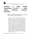International Journal of Innovation, Creativity and Change. www.ijicc.net Volume 15, Issue 2, 2021 Intention to Adopt Mobile Applications Services: A Study Among Pakistani Academic Librarians Mohamad Noorman Masreka, Abid Husseinb, aFaculty of Information Management, Universiti Teknologi MARA, Malaysia, bLibrary Officer, Institute of Strategic Studies Islamabad (ISSI) , Pakistan Not much is really known to what extend academic librarians in Pakistan are interested in adopting and embracing mobile application for enhancing their services and work performance. In addition, little is also known about the factors that may shape or influence their behaviour with regards to mobile application services. Against this background, a study was undertaken with the aim of examining the behavioural intention of adopting mobile application services in the context of academic librarians in Pakistan. A research model was developed based on the Unified Theory of Acceptance and Use of Technology (UTAUT) model. Five constructs, namely performance expectancy, effort expectancy, perceived credibility, facilitating conditions and social influence were hypothesised to have significant relationship with intention to adopt mobile applications. Using a survey research methodology, data was collected from 212 academic librarians in Pakistan. The results revealed that performance expectancy, effort expectancy and facilitating conditions were significant in determining behavioural intention. The findings have contributed significantly to the body of knowledge from several perspectives, namely theoretical, managerial and practical. Keywords: Mobile Application Services, Predictors, Adoption, Academic Librarians 38 International Journal of Innovation, Creativity and Change. www.ijicc.net Volume 15, Issue 2, 2021 Introduction Academic librarians play imperative and diverse roles in the life of the university. According to Dold (2013), academic librarians address all levels of information needs for the university: “its acquisition, its production, its storage, and instruction for its safe and gainful use”. In other words, academic librarians “see themselves as service providers, as partners with the teaching faculty, and as builders of strong systems and collections” (Alsop & Bordonaro, 2007). To shoulder these huge responsibilities, academic librarians need to equip themselves with the tools and technology that will further enhance their work performance and service delivery. In the time and age where mobile applications or apps have become the norm for all individuals of all ranks and professions, librarians with no exceptions are also dragged into adopting or embracing mobile apps that are suitable and appropriate with the nature of their work. Mobile applications or apps consist of software or a set of programs that runs on a mobile device and perform certain tasks for the user. The main advantage of an app is that it allows users to access specific resources or services without having to open a web browser first. Today, there exist many free and commercial apps that are targeted for different audiences, including librarians and information professionals. Studies have shown that the utilisation of apps to support work tasks help improve work productivity. However, not much is really known to what extend academic librarians in Pakistan are interested in adopting and embracing mobile application for enhancing their services and work performance. In addition, little is also known about the factors that may shape or influence their behaviour with regards to mobile application services. Against this background, a study was undertaken with the aim of examining the behavioural intention of adopting mobile application services in the context of academic librarians in Pakistan. Literature Review Today, many businesses and organisations, including libraries have developed their own apps. For libraries, these apps can fall into one of two categories, (i) traditional library services amended to be available with mobile devices and (ii) services created specifically for mobile devices (Liu & Briggs, 2015). Common library services that have been updated to be mobilefriendly include a mobile website (either as a mobile version of the library’s regular site, an app, or both), mobile-friendly interfaces for the library’s catalogue and databases, access to books in electronic format, and information literacy instruction which makes use of mobile devices (Liu & Briggs, 2015). Chang (2013) stated that “library apps can provide users access to the library catalogue, databases, and library guides from the palm of their hand”. In addition, “users can also look up library locations, borrower information, library news, and ways to contact librarians” (Chang, 2013). 39 International Journal of Innovation, Creativity and Change. www.ijicc.net Volume 15, Issue 2, 2021 There are also many free and commercial apps that are targeted at librarians or information professionals for the purposes of supporting their work tasks. According to Mishra et al. (2017), before adopting apps, librarian or information professionals need to fully understand the primary types of mobile apps and their distinct features and functionalities. Knowing the strengths and weaknesses of apps can help decide which apps will fully meet their needs. Hennig (2014) presented a guide for librarians in choosing the appropriate apps for them to improve their services and performance. MastersinLibraryScience.net (2020) listed 45 useful aids that can aid librarians for different purposes (Table 1) Table 1: Mobile Apps for Librarians Purpose Apps Name Better reading Kindle, Nook, Kobo, Free Books, iBooks, Good Reader, Bookviser, Audiobooks, Readu, Freda+ Boosting Box, Outliner, Pages, World Book – This Day in History, iNapkin, Productivity Things 2, LanSchool Teachers Assistant for iOS, History – Maps of the World, Dropbox, Docs Anywhere, Keynote, eClicker Pre