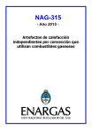 NAG-315 - Año 2015 Artefactos de calefacción independientes por convección que utilizan combustibles gaseosos CONTENIDO Prólogo 4 1 Objeto y campo de aplicación 5 2 Normas para consulta 5 3 Términos y definiciones 7 4 5 3.1 Artefactos de calefacción independientes por convección 7 3.2 Gases 8 3.3 Construcción del artefacto 8 3.4 Control y regulación 11 3.5 Funcionamiento del artefacto 11 Clasificación de los artefactos 13 4.1 Clasificación según la naturaleza de los gases utilizados (categorías) 13 4.2 Clasificación según la forma de evacuación de los productos de la combustión 13 Requisitos de construcción 5.1 15 Generalidades 15 5.1.1 Adaptación a los diferentes gases 15 5.1.2 Materiales y métodos de construcción 15 5.1.3 Facilidad de uso y mantenimiento 16 5.1.4 Conexiones 17 5.1.5 Estanquidad del circuito de gas 17 5.1.6 Estanquidad del circuito de combustión 18 5.1.7 Alimentación de aire comburente y evacuación de los productos de combustión 18 5.1.8 Equipo eléctrico 19 5.1.9 Seguridad de funcionamiento en caso de fluctuación, interrupción y restablecimiento de la energía auxiliar 20 6 5.2 Dispositivos de reglaje, de regulación y de seguridad 20 5.3 Dispositivos de encendido 23 5.4 Dispositivos de control de llama 23 5.5 Quemadores 24 Requisitos de funcionamiento 6.1 Generalidades 24 24 6.2 Estanquidad de los circuitos de gas y de combustión, y evacuación de los productos de la combustión 24 6.3 Consumos caloríficos 25 6.4 Temperaturas de las diferentes partes del artefacto 25 6.5 Encendido, interencendido y estabilidad de llama 26 6.6 Regulador de presión de gas 27 6.7 Combustión 27 6.8 Depósito de hollín (únicamente artefactos con efecto de combustibles ardiendo) 28 NAG-315 Año 2015 1 7 6.9 Sistemas de control de la evacuación de los productos de la combustión 28 6.10 Dispositivo de control de llama 28 6.11 Rendimiento 29 Procedimientos de ensayo 7.1 8 29 Generalidades 29 7.2 Estanquidad del circuito de gas y del circuito de productos de la combustión, y evacuación correcta de los productos de la combustión 30 7.3 Consumos caloríficos 31 7.4 Temperaturas de las diferentes partes del artefacto 34 7.5 Encendido, interencendido y estabilidad de llama 36 7.6 Regulador de presión de gas 39 7.7 Combustión 39 7.8 Depósito de hollín (únicamente artefactos con efectos de combustible ardiendo 44 7.9 Dispositivo de control de la evacuación de los productos de la combustión 44 7.10 Dispositivo de control de llama 44 7.11 Rendimiento 45 7.12 Durabilidad del marcado 48 Marcado e instrucciones 48 8.1 Marcado del artefacto 48 8.2 Instrucciones 49 Anexo A Situaciones nacionales 53 Anexo B Reglas de equivalencias 54 Anexo C (normativo) Procedimientos de ensayos con placa de punto de rocío 55 C.1 Con placa de punto de rocío 55 C.2 Con campana 57 Anexo D (informativo) Composición de la línea de gas 61 Anexo E (informativo) Medios de identificación del tipo de gas utilizado en los diferentes países 62 Anexo F (normativo) Circuitos de encendido de alta tensión 63 Anexo G Equipo para la determinación del índice de ennegrecimiento 65 Anexo H (informativo) Símbolos y abreviaturas 66 Anexo J Cálculo de conversión de NOx 67 Anexo K Condiciones nacionales particulares 68 Anexo L Desviaciones A 69 NAG-315 Año 2015 2 Anexo ZA Capítulos de esta norma relacionados con los requisitos esenciales u otras disposiciones de las directivas UE 70 Anexo AA (normativo) Sonda de temperatura de la superficie (apartado 7.4.1) 71 AA.1 Construcción 71 AA.2 Ensayo de validación 71 Anexo AB Incertidumbre del equipo de medición 73 Anexo AC (normativo) Etiquetado de eficiencia energética 74 AC.1 Objeto 74 AC.2 Requisitos 74 AC.3 Clases de eficiencia energética 74 AC.4 Etiquetas de eficiencia energética 75 AC.5 Muestreo y criterios de verificación y aceptación 78 ANEXO AD (normativo) Cálculo de la eficiencia y estimación de las incertezas 79 AD.1 Protocolo de consumo 79 AD.2 Eficiencia energética del calefactor 79 AD.3 Índice de consumo medio anual 80 AD.4 Estimación de las incertezas en el rendimiento 81 ANEXO AE (informativo) Desarrollo teórico del cálculo de eficiencia y consumo medio anual 82 AE.1 Introducción 82 AE.2 Cálculo del rendimiento 83 AE.2.1 AE.2.2 AE.2.3 AE.3 Combustión Eficiencia según la norma europea Pasaje a la norma NAG Estimación de las incertezas en el rendimiento FIGURAS 83 84 87 88 89 Formulario para observaciones 103 Instrucciones para completar el formulario de observaciones 104 NAG-315 Año 2015 3 PRÓLOGO La Ley 24 076 -Marco Regulatorio de la Actividad del Gas Natural- crea en su Artículo 50 el ENTE NACIONAL REGULADOR DEL GAS (ENARGAS). En el Artículo 52 de la mencionada Ley se fijan las facultades del ENARGAS, entre las cuales se incluye la de dictar reglamentos en materia de seguridad, normas y procedimientos técnicos a los que deben ajustarse todos los sujetos de esta Ley. Asimismo, el Artículo 86 expresa que las normas técnicas contenidas en el clasificador de normas técnicas de GAS DEL ESTADO SOCIEDAD DEL ESTADO (revisión 1991) y sus disposiciones complementarias, mantendrán plena vigencia hasta que el Ente apruebe nuevas normas técnicas, en reemplazo de las vigentes, de conformidad con las facultades que le otorga el Artículo 52, inciso b) de la presente Ley. En tal sentido, esta norma NAG-315 Año 2015 constituye una actualización y reemplazo a la dictada oportunamente por la ex GAS DEL ESTADO SOCIEDAD DEL ESTADO, teniendo en cuenta los nuevos sujetos de la ley, las Resoluciones que el ENARGAS dictó al respecto y el avance tecnológico en la materia. Asimismo, esta norma comprende a los calentadores de ambientes diseñados conforme a la NAG-316, que se integra a la presente. La actualización de esta norma ha sido elaborada por una comisión integrada por personal técnico del Ente Nacional Regulador del Gas, Fabricantes e Importadores de artefactos y accesorios para gas, y Organismos de Certificac