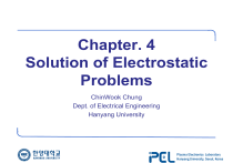 Chapter. 4 Solution of Electrostatic Problems ChinWook Chung Dept. of Electrical Engineering Hanyang University Plasma Electronics Laboratory Hanyang University, Seoul, Korea Summary • Electrostatic cases (, V, E) Charge density, V 1 4 0 V R dv E 2V 0 1 4 0 V Rˆ R2 dV E / 0, E 0 E V Electric Field, E Potential, V V E dl Plasma Electronics Laboratory Hanyang University, Seoul, Korea Electrostatic Boundary Value Problems • Poisson's & Laplace’s eqn. 2V 2V 2V V 2 2 2 x y z In generalized coordinate, 2 2V V 1 h1h2 h3 (Laplacian) h2 h3 V h1h3 V h1h2 V u h u u h u u h u 1 2 2 2 3 3 3 1 1 E V , D= Ε D E V 2V (Poisson Eqn.) 0 2V 0 Laplace's equation Plasma Electronics Laboratory Hanyang University, Seoul, Korea The solutions of Laplace's equation • One dimensional case – V(x) is a function of only one of the three coordinates. 2V 2V 2V 2 2 0 2 x y z 1 V 1 2V 2V r 2 2 2 r r r r z 1 2 V 1 V 1 2V R 2 sin 2 2 2 R R R R sin R sin 2 2 1 d dV 3. 1 d V d 2V 1. 0 2. 2 2 4. r 2 r d r dr dr dx 1 d 2 dV 1 d dV R 5. sin R 2 dR dR R 2 sin d d Plasma Electronics Laboratory Hanyang University, Seoul, Korea Electrostatic Boundary Value Problems • Example 4.1 a) The potential at any point between the plates b) the surface charge densities on the plates d 2V y dy 2 0 dV C1 dy y 0 V y C1 y C2 E1n at y 0, V 0 at y d , V V0 Surface charge density a n a y , sl 0 E V V 0 y d E y a y y 0 a n a y , su 0 E V V a y 0 y d s 0 yd 0V0 d 0V0 d sl su in this case Plasma Electronics Laboratory Hanyang University, Seoul, Korea Electrostatic Boundary Value Problems • Example 4.2 – By solving Poisson’s and Laplace’s equations for V, – Determine the E field both inside and outside a spherical cloud of electrons with a uniform volume charge density, = -0 (where =0 is positive) for 0<R<b and =0 for R>b – Cf. example 3-23 1 d 2 dV R R 2 dR dR 0 E V aR dV dR Plasma Electronics Laboratory Hanyang University, Seoul, Korea Uniqueness Theorem • A solution of Poisson’s equation that satisfies the given boundary conditions is a unique solution. V1 , V2 : two solutions 2 V1 , V2 2 Assume that both V1 and V2 satisfy the same boundary condition on S1 , S 2 , S3 ,...S n Vd V1 V2 2Vd 0 Vd 2Vd 0 (Vd Vd ) Vd 2Vd Vd 2 fA f A A f Plasma Electronics Laboratory Hanyang University, Seoul, Korea Uniqueness Theorem V V a ds S d d n Vd d 2 1 1 S Vd Vd an ds 0 Vd R , Vd R 2 Vd 0 Vd const or 0 Vd 0 on the surfaces Vd 0 everywhere • A unique solution The solution obtained even by intelligent guessing !! Plasma Electronics Laboratory Hanyang University, Seoul, Korea Method of image • Point charge and ground plate Plasma Electronics Laboratory Hanyang University, Seoul, Korea Method of image V Q 1 Q 1 4 0 R 4 0 R R x 2 y d z 2 , R x 2 y d z 2 2 2 Plasma Electronics Laboratory Hanyang University, Seoul, Korea Method of image V Ez y 0 y S 0 Ez y 0 Qd 2 x 2 z 2 d 2 Qtotal S 2 rdr Qd 0 0 rdr 2 r d 2 2 2 , x z r 3/ 2 2 3/ 2 Q Plasma Electronics Laboratory Hanyang University, Seoul, Korea Method of image Negatively charged conduction plane s Q Q Q d 2 r 2 d 2 3/ 2 Q • What if the conduction plane is not grounded ? Plasma Electronics Laboratory Hanyang University, Seoul, Korea Method of image • Example 4-3 F1 a y F2 a x F3 Q2 4 0 2d2 2 Q2 4 0 2d1 2 Q2 2 3/ 2 4 0 2d1 2d2 2 a x 2d1 a y 2d2 Plasma Electronics Laboratory Hanyang University, Seoul, Korea Line charge & line images • Conducting cylinder and line charges E • l 1 2 0 r Potential from a line charge (r0 = reference point) l r0 V Er dr ln r 2 0 r r r l V? 0 Plasma Electronics Laboratory Hanyang University, Seoul, Korea Line charge & line images Two line charges V l r ln 0 2 0 r Finding equipotential surfaces VM l r r r ln 0 l ln 0 l ln i 20 r 20 ri 20 r Equipotential surface ri /r =const. PM OPi OM i PM OM OP ri di a a2 const. di r a d d Plasma Electronics Laboratory Hanyang University, Seoul, Korea Two wire transmission line • Example 4-4 – Capacitance ? C = Q / V V= 220 Volts V=0 D Plasma Electronics Laboratory Hanyang University, Seoul, Korea Two wire transmission line V2 C l a a ln , V1 l ln 2 0 d 2 0 d l 0 V1 V2 ln d / a a2 1 d D di D d D D 2 4a 2 d 2 C 0 ln D / 2a D / 2a 0 D 1, C 2a ln D / a 2 1 0 ln x x 2 1 cosh 1 x cosh D / 2a 1 F/m Plasma Electronics Laboratory Hanyang University, Seoul, Korea Point charge & conducting sphere • Example 4-5 P – OMQ, OMP : similar triangles a di d a 1 Q Qi 0 4 0 r ri r Q a i i Qi Q r Q d VM Plasma Electronics Laboratory Hanyang University, Seoul, Korea Point charge & conducting sphere • Example 4-5 P VM r a, , 1 Q Qi 4 0 r ri , r a 2 d 2 2ad cos , ri a 2 d i2 2ad i cos For grounded sphere Qi 1 Q V a, , 4 0 a 2 d 2 2ad cos a 2 d i2 2ad i cos V a, 0 0, V a, 0 0 a2 a di , Qi Q d d Plasma Electronics Laboratory Hanyang University, Seoul, Korea Point charge & conducting sphere • Example 4-5 Q 1 a 1 V R, , 4 0 RQ d RQi RQ R 2 d 2 2 Rd cos , 2 a2 a2 2 RQi R 2 R cos d d Electric field V R Charge density ER R, s 0 ER a, Q d 2 a2 4 a a 2 d 2 2ad cos 3/ 2 Total induced charge on the sphere Qind s ds 2 0 S 0 a d s a 2 sin d d Q Qi Plasma Electronics Laboratory Hanyang University, Seoul, Korea Point charge & conducting sphere When V a, , V0 , additional image charge is required Qi V0 Qi 4 0 aV0 4 0 a Qi V=V0 additional image charge Electric field profile Plasma Electronics Laboratory Hanyang University, Seoul, Korea Charged Sphere and conducting plane • 4 - 4.4 2 Q Q0 Q1 Q2 ... Q0 1 .... 2 1 a 2c V0 Q0 4 0 a , C Q 2 4 0 a 1 ... 2 V0 1 Plasma Electronics Laboratory Hanyang University, Seoul, Korea Electrostatic Boundary Value Problems • Laplace’s equation in cylindrical coordinates 1 V 1 2V 2V r 2 2 2 0 r r r r z • Cylindrical symmetry and the lengthwise dimension is very large 2V 2V 0, 2 0 2 z 1 dV r r dr dr • 0 V r C1 ln r C2 If the problem is such that electric potential changes only in the circumferential direction and not in r- and z-directions, 1 r2 d 2V 2 d 0 V K1 K 2 Plasma Electronics Laboratory Hanyang University, 