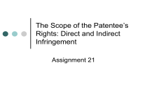 The Scope of the Patentee’s Rights: Direct and Indirect Infringement Assignment 21 Introduction 35 U.S.C. 271 § (a) gives the patentee the right to exclude others from making, selling, offering for sale in the U.S., or importing the patented invention into the U.S. Patent scope First question: What does a patent claim mean? Process called claim construction is used to assess meaning of claim terms Claim Construction Example (U.S. Patent No. 6,035,954): 1. A method of operating a video game including a game character controlled by a player, the method comprising:(a) setting a sanity level of the game character; (b) modifying the sanity level of the game, character during game play according to occurrences in the game, wherein a modifying amount is determined based on a character reaction and an amount of character preparation; and (c) controlling game play according to the sanity level of the game character, game play being controlled at least by varying game effects according to the game character sanity level. Claim Construction: What is sanity? How do you determine what those phrases mean? Claims themselves Patent specification Patent prosecution (file history) Extrinsic evidence Claim construction: first step The words of a claim are generally given their ordinary and customary meaning as one of ordinary skill in the art would understand them. How is the phrase used in the claim itself? How is it used in other claims? Differences among claims can also be a useful guide in understanding the meaning of particular claim terms. Claim construction: first step Here, other claims could say, “where sanity level is. . .” or “examples of sanity levels include. . .” Here, they are not of any particular assistance. Claim construction: Specification Claims must be read in the context of the rest of the patent. This is the single best guide to the meaning of disputed term or phrase. Sometimes patents offer definitions which courts often latch onto. Claim construction: Specification “The instant invention uses the concept of player ‘sanity’ as a condition which is monitored and used during gameplay. In other words, in accordance with the instant invention, the game is programmed such that the sanity of the player or character is effected during gameplay as a result of occurrences in the game and/or by the decisions made by the player during gameplay.” Claim construction: Specification “. . .if the player presses on without resting or without the proper preparation, he or she may lose all sanity. . . The effects could range from something as simple as being stunned temporarily all the way to extreme shell shock.” Visual and auditory hallucinations, heart rate increases may be impacted by “sanity” Claim construction: Prosecution history The prosecution history is the complete record of proceedings before the USPTO. It includes arguments offered by the applicant, as well as cited prior art. Applicant may say, “By ‘sanity level’ we mean . . .” Claim construction: Extrinsic evidence All evidence external to the patent and prosecution history is extrinsic evidence. It includes expert testimony, dictionaries, treatises, etc. Extrinsic evidence is less significant than the intrinsic record. They are particularly useful in determining what one of skill in the art would have known Fromson v. Advance Offset Plate, Inc. Two steps to determine literal patent infringement: (1) the claims are interpreted; and (2) the claims are compared to the accused device. Invention: a process for making a lithograph. Fromson v. Advance Offset Plate, Inc. Facts: Patentee discovered that anodized aluminum was a better material for making lithographic plates than earlier materials. One reason was it gave lithographers greater choice of chemicals to use. The applicant didn’t know what was occurring when new chemicals were put on the anodized aluminum plate, he used the word “reaction.” In reality, no chemical reaction occurred. Since the alleged infringer was not using a chemical reaction in its anodized aluminum lithography process, it argued that all of the elements in the claim were not present in its invention and there could be no infringement. Fromson v. Advance Offset Plate, Inc. The court focused on what the word “reaction” meant. If the word “reaction” has a plain meaning, the courts accept it. If it is ambiguous, will accept extrinsic evidence and expert testimony. Fromson v. Advance Offset Plate, Inc. Court held “reaction” does not mean chemical reaction Instead, it held “the treatment of a metal substrate with an aqueous solution to yield a layer, regardless of the chemical structure of the layer or the proper label for the phenomena that produced it.” remanded to district court apply this new construction in infringement analysis. Infringement Each and every element must be present in the accused device or product for direct infringement to be found. If even one is missing, then the claims are not infringed. Infringement 1. Example: An apparatus permitting seating of a person, comprising: a horizontal surface held at a height from of three feet from the floor; and four vertical legs of equal height that support the horizontal surface at that height. Infringement Infringement Infringement Infringement Infringement Infringement: DOE Doctrine of equivalents expands the scope of the patent from their literal meaning to capture situations where an accused device is an equivalent to the claimed element. Graver Tank v. Linde Air Products Co. Doctrine of equivalents expands the scope of the patent. Test looks to purpose, quality, and function of the changed elements and asks “whether persons reasonably skilled in the art would have known of the interchangability.” Patent claimed a flux made of alkaline earth metal silicate and calcium fluoride combination. Graver Tank v. Linde Air Products Co. Alkaline earth metal – family of elements including magnesium. Patentee