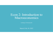 Econ 2: Introduction to Macroeconomics Lint Barrage, UCSB, Spring 2022 March 28 & 30, 2022 Plan 1. Introductions 2. Syllabus Review 3. Intro to Macroeconomics: Defining and Measuring Macroeconomic Aggregates (Chapter 5) Introductions: Instructor • Prof. Lint Barrage • Ph.D. in Economics from Yale University • • Specialization: Intersection of macroeconomics, energy/environmental systems, public finance E.g.: Economic growth, fiscal impacts of natural disasters, shale gas revolution, climate change/policy, etc. • Before UCSB, taught at: • Brown University • University of Maryland • I became an economist because I wanted to better understand and contribute to public policy. • Economics provides amazing opportunities to speak to decision‐makers! • E.g., Congressional Budget Office, Federal Reserve, G20, IMF, World Bank, etc. What are your interests? TAs Ravi Vora Sonal Barve Richard Uhrig Yihong Liu Camila Paleo Annika Ziegler Reetika Sindhi Fatiq Nadeem Plan 1. Introductions 2. Syllabus Review 3. Intro to Macroeconomics: Defining and Measuring Macroeconomic Aggregates (Chapter 5) Plan 1. Introductions 2. Syllabus Review 3. Intro to Macroeconomics: Defining and Measuring Macroeconomic Aggregates (Chapter 5) Intro to Macroeconomics – Spring 2022 Learning Objectives 1. Macroeconomic Questions 2. National Income Accounts: Production = Expenditure = Income 3. What is – and isn’t – measured by GDP 4. What is inflation? Real vs. Nominal GDP Macroeconomics “Macroeconomics is the study of economic aggregates and economy‐wide phenomena like the annual growth rate of a country’s total economic output or the annual percentage increase in the total cost of living.” Macroeconomic Questions‐ Traditional • What is a country’s total or per capita output? • Why are some countries rich and others poor? • What causes economic growth (in the short‐run and long‐run)? • What causes recessions (= two straight quarters in which aggregate income falls)? • What drives unemployment? • What drives inflation? • What are the effects of fiscal policy (e.g., taxes, stimulus)? • What are the effects of monetary policy (i.e., Central Bank activity)? • What role does the financial system play in affecting the real economy? Macroeconomic Questions United States: Annual per capita income $65,000 (2019) Mali: Annual per capita income: $890 (2019) “Once you start thinking about [economic] growth, it’s hard to think about anything else.” ~ Robert Lucas, Nobel Prize‐winning economist Macroeconomic Questions‐ New* • Modern macroeconomics considers an even broader set of questions – examples: • How will climate change affect the economy? How can we balance the costs and benefits of reducing greenhouse gas emissions? (Nordhaus, 1975,…,2017) • What are the economic benefits of (reducing) discrimination barriers against women and minorities in occupational choice (i.e., better talent allocation)? (Hsieh et al., 2019) • How do public investments in early childhood education programs affect adult wages, income mobility, and the macroeconomy? (Daruich, 2018) • How does the criminal justice system affect human capital accumulation, employment, inequality, and the macroeconomy? (Guler and Michaud, 2018) • How is income growth distributed across income groups? Who benefits how much from aggregate growth? (Piketty, Saez, and Zucman, 2018) New Macro: Climate Change* • William D. Nordhaus: Awarded Nobel Prize for ““integrating climate change into long‐ run macroeconomic analysis” • Climate change affects entire world Definitely a “macro” issue • Has been calling for climate policy since 1970s • Nordhaus’ (and others’) climate‐macroeconomic models used to quantify the “social cost of carbon” emissions by U.S. and other governments • Carbon prices used in climate policy around the world Map Source: World Bank (2021) New Macro: Reducing Discrimination* • Hsieh, Hurst, Jones, and Klenow (2019) estimate that the improvement in talent allocation to jobs due to reduced discrimination against women and minorities accounted for 40% of U.S. GDP growth since the 1960s Figures source: Hsieh et al. (2019) Measuring the Aggregate Economy • In order to answer any questions about the aggregate economy, we first have to be able to measure it! • 20th Century saw development of measurement methods: • National income accounts: A framework to measure the level of aggregate economic activity in a country • National Income and Product Accounts (NIPA): The United States’ system of national income accounts National Income Accounts Aggregate economic activity in a country can be measured in three different ways: • The production approach • The expenditure approach • The income approach • We’ll first illustrate each approach using a toy example and then talk about GDP The Production Approach • Idea: Sum up the market value of the final goods and services produced in a year • Toy example: Appleville is a small country with one employer, Apple Farms, which produces 10 million apples a year. The market price of an apple is $2. • All of Appleville’s citizens are workers in the farm. • Apple Farms owns its land and machines so only needs to hire workers. The Production Approach • To determine the market value of production, we multiply the quantity of apples produced by the market price of each apple: Production = (10 million apples) × ($2.00 / apple) = $20 million The Expenditure Approach • Idea: Sum up the sales of apples to households: • Expenditure = (10 million apples) × ($2.00 / apples) = $20 million The Income Approach • Idea: Sum up income payments to labor (workers) and to capital (machines, land): • Apple Farm generates $20 million in revenue, pays $X to its workers, and keeps ($20 million ‐ $X) for its owners. So, total income for its workers and owners is: Income = $X + ($20 million ‒ $X) = $20 mi