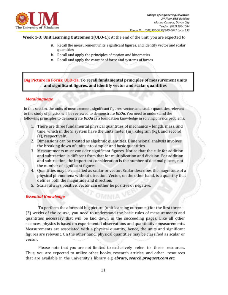 College of Engineering Education 2nd Floor, B&E Building Matina Campus, Davao City Telefax: (082) 296-1084 Phone No.: (082)300-5456/300-0647 Local 133 Week 1-3: Unit Learning Outcomes 1(ULO-1): At the end of the unit, you are expected to a. Recall the measurement units, significant figures, and identify vector and scalar quantities b. Recall and apply the principles of motion and kinematics c. Recall and apply the concept of force and systems of forces Big Picture in Focus: ULO-1a. To recall fundamental principles of measurement units and significant figures, and identify vector and scalar quantities Metalanguage In this section, the units of measurement, significant figures, vector, and scalar quantities relevant to the study of physics will be reviewed to demonstrate ULOa. You need to understand the following principles to demonstrate ULOa as a foundation knowledge in solving physics problems. 1. There are three fundamental physical quantities of mechanics – length, mass, and time, which in the SI system have the units meter (m), kilogram (kg), and second (s), respectively. 2. Dimensions can be treated as algebraic quantities. Dimensional analysis involves the breaking down of units into simpler and basic quantities. 3. Measurements must consider significant figures. Notice that the rule for addition and subtraction is different from that for multiplication and division. For addition and subtraction, the important consideration is the number of decimal places, not the number of significant figures. 4. Quantities may be classified as scalar or vector. Scalar describes the magnitude of a physical phenomena without direction. Vector, on the other hand, is a quantity that defines both the magnitude and direction. 5. Scalar always positive, vector can either be positive or negative. Essential Knowledge To perform the aforesaid big picture (unit learning outcomes) for the first three (3) weeks of the course, you need to understand the basic rules of measurements and quantities necessary that will be laid down in the succeeding pages. Like all other sciences, physics is based on experimental observations and quantitative measurements. Measurements are associated with a physical quantity, hence, the units and significant figures are relevant. On the other hand, physical quantities may be classified as scalar or vector. Please note that you are not limited to exclusively refer to these resources. Thus, you are expected to utilize other books, research articles, and other resources that are available in the university’s library e.g. ebrary, search.proquest.com etc. 11 College of Engineering Education 2nd Floor, B&E Building Matina Campus, Davao City Telefax: (082) 296-1084 Phone No.: (082)300-5456/300-0647 Local 133 Keywords Length Mass time SI unit Unit prefixes English Unit Significant Figures Scalar Vector Vector algebra Unit vector Units of Measurement Measurements are done to describe natural phenomena where each measurement is associated with a physical quantity. In mechanics, there are three fundamental quantities such as length, mass, and time – the building blocks of all other quantities. In measurement, a standard must be defined. In 1960, SI (Système International) was set as a standard for fundamental quantities of science, also called the metric system. Its standard units of measure are meter, kilogram, and seconds, known as mks. Length Length is defined as the distance between two points in space. The history of unit length started in 1120 when the king of England decreed that the standard length in his country is as long as the distance from the tip of his nose to the end of his outstretched arm, he called this unit as yard. Similarly, a foot is equivalent to the length of the royal foot of King Louis XIV. However, none of these became constant as it keeps on changing every time a new king takes the throne. Later until 1799, the standard for length became meter (m) which is equivalent to one ten-millionth of the distance from the equator of the North Pole alone one particular longitudinal line passes through Paris. However, the length of a meter was continuously redefined by expert bodies over history. Finally, in October 1983, the meter was defined as the distance traveled by light in vacuum during a time of 1/299 792 458 second. Table 1.1 lists approximate values of some measured lengths relevant to physics. Table 1.1 Approximate Values of Some Measured Lengths One light-year Mean orbit radius of the Earth about the Sun Mean distance from the Earth to the Moon Distance from the equator to the North Pole Mean radius of the Earth Diameter of a hydrogen atom Diameter of an atomic nucleus Diameter of a proton Length (m) 9.46 x1015 1.50 x1011 3.84 x108 1.00 x 107 6.37 x106 ≈10x -10 ≈10x -14 ≈10x -15 Mass In 1887, the SI standard unit for mass was established and called kilogram (kg). One kilogram is defined as the mass of a specific platinum–iridium alloy cylinder kept at the 12 College of Engineering Education 2nd Floor, B&E Building Matina Campus, Davao City Telefax: (082) 296-1084 Phone No.: (082)300-5456/300-0647 Local 133 International Bureau of Weights and Measures at Sèvres, France. Table 1.2 shows some approximate masses of various objects relevant to physics. Table 1.2 Approximate Values of Some Measured Masses Sun Mass (kg) 1.99 x1030 Earth Moon 5.98 x1024 7.36 x1022 Hydrogen atom Electron 1.67 x10-27 9.11 x10-31 Time The SI standard unit for time is second (sec) measured from the period of vibration of radiation from the cesium-133 atom. Other SI standard units are kelvin (K) (read as Kelvin and not degree Kelvin) for temperature, ampere (A) for electric current, (Candela, cd) for luminous intensity, and (mole) amount of substance. SI Unit Prefixes A unit prefix precedes a basic unit to indicate a multiple or fraction of the unit. It denotes multipliers of the basic units based on various powers of ten. Table 1.3 is a list of the various powers of ten and t
