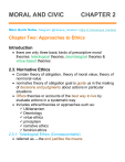 MORAL AND CIVIC CHAPTER 2 More Quick Notes, Telegram: @campus_handout / https://t.me/campus_handout Chapter Two: Approaches to Ethics Introduction • there are only three basic kinds of prescriptive moral theories: teleological theories, deontological theories & virtue-based theories 2.3. Normative Ethics • Contain theory of obligation, theory of moral value, theory of nonmoral value • normative theory of obligation goal is guide us in the making of decisions and judgments about actions in particular situations • Offers theories or accounts of the best way to live by evaluate actions in a systematic way • Includes ethical theories or approaches such as: ✓ Utilitarianism ✓ Deontology ✓ virtue ethics ✓ principlism ✓ narrative ethics ✓ feminist ethics 2.3.1. Teleological Ethics (Consequentialist) • referred as ―the end justifies the means • stress that the consequences of an action determines the morality or immorality of a given action • action is judged as right or wrong, moral or immoral depending on what happens because of it ➢ teleological theory ▪ the basic or ultimate criterion or standard of what is morally right, wrong, obligatory, etc., is the non-moral value that is brought into being ▪ an act is right if and only if it or the rule under which it falls produces, will probably produce, or is intended to produce at least as great a balance of good over evil ( comparative amount of good produced ) ▪ the moral quality or value of actions, persons, or traits of character, is dependent on the comparative nonmoral value of what they bring about or try to bring about ▪ the morally good dependent on the nonmorally good ▪ In order to know whether something is right, ought to be done, or is morally good, one must first know what is good in the nonmoral sense and whether the thing in question promotes or is intended to promote what is good in this sense. ▪ Teleologists have often been: ❖ Hedonists - identifying the good with pleasure and evil with pain, and concluding that the right course or rule of action is that which produces at least as great a balance of pleasure over pain as any alternative would ▪ there is one and only one basic or ultimate rightmaking characteristic, namely, the comparative value 2 (nonmoral) of what is, probably will be, or is intended to be brought into being ▪ Teleologists differ on the question of whose good it is that one ought to try to promote: 1. Ethical egoism ✓ one is always to do what will promote his own greatest good ✓ an act or rule of action is right if and only if it promotes at least as great a balance of good over evil for him ✓ This view was held by Epicurus, Hobbes, and Nietzsche 2. Ethical universalism/ utilitarianism ✓ the ultimate end is the greatest general good ✓ an act or rule of action is right if and only if it is, or probably is, conducive to at least as great a balance of good over evil in the universe as a whole as any alternative would be ❖ utilitarians Jeremy Bentham and John Stuart Mill are hedonists, but some utilitarians are not hedonists, for example, G. E. Moore and Hastings Rashdall, and so have been called "Ideal" utilitarians ❖ It would also be possible, of course, to adopt teleological theories intermediate between ethical egoism and utilitarianism ❖ pure ethical altruist might even contend that the right act or rule is the one that most promotes the good of other people ➢ Deontological theories 3 ▪ deny what teleological theories affirm ▪ principle of maximizing the balance of good over evil, no matter for whom, is either not a moral criterion or standard at all, or, at least, it is not the only basic or ultimate one ▪ assert that there are other considerations that may make an action or rule right or obligatory besides the goodness or badness of its consequences -- certain features of the act itself other than the value it brings into existence ▪ example: the fact that it keeps a promise, is just, or is commanded by God or by the state 2.3.2. Egoism: Ethical and psychological Egoism 1) Ethical Egoism • focus on the consequences of actions because believe that those consequences justify actions • Although theory is indeed Consequentialist, it does not qualify as utilitarian, because it doesn’t have the common good as its ultimate end • It is a normative theory about how we ought to behave that advocates egoism as a moral rule ➢ The theory implies that we ought to be ✓ Selfish ✓ self-interested ➢ Example, case: Good Samaritan stopped to help a man whose car had broken down on the freeway. The man shot and killed the Samaritan, stole his car. 4 • Although most people would admire the Good Samaritan for what he did the ethical egoist would say that, the Samaritan did the wrong thing ➢ For ethical egoism there is only one rule. Look after yourself ➢ Ethical egoist insisted that if you don’t take advantage of a situation, you are foolish ➢ It twisted version of the Golden Rule (Do un to others as you would have them do unto you). ✓ It is rewriting of the Golden Rule, because, obviously, it is not always the case that you will get the same treatment from other that you give to them ✓ The Golden Rule usually emphasizes others, but for the ethical egoist it emphasizes the self ➢ argument for ethical egoism follows immediately from the theory of psychological egoism: If I am psychologically programmed to act only in my own best interest, then I can never be obligated to perform altruistic 1. We all always seek to maximize our own selfinterest (definition of psychological egoism) 2. If one cannot do an act, one has no obligation to do that act 3. Altruistic acts involve putting other people’s interests ahead of our own (definition of altruism) 4. But, altruism contradicts psychological egoism and so is impossible (by premises 1 and 3) 5. Therefore, altruistic acts are never morally obligatory (by premises 2 and 4) 5 ➢ sugges